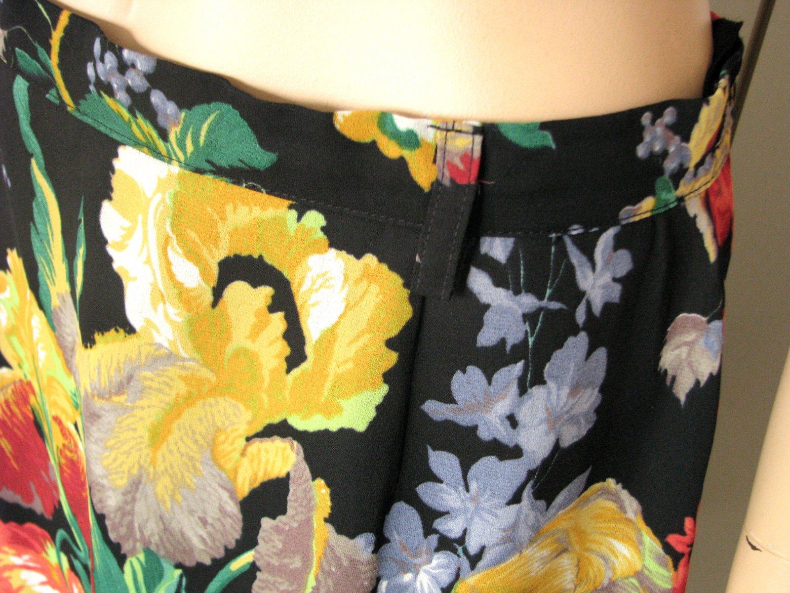 Krásna kvietkovaná pestrofarebná letná sukňa so sýtymi farbami na tmavomodrom podklade. Má podšívku. Výborne zachovalá, bez poškodení. Veľkosť 40. Rozmery sú: šírka v páse 38,5 cm, šírka cca v bokoch 53 cm, dĺžka 66 cm.