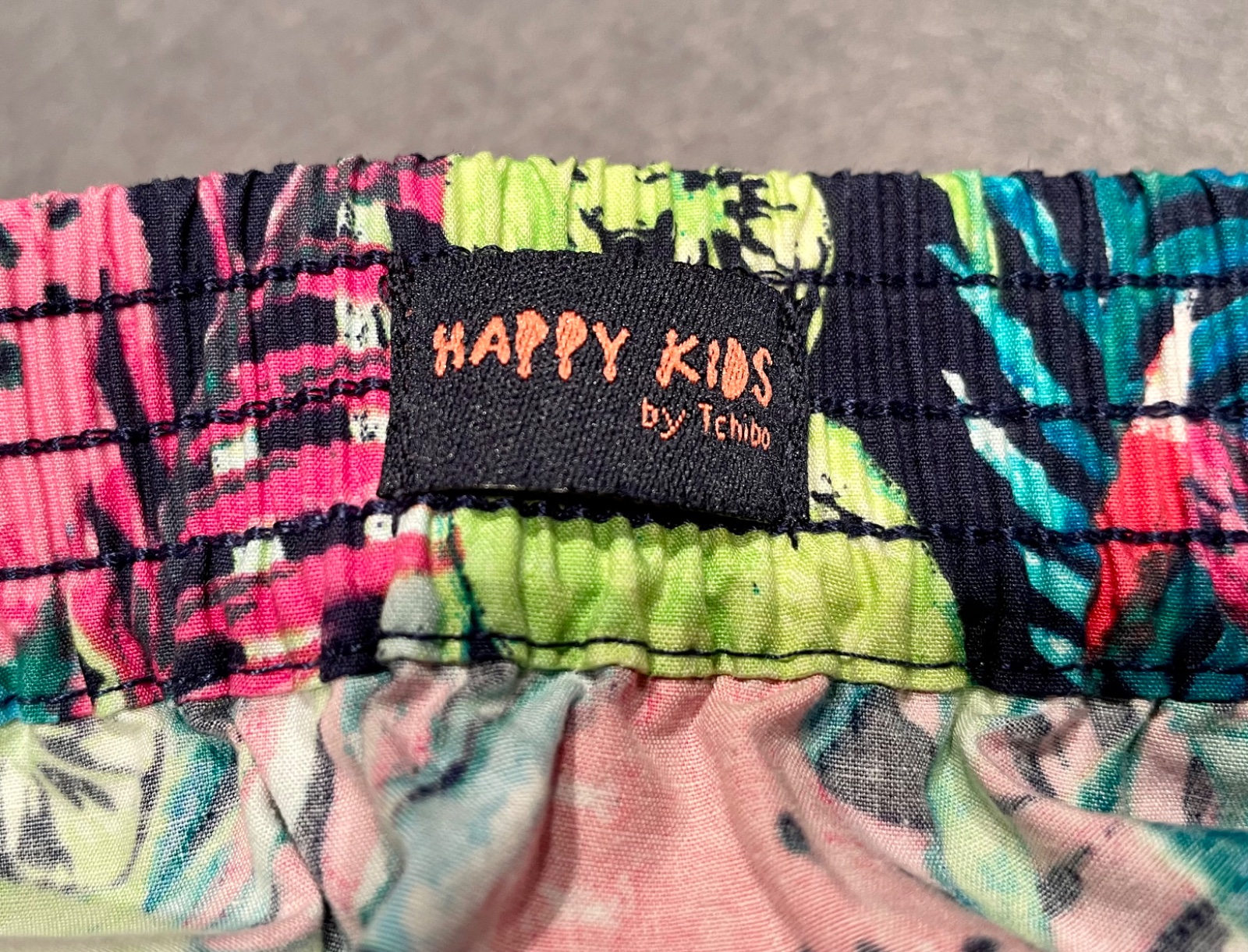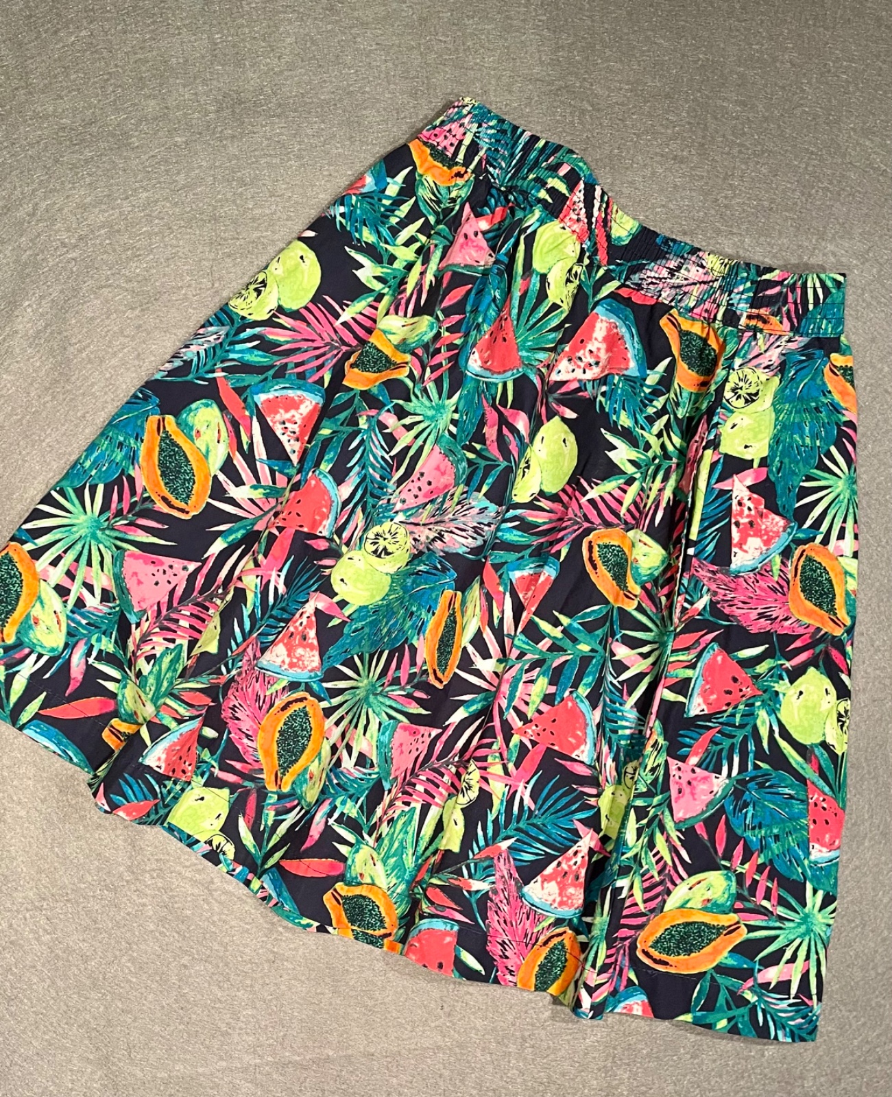 Krásna letná sukienka pre slečnu výšky 146-152 cm, pestrý vzor ovocia a palmových listov, pružný pás na gumu (šírka v kľude 29 cm, dĺžka 44 cm), bočné všité vrecka, vynikajúci stav - ako nová!