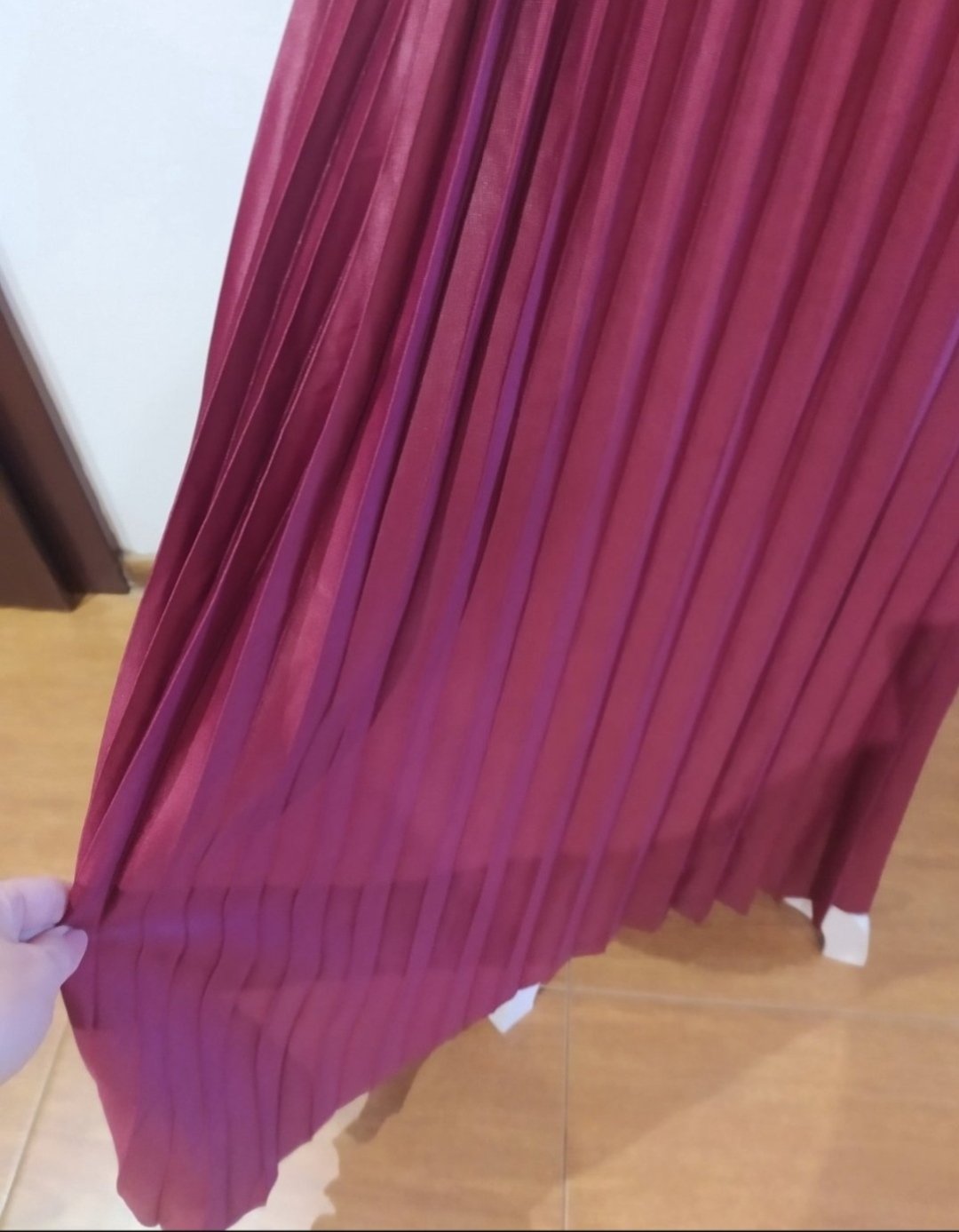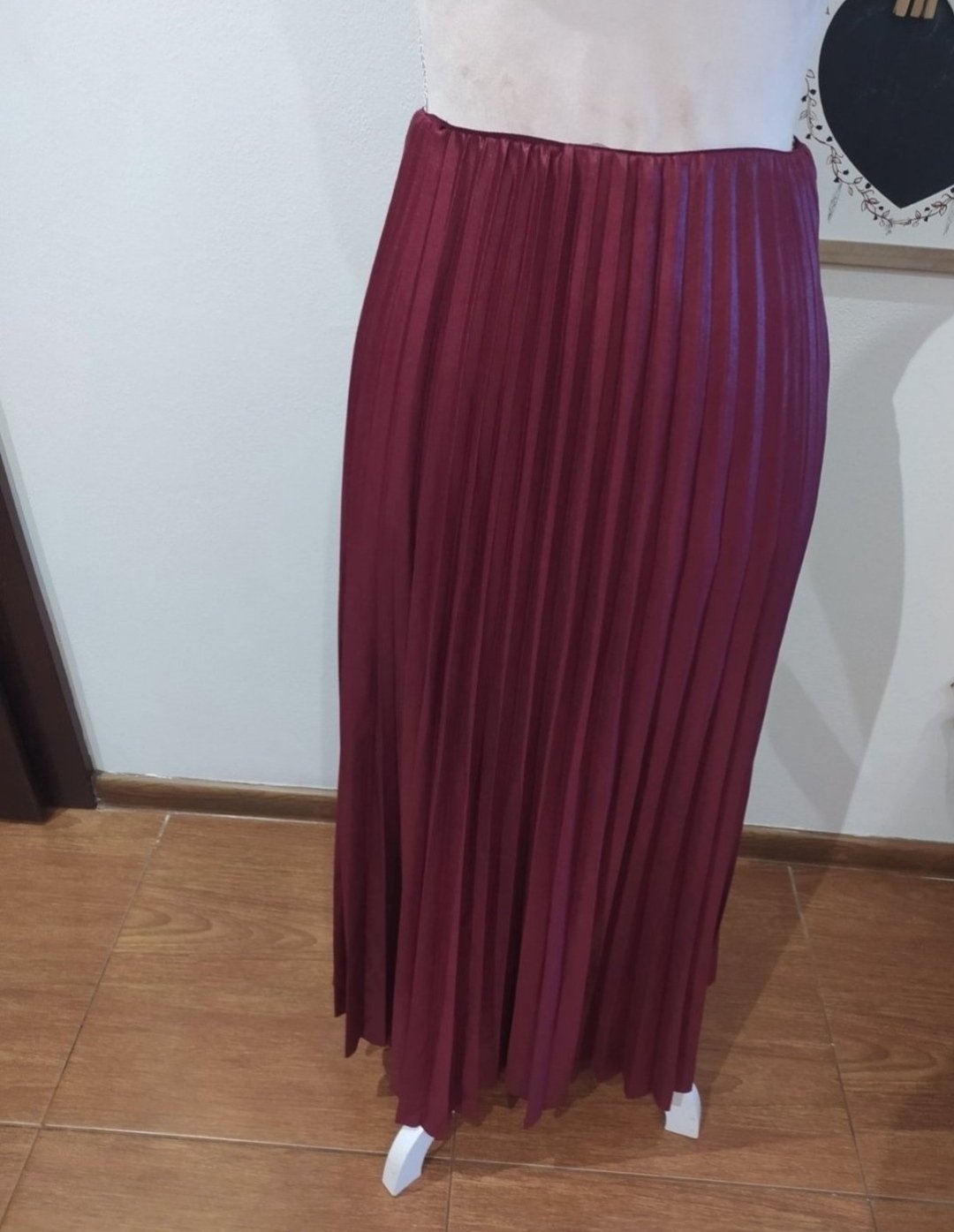 Nádherná plisovana sukňa,sukňa je maxi dĺžky, materiál niečo ako uplet s leskom,pôsobí ako koženková.Vel je uvedená L ,ale zodpovedá S max menšie M