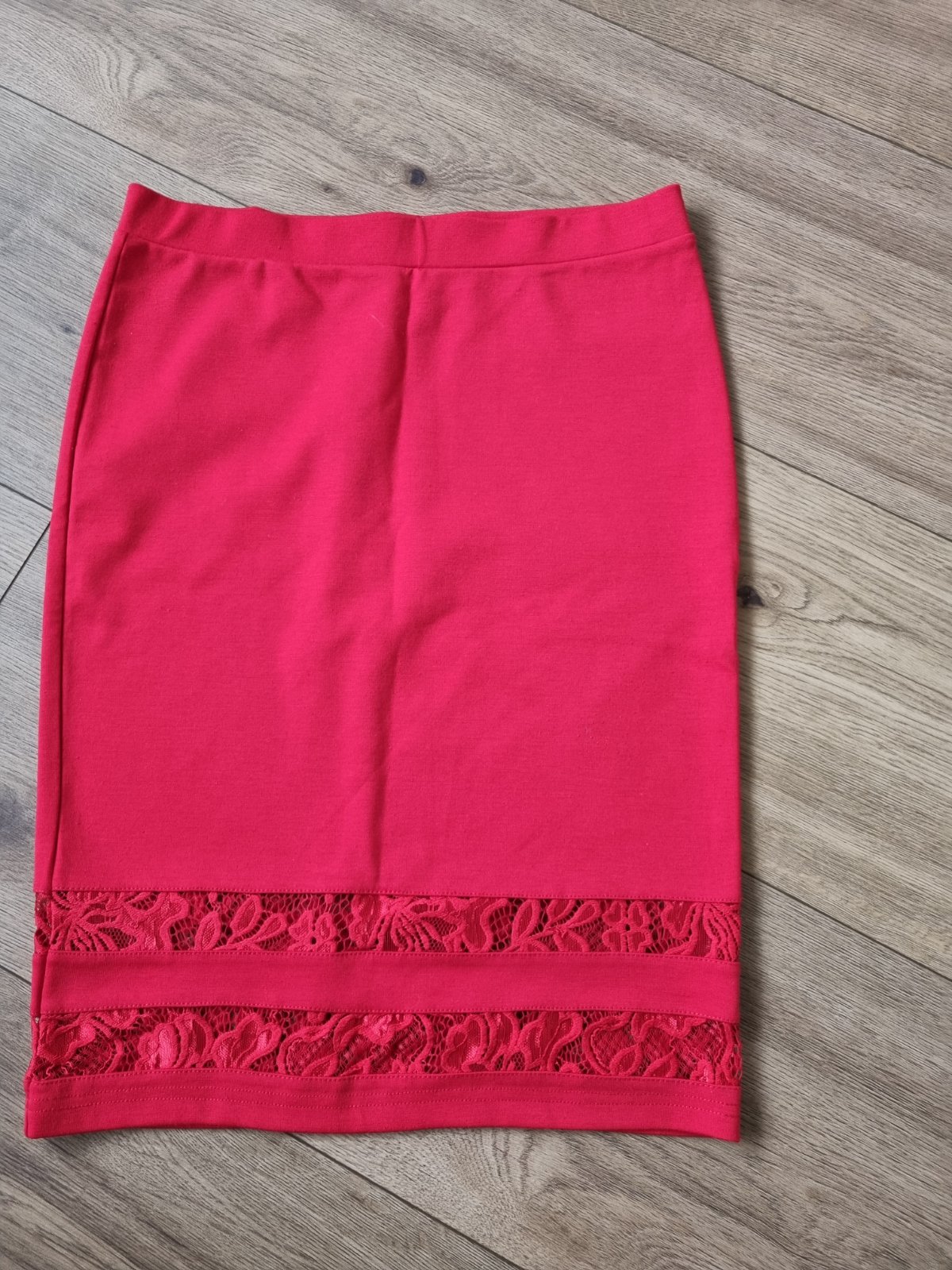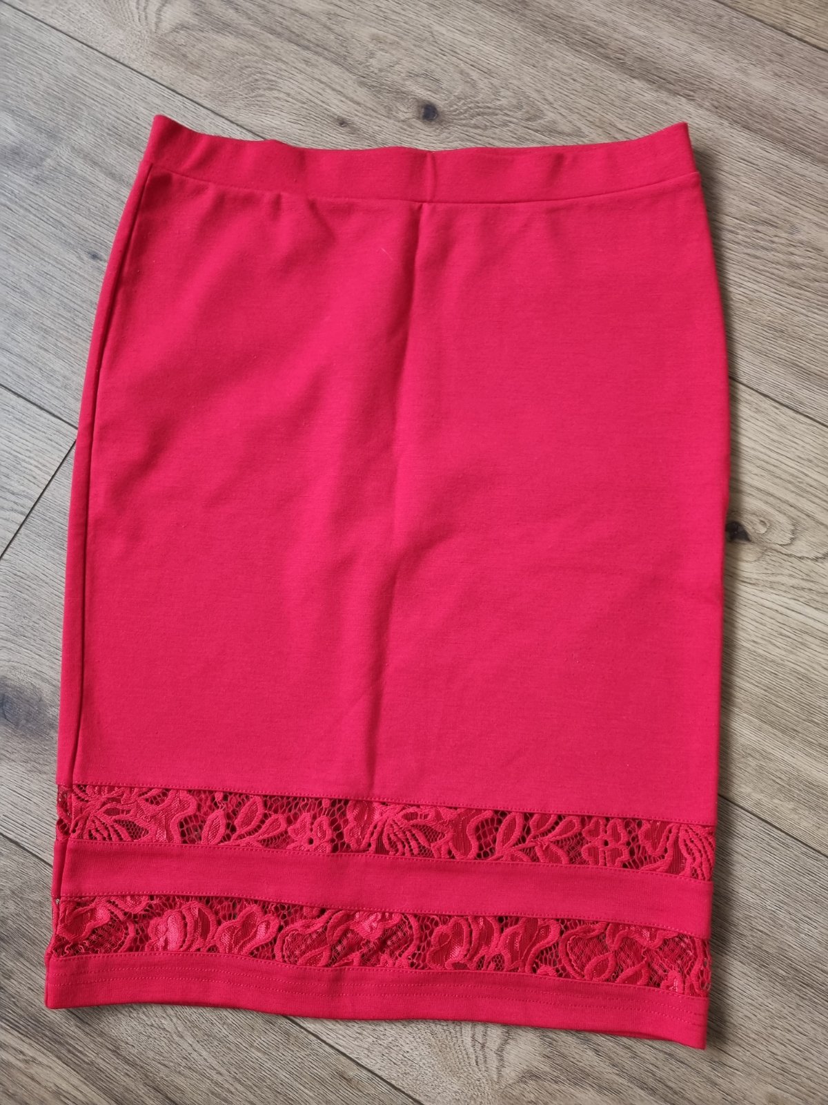 Cervena uplet.suknicka s cipkou...pise 38 sedi na s..pas na gumu v klude 73..boky 44x2..dlzka 57..podsita nie je..v spodnej casti 2 rady vlozenej cipky