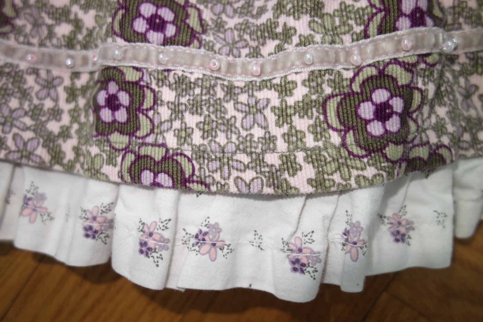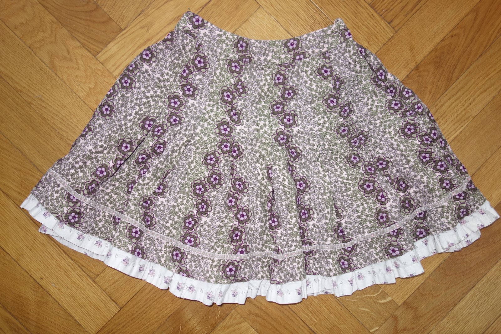 Výborný stav. Krásna sukňa z jemnej menčestrákoviny, s volánom, potlač kvetov, dozdobená korálkami. Zapínanie na zips, pás regulovateľný.