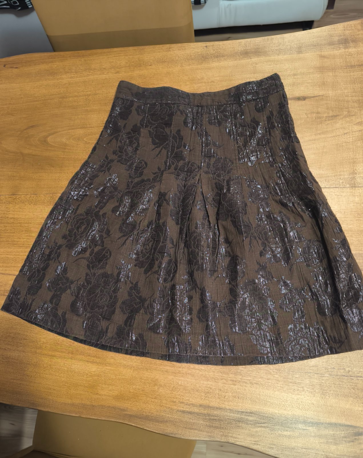 Predám tmavohnedú sukňu so zaujímavými materiálovými a vzorovými volánmi, veľk. S zn. ME & ME, kupovaná v Taliansku, vyrobená v EU, materiál: 62% polyester, 35% rayon, 3% elastan. Cena: zdarma k ...