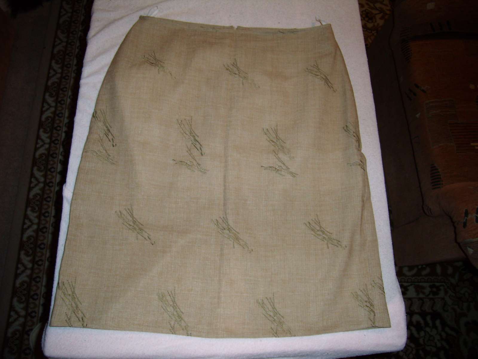 Pohodlna bezova sukna. Vzadu imidzove vracka na zips. Nosena ale v peknom stave. Rozmery pas 42 cm, boky 48 cm, dlzka 45 cm.