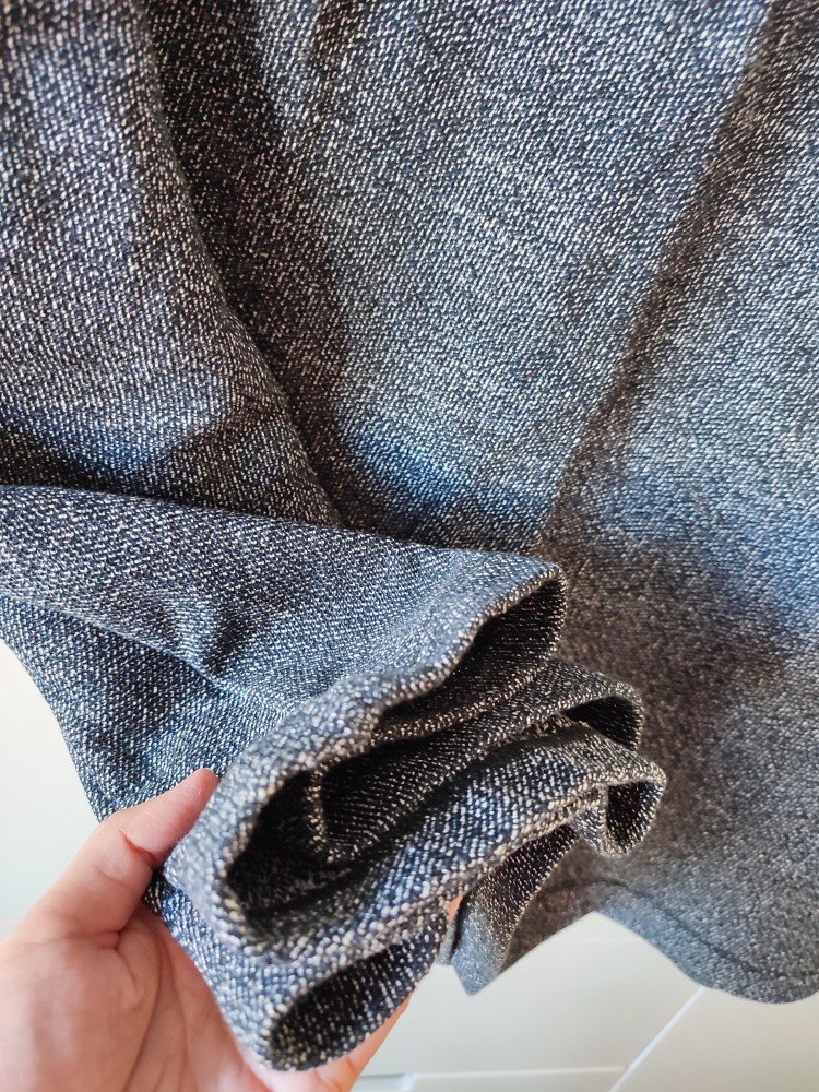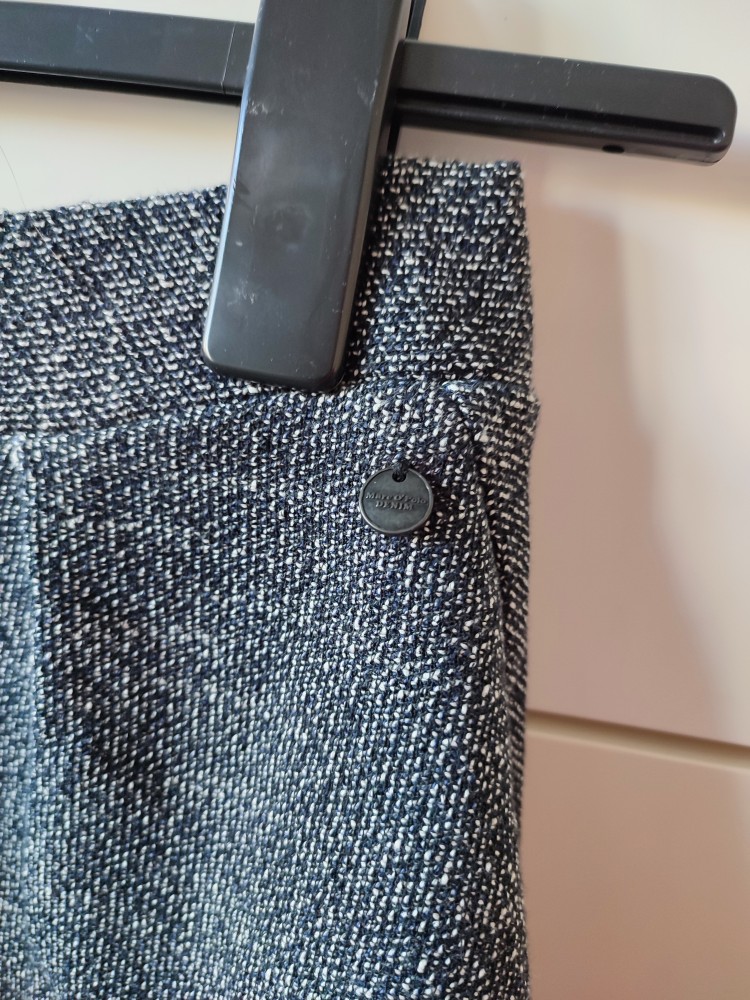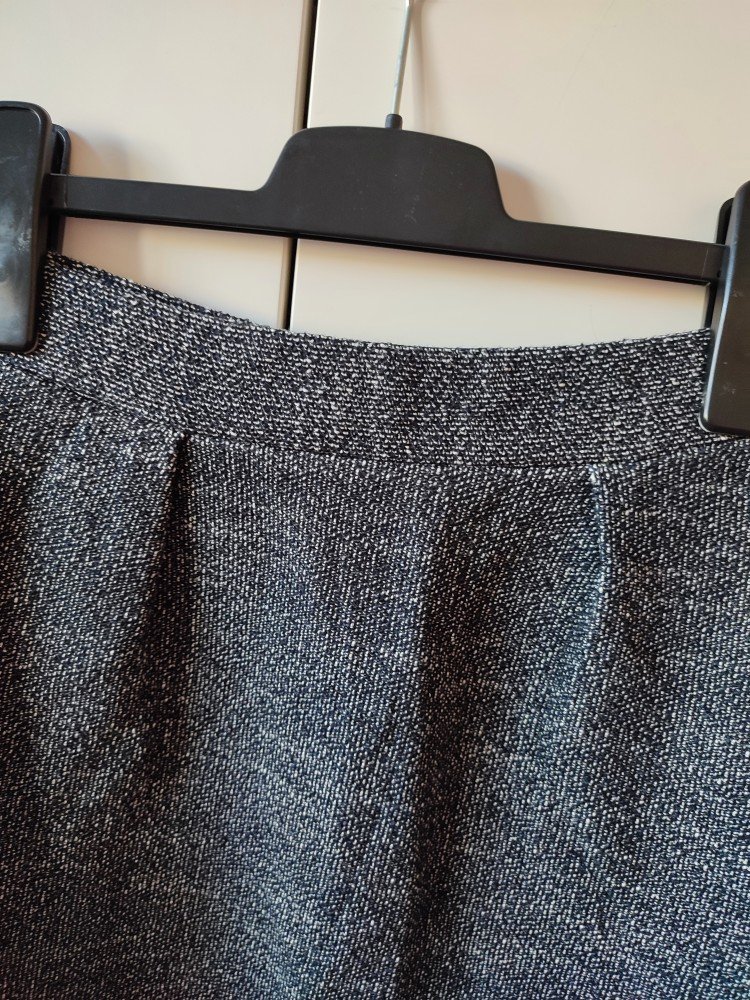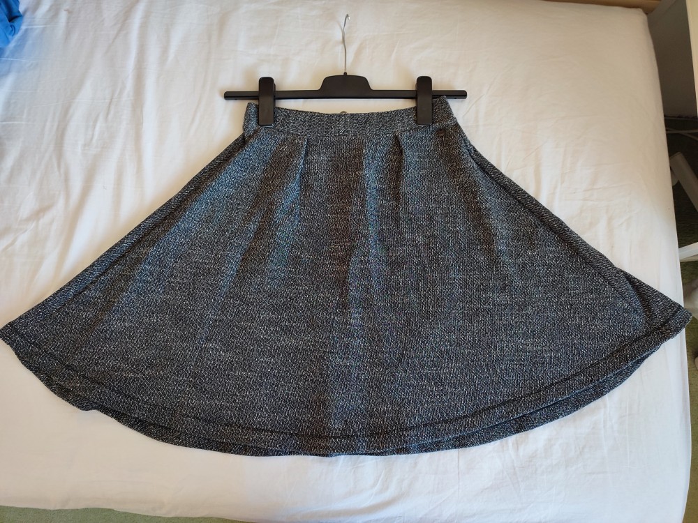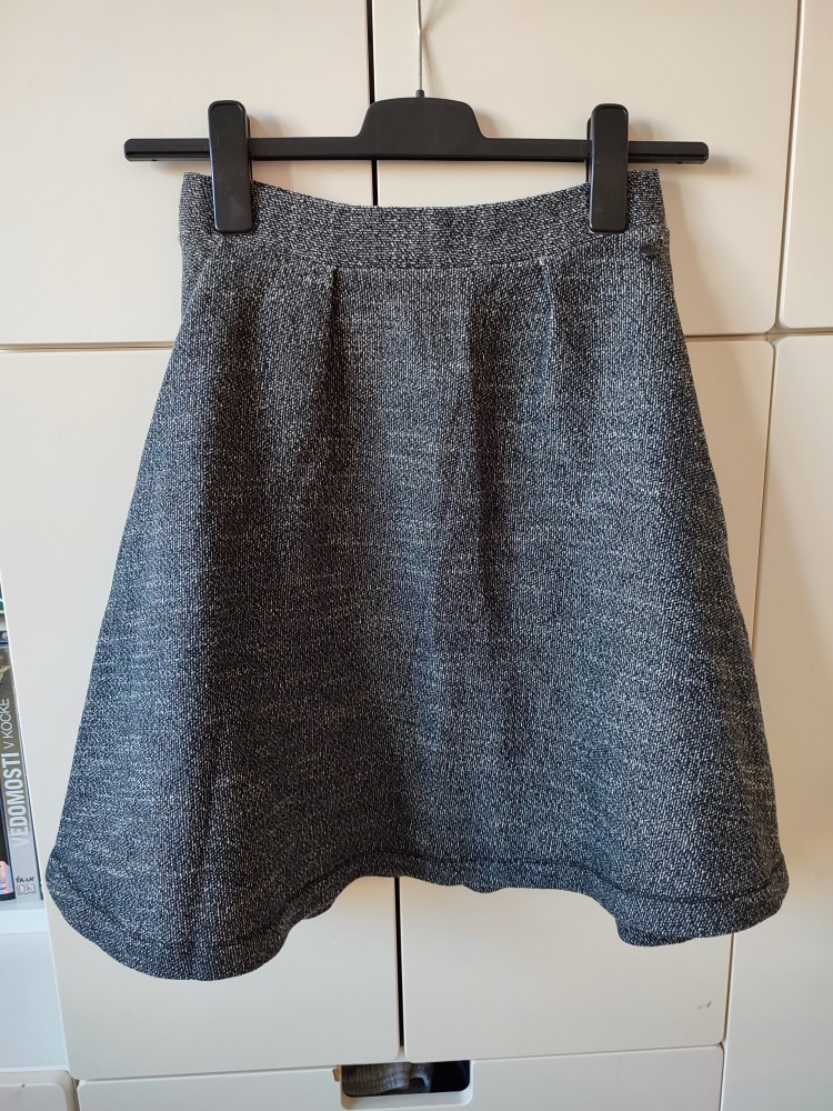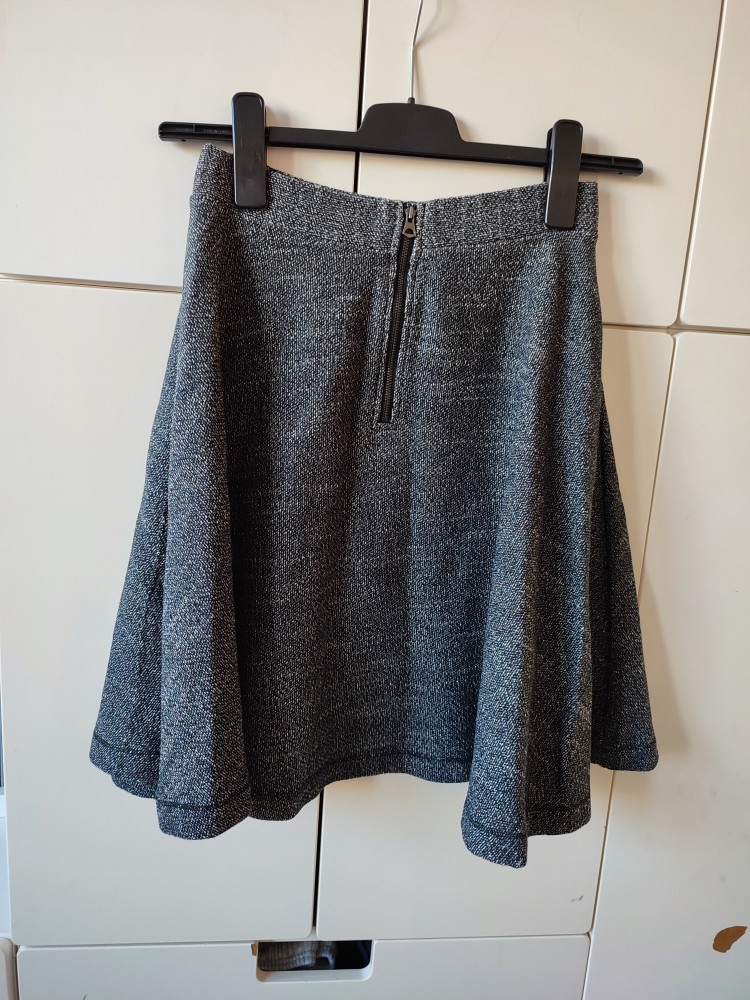áčková sukňa do pása, materiál niečo ako teplákovina, pekne sedí. farba tmavomodrá melírovaná. nemá žiadne poškodenia. sedí na 38.