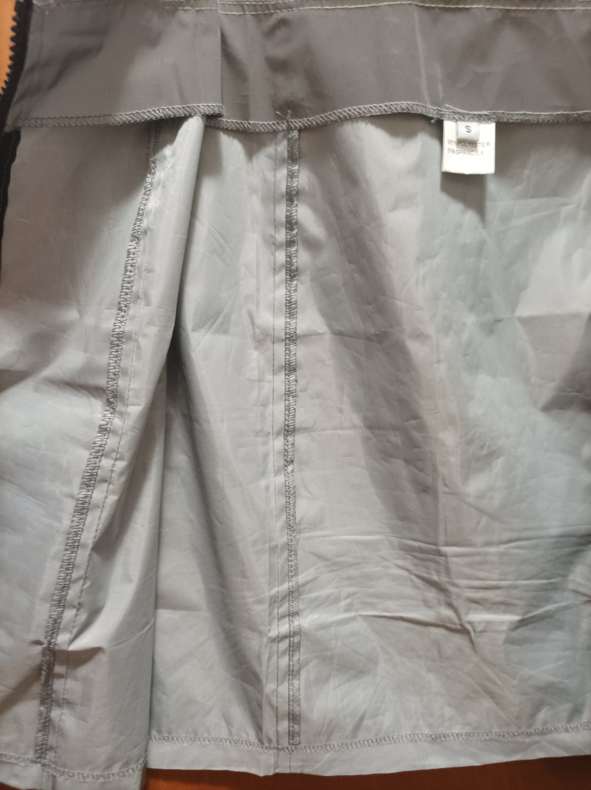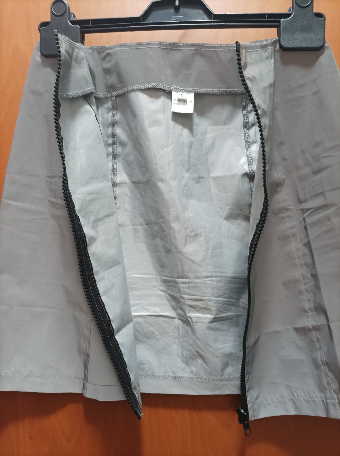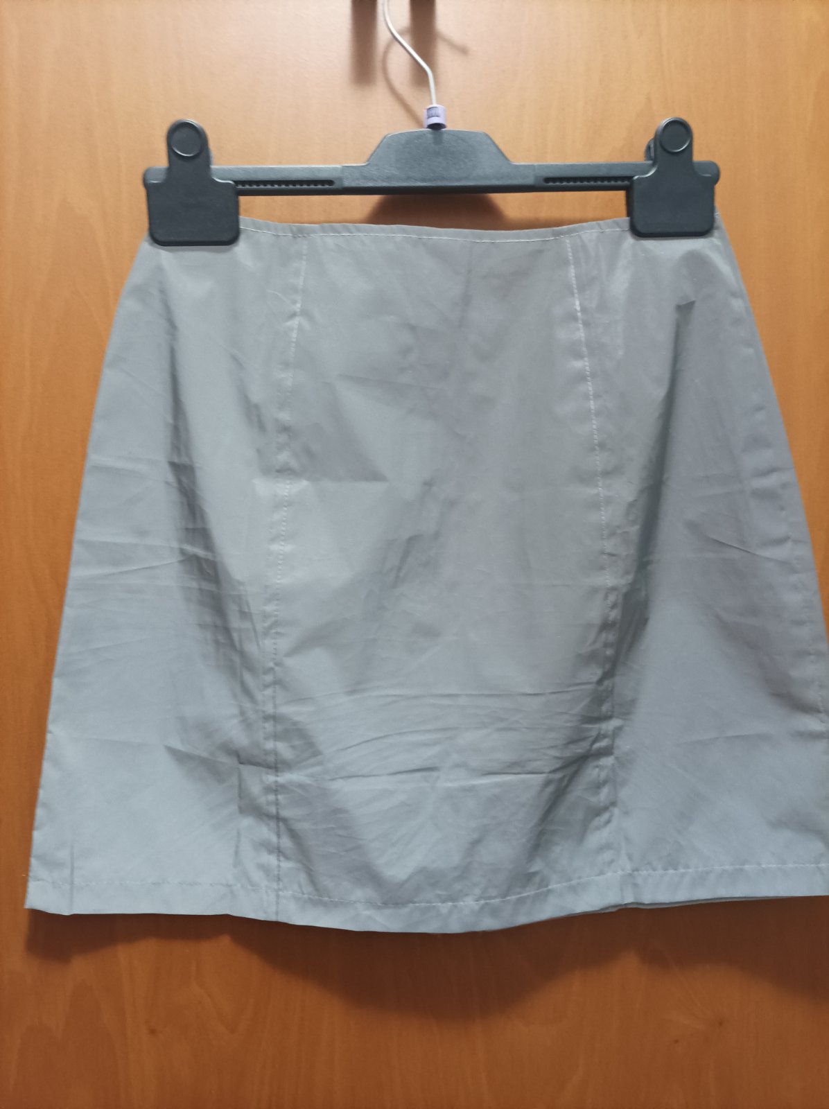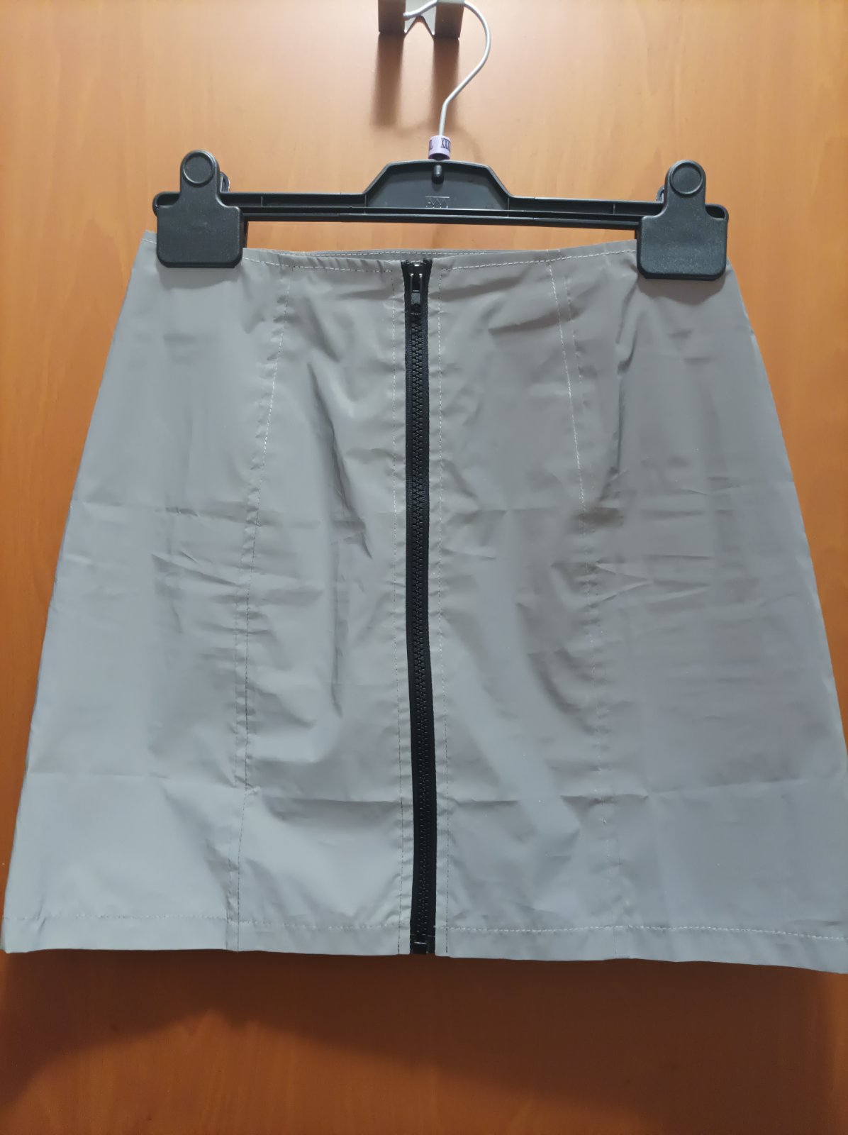 Zachovalá úzka sukňa, zapínanie vpredu na zips.Je šedo -striebornej farby.