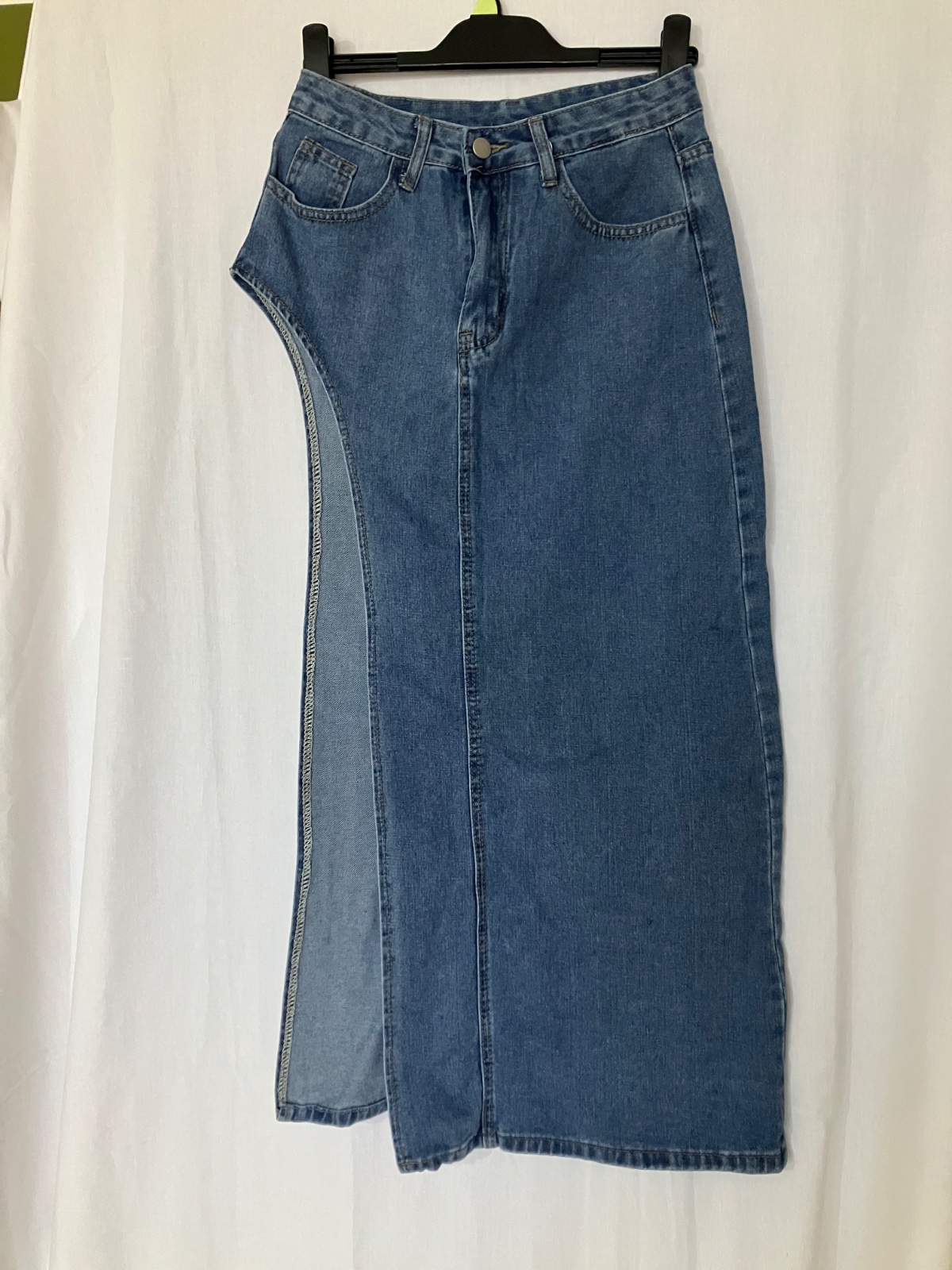 Veľmi štýlová dlhá riflová sukňa s asymetrickým strihom a rozparkom, ktorá krásne predĺži postavu a robí z každého outfitu statement. Perfektný kúsok pre milovníčky Y2K estetiky, minimalistického šatníka alebo moderného streetwearu.