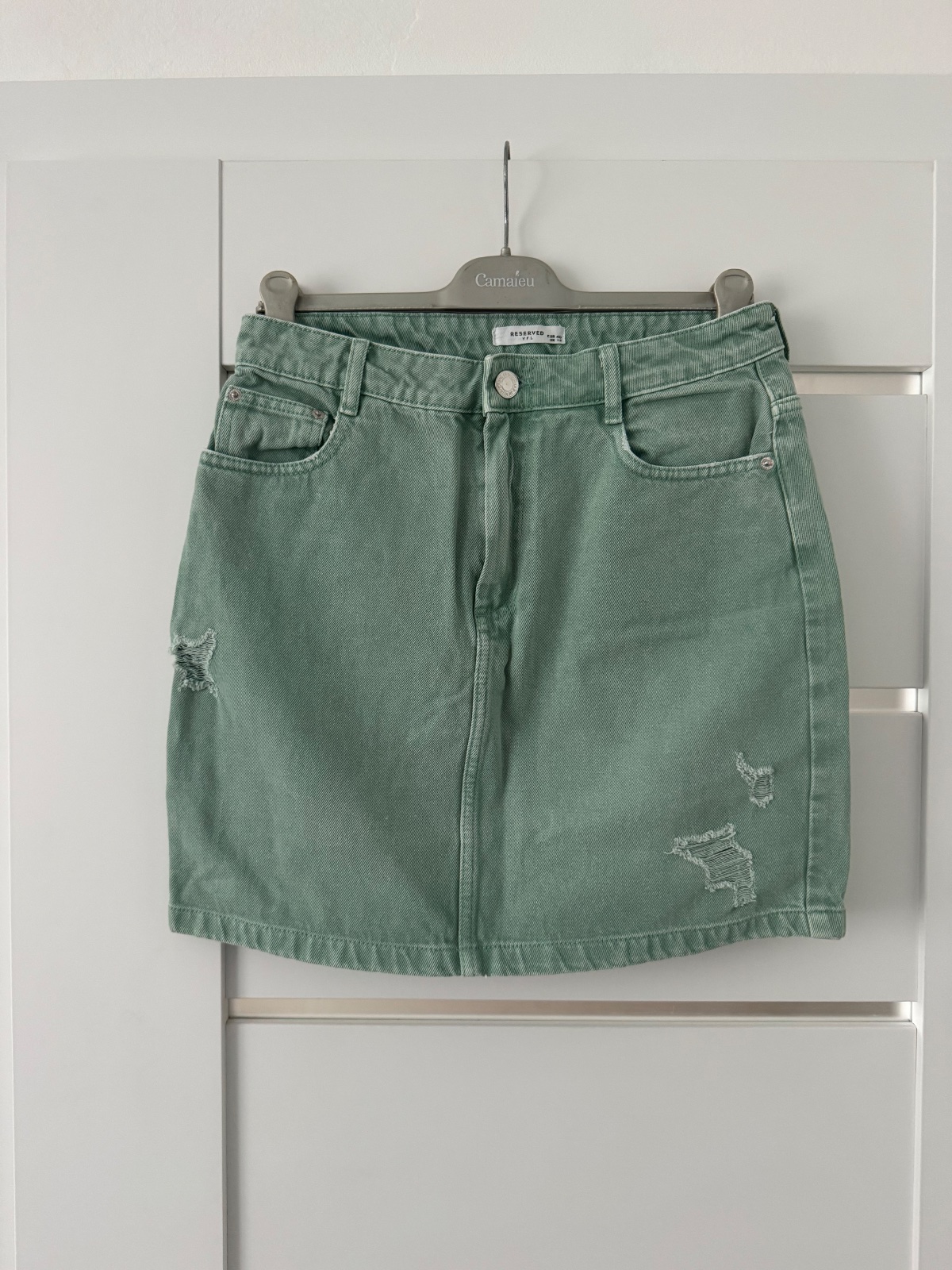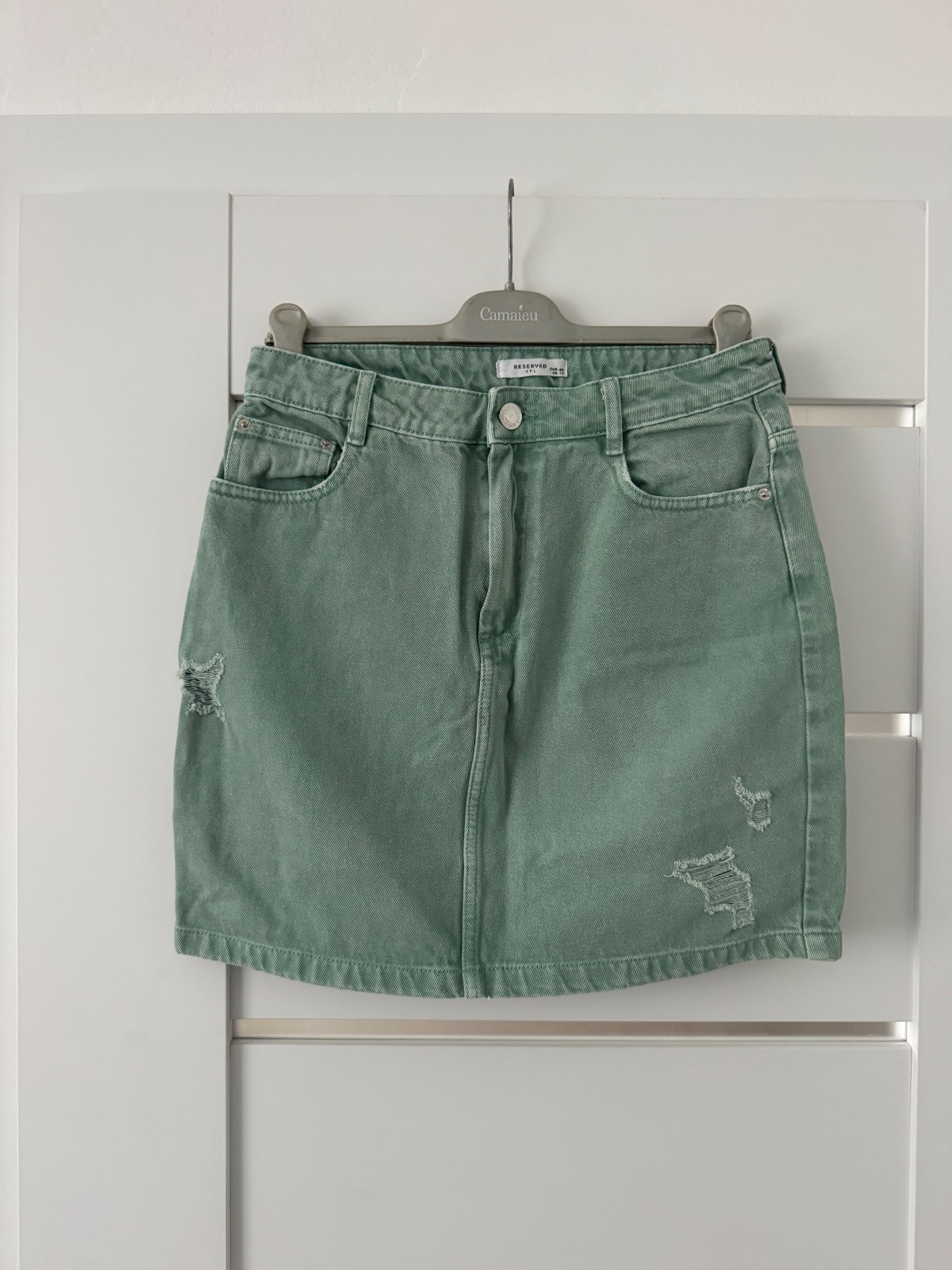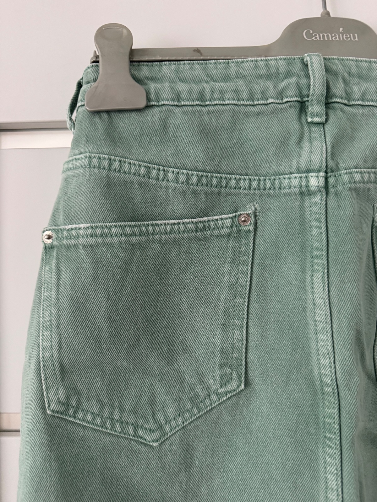 Ma uplne super stav, len jednu nedokonalost, pri vreckach vzadu ma akoby roztrhanena obidvoch stranach. Šikovné si to vedia upravit, alebo nosit s predlzenym tričkom. Ja som si to všimla až pri foteni, cize dovtedy som to normalne nosila aj s tym. Posuvam za symbolicku cenu.