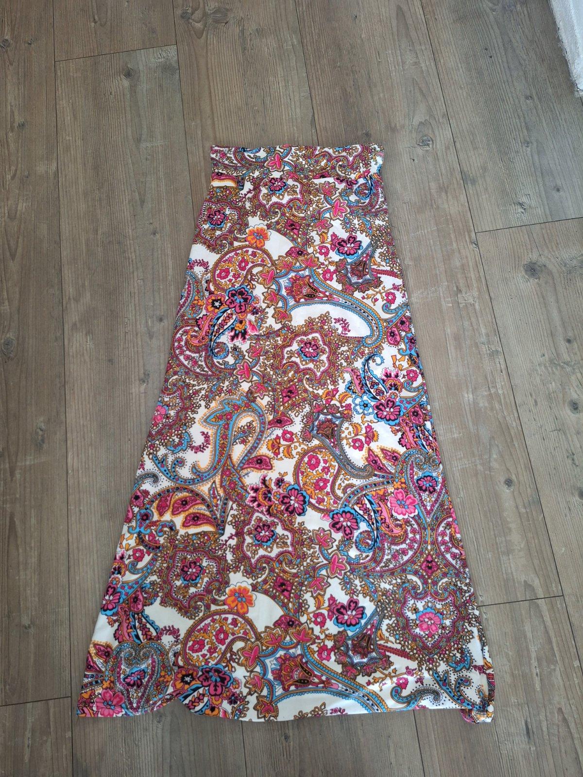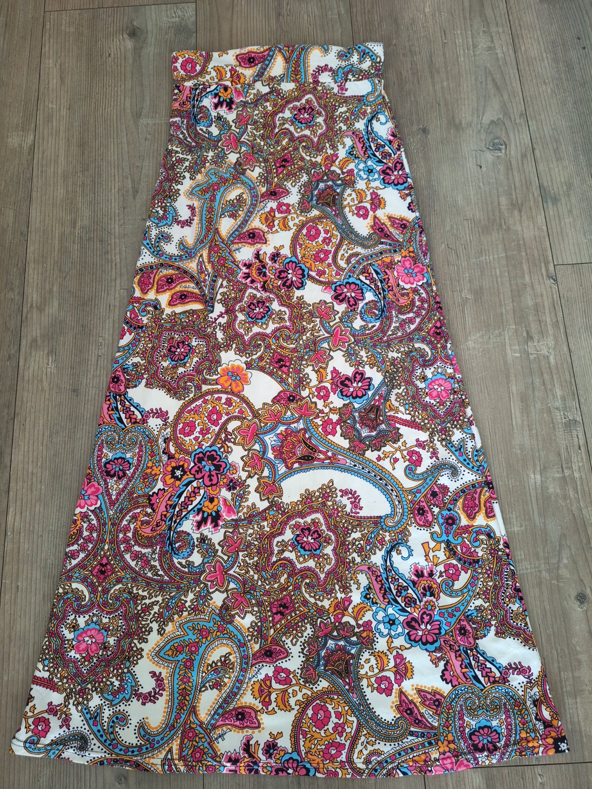 Krásna 1 krát oblecena sukňa s farebnými vzormi. Velmi pohodlná. Elastická. Odstrihla som visačky, takže neviem aký je materiál, ale je veľmi makkucka, kvalitná a elastická