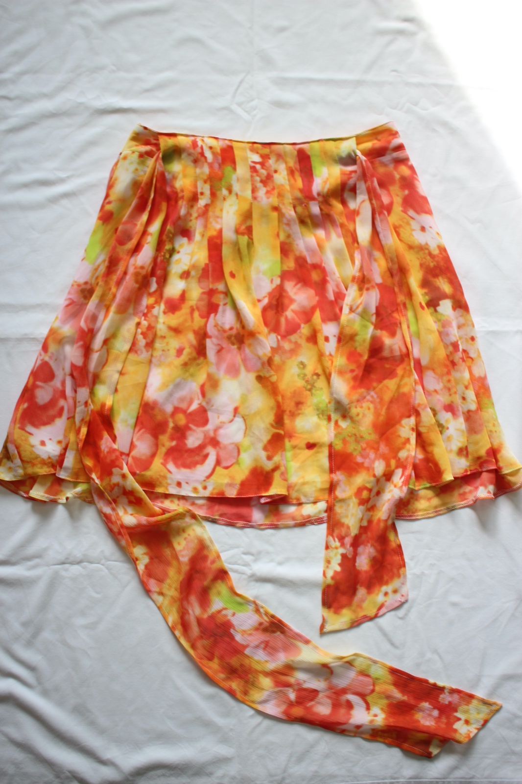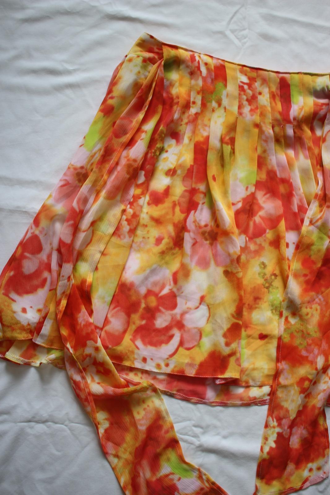 Táto dámska kvetovaná sukňa v teplých tónoch oranžovej, žltej a červenej je čistá esenciu leta ☀️🌺. Má krásny romantický vibe à la Carrie Bradshaw zo seriálu Sex v meste – bohaté volány, ľahkosť a hravosť, ktoré z nej robia statement kúsok do tvojho šatníka.