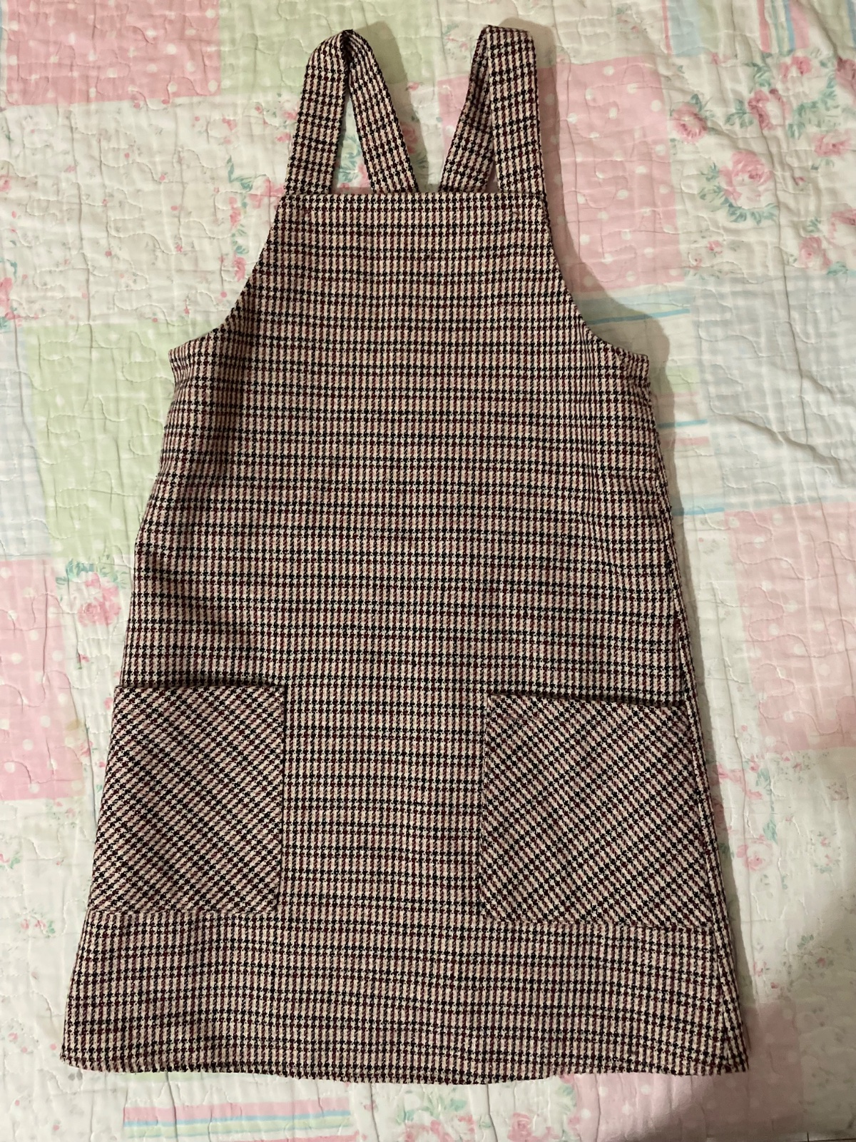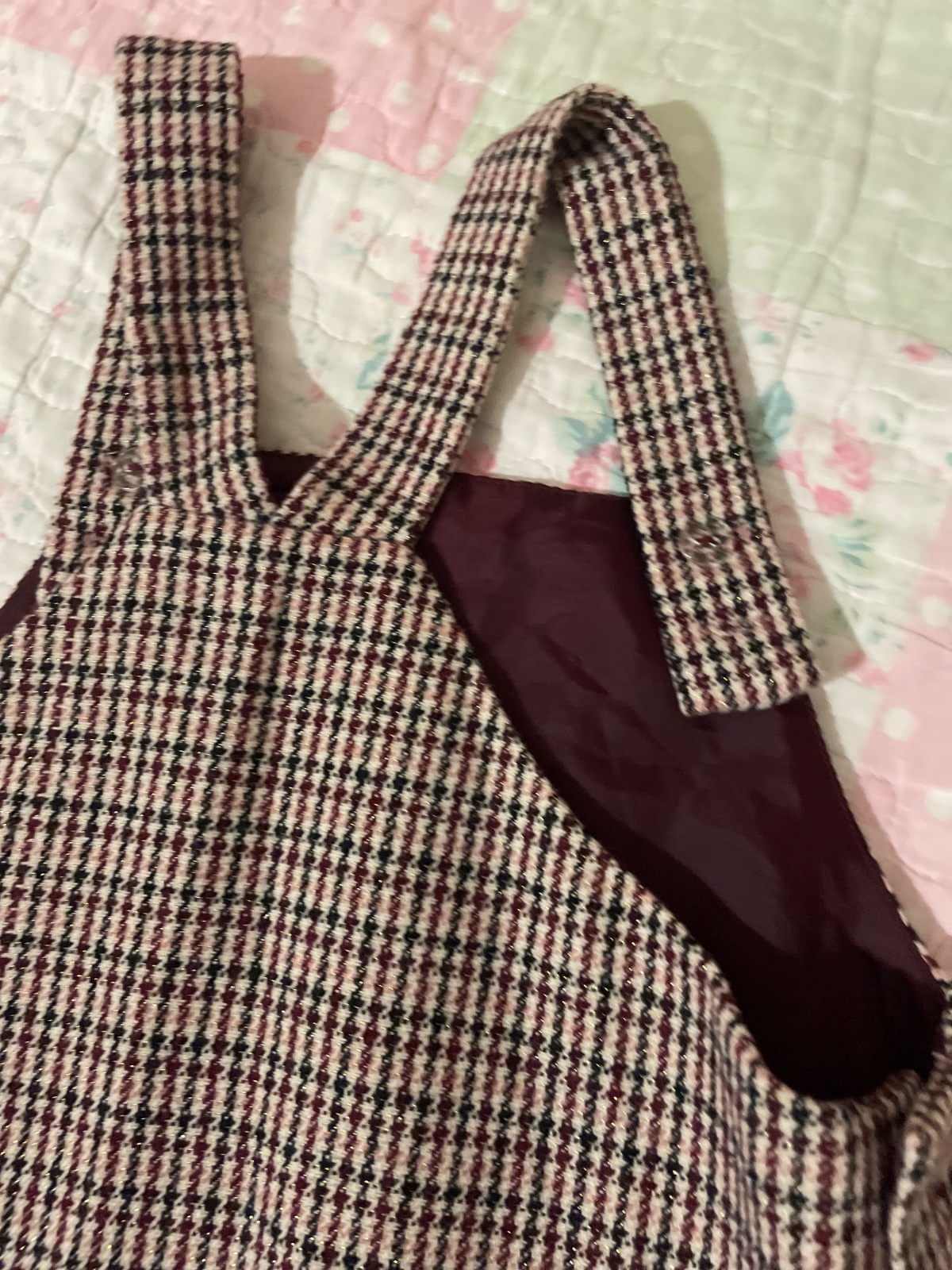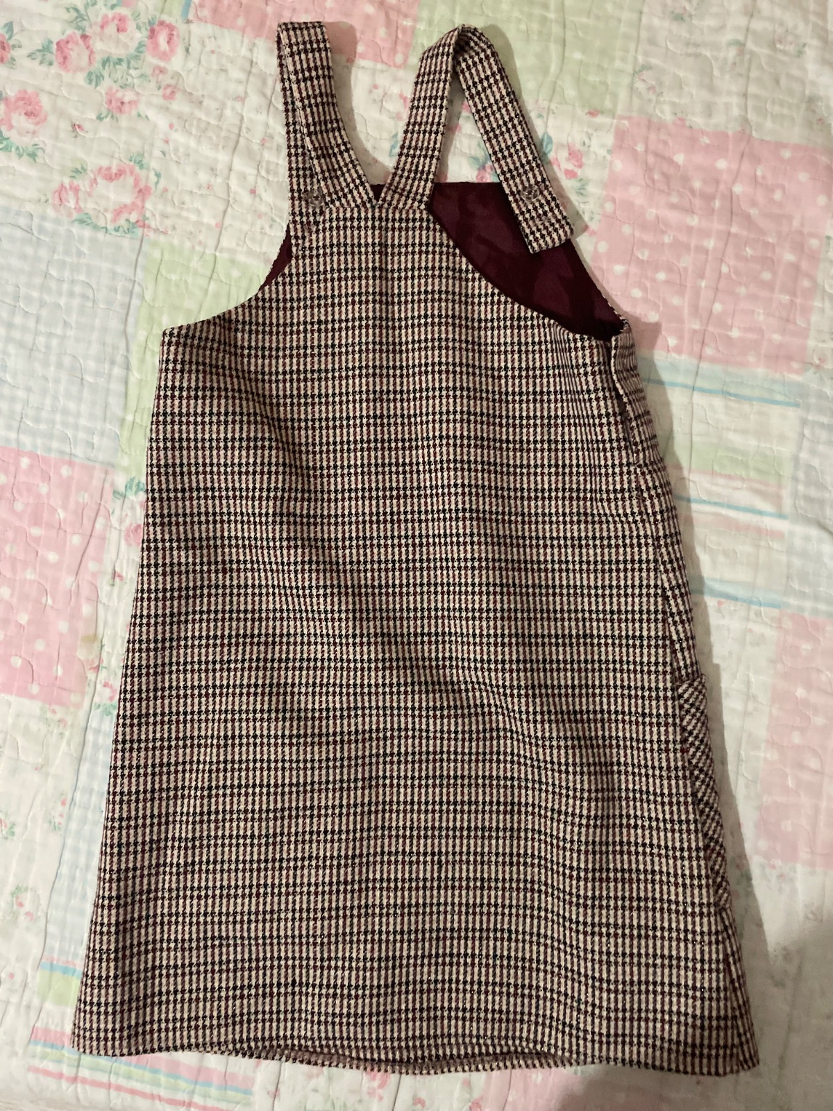 Roztomilé šaty na traky, s prednými veľkými vreckami.Vhodne na jeseň a zimu, na bežne nosenie ale aj na koncert či inú príležitosť. Bordovo-čierny vzor do ktorého je zakonponovana strieborná niť.Viď všetky fotky 👢🧣Nadčasové👧🏼🍁Top stav