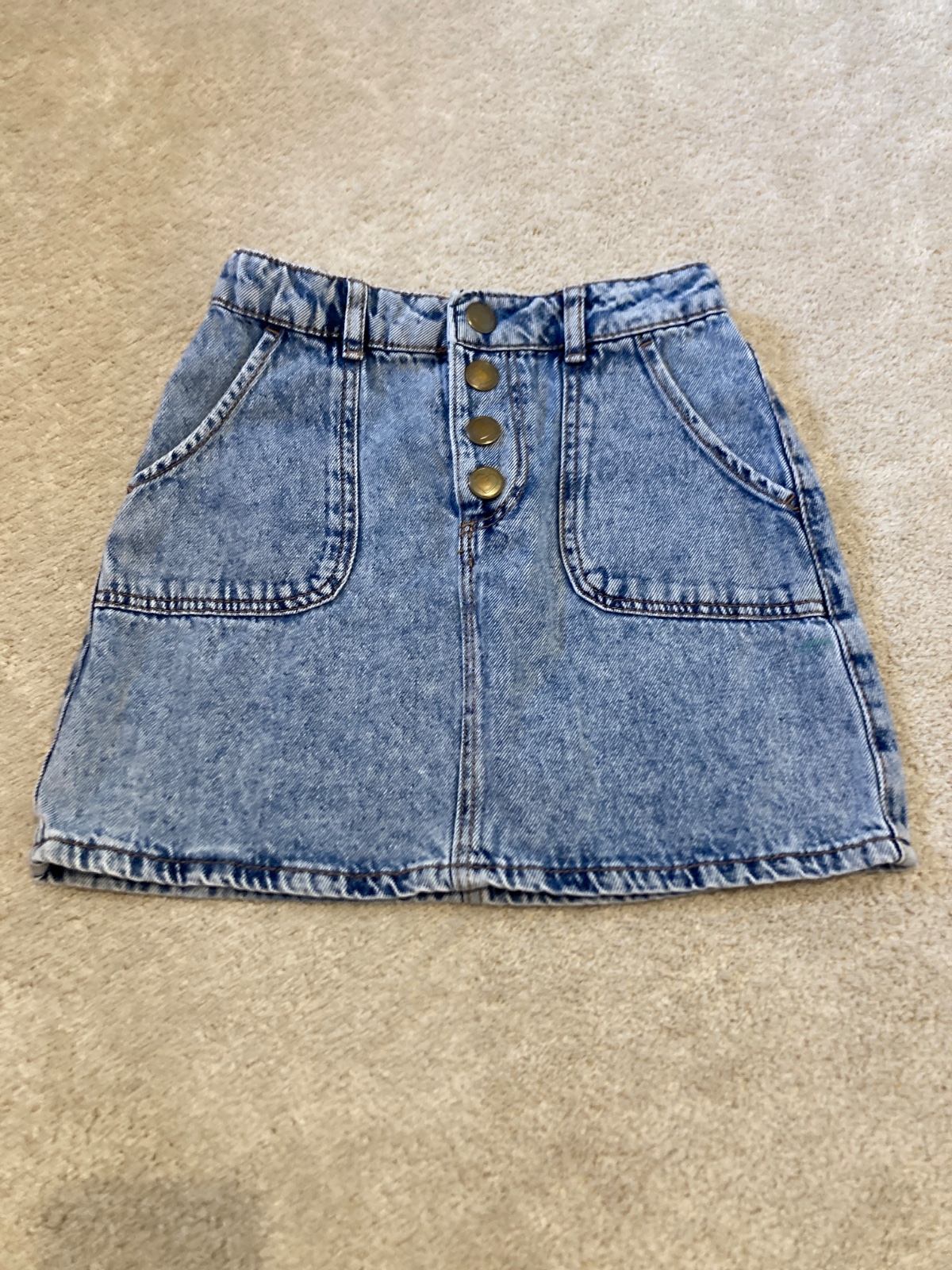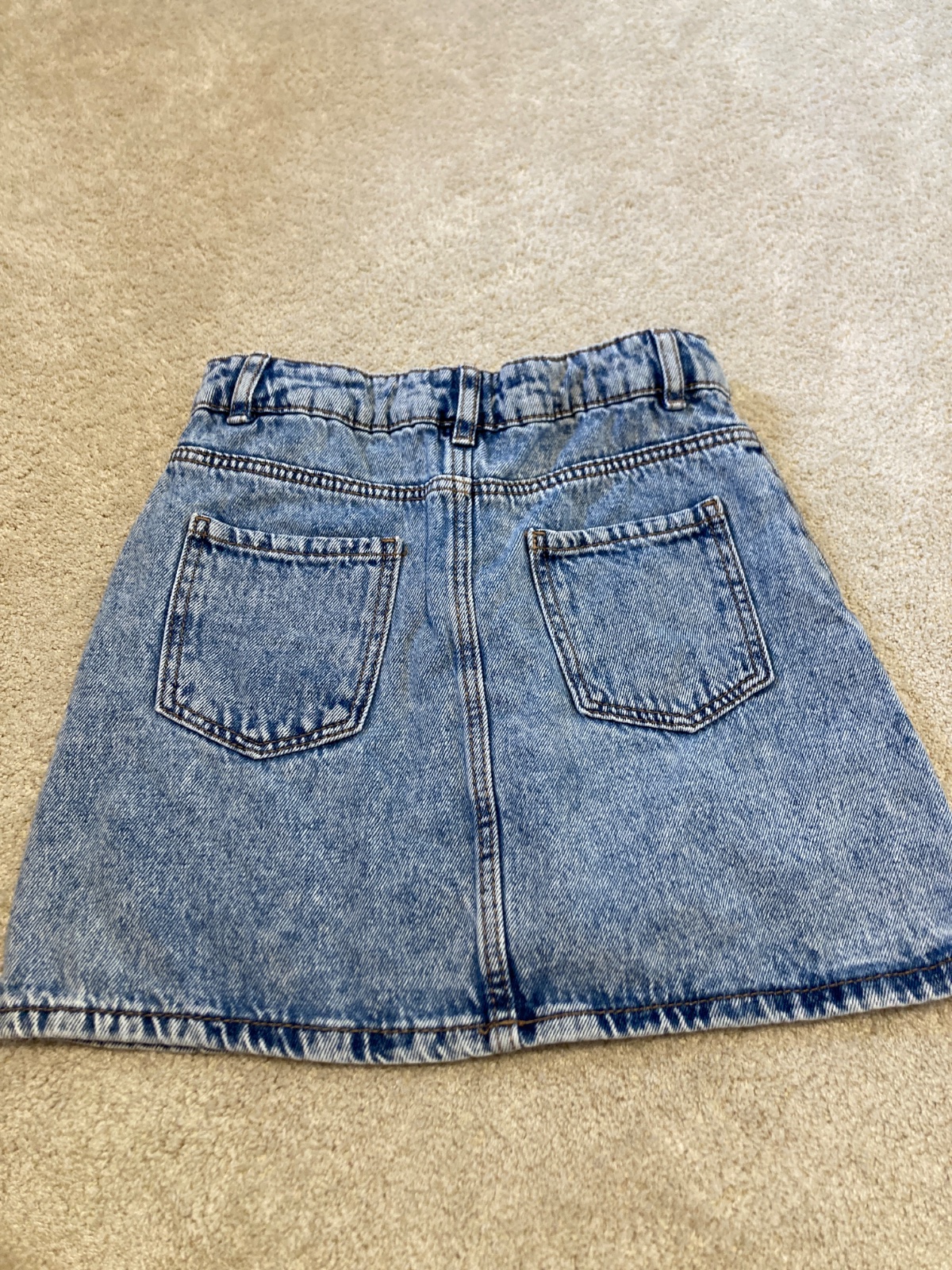 Dievcenska riflova sukna vel 128, s vreckami vpredu aj vzadu. Stiahnutie v pase (system gumicka s gombikom)