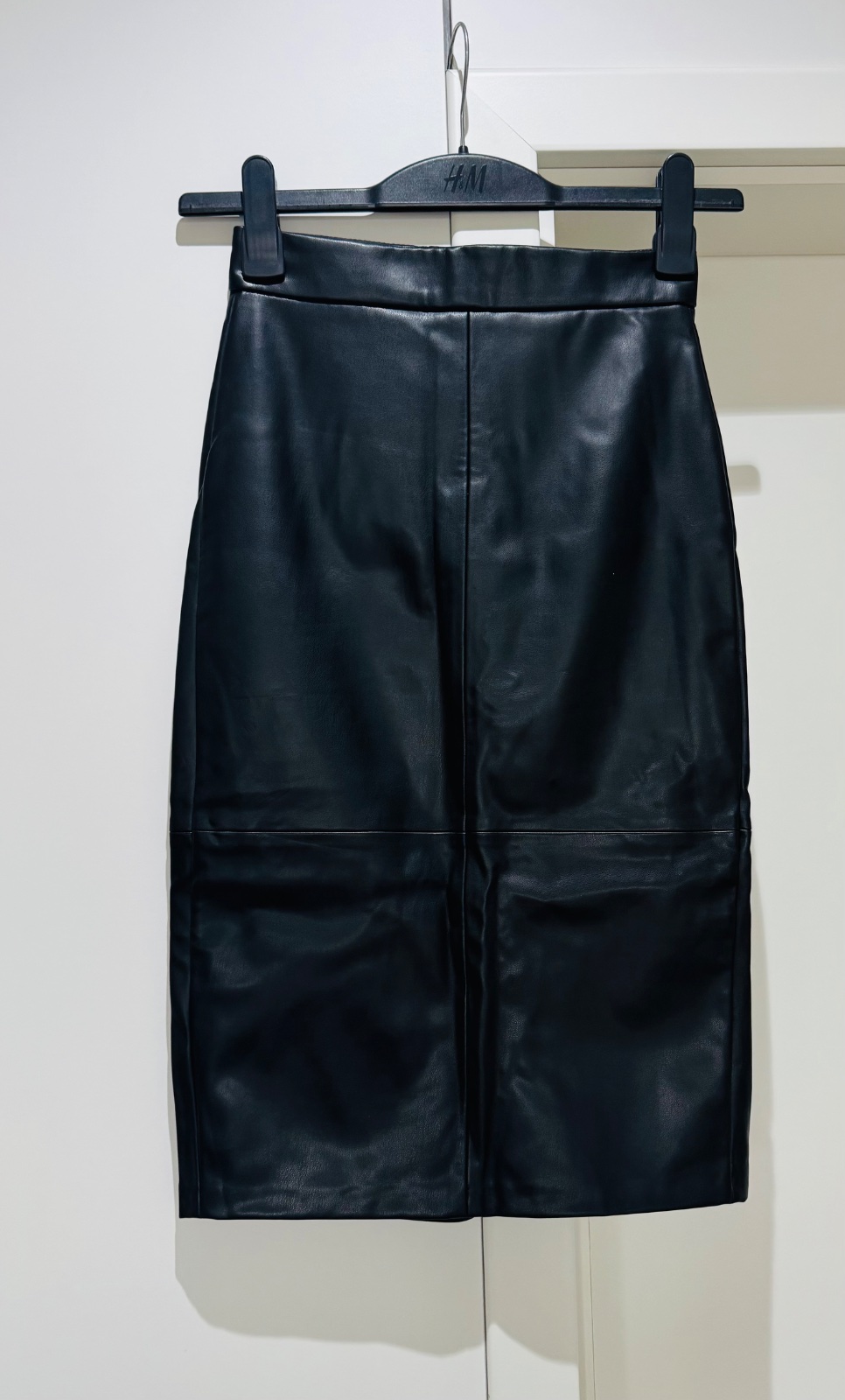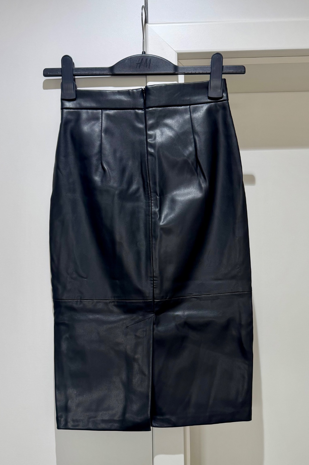 Výborný stav, koženkova, čierna, vzadu rozparok, veľkosť 34,pás 34 x 2 cm, d. 58 cm