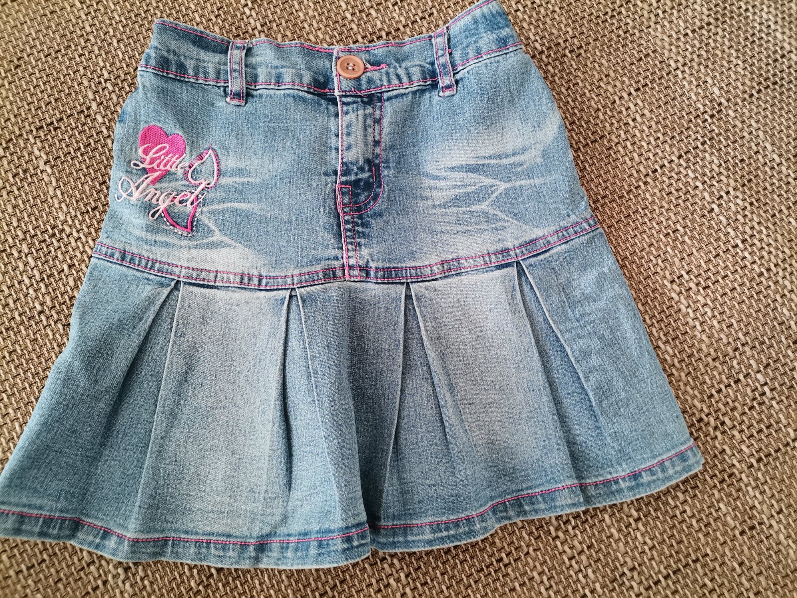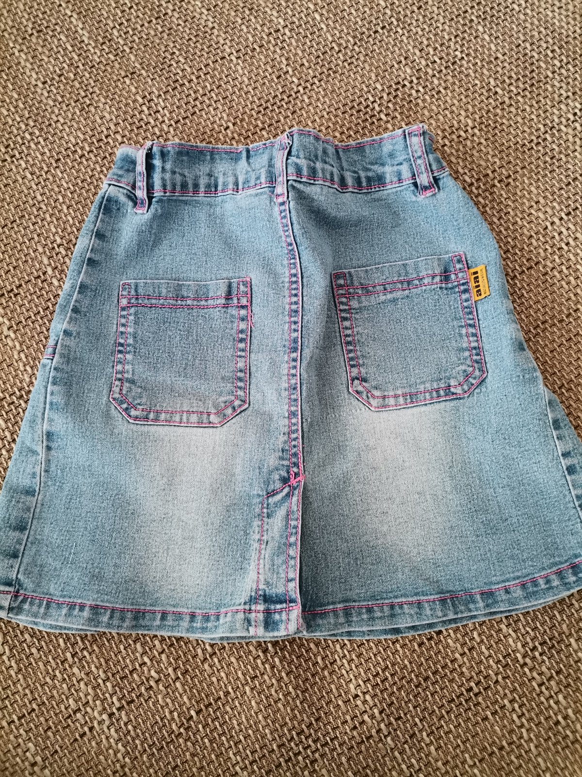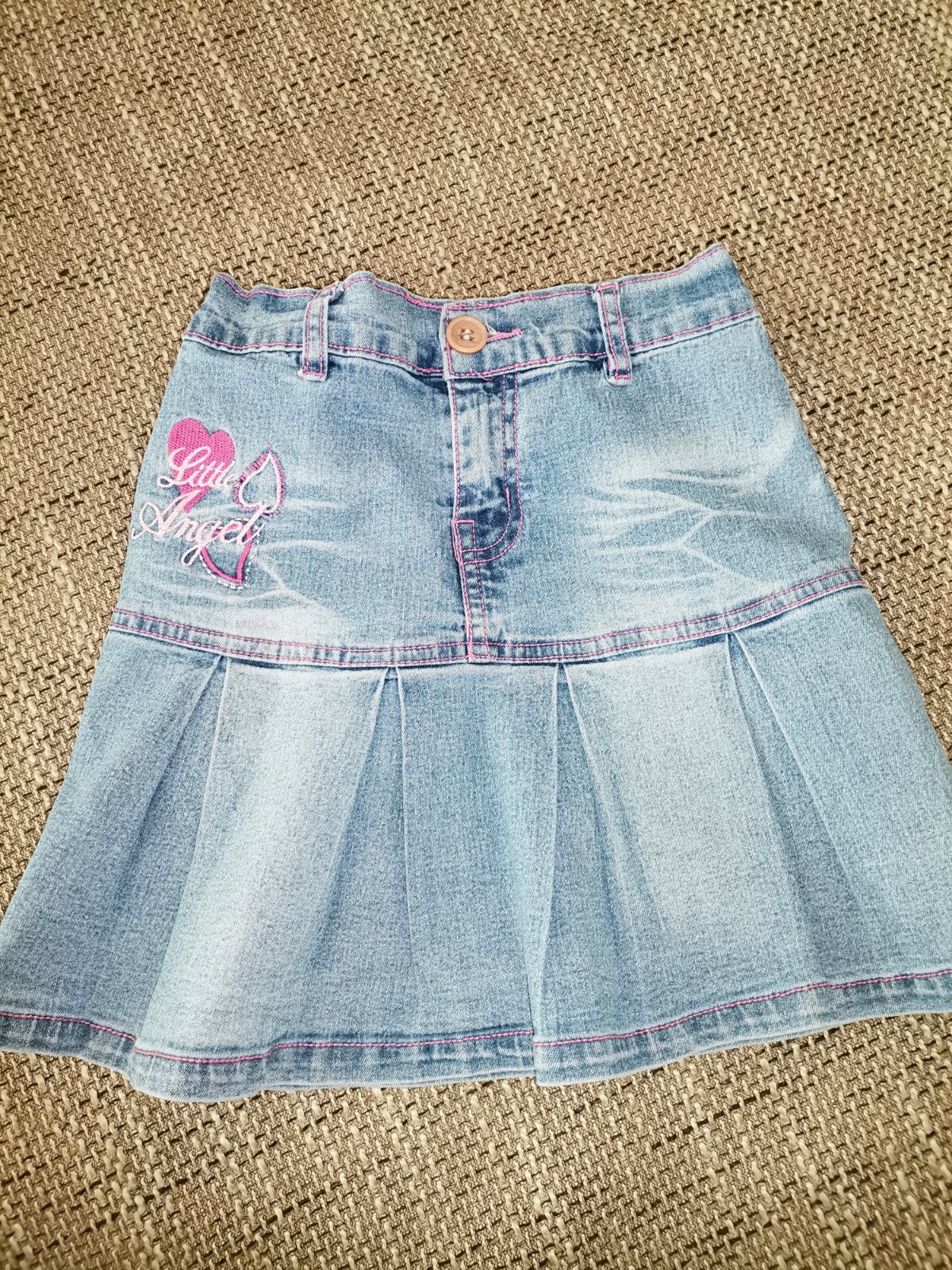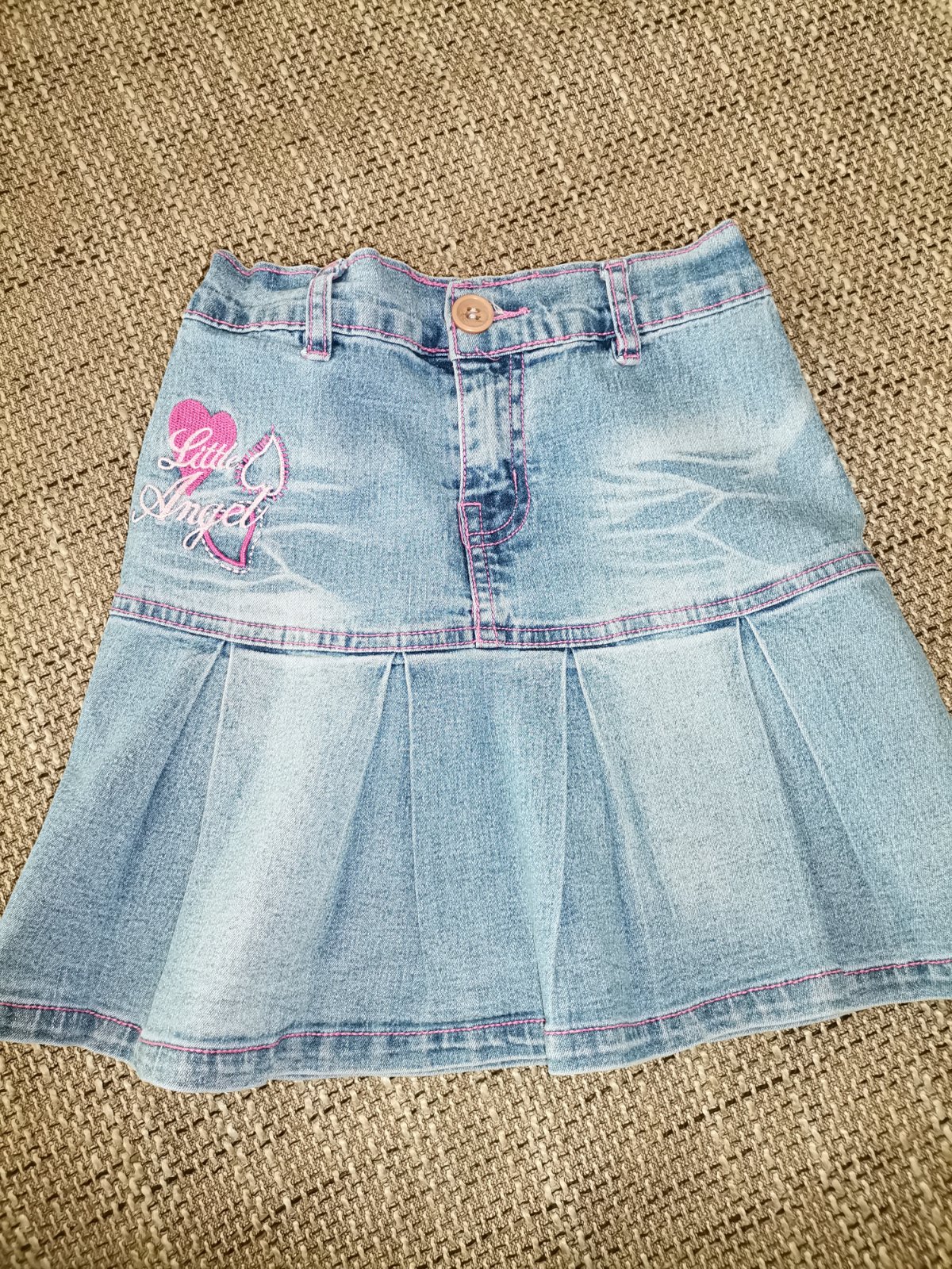 Predám riflovú sukňu na 5-7,5roka. Je na nej veľ. 10. V páse je regulovateľná gumička,šírka pásu je cca 25cm. Dĺžka sukničky je 34cm. Cena: 0,99eur.