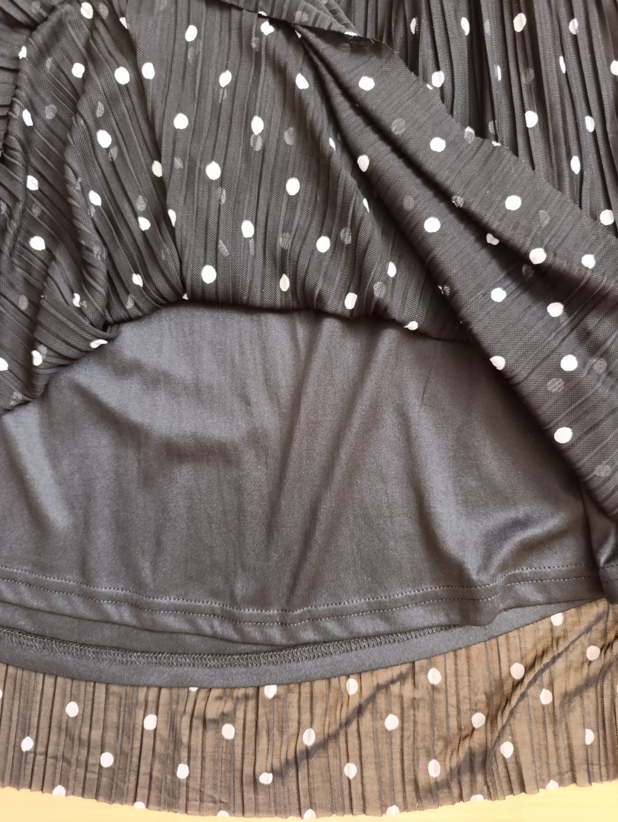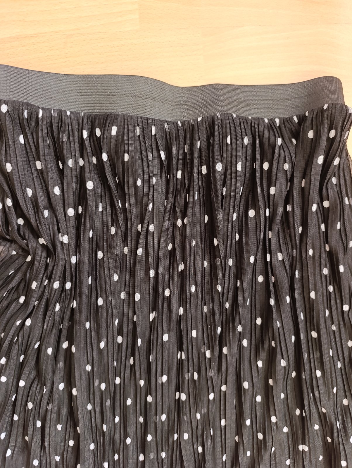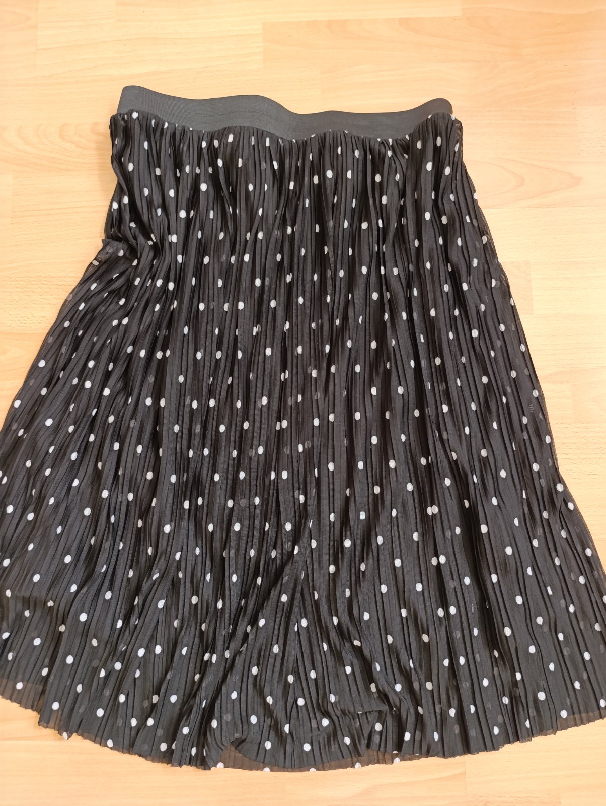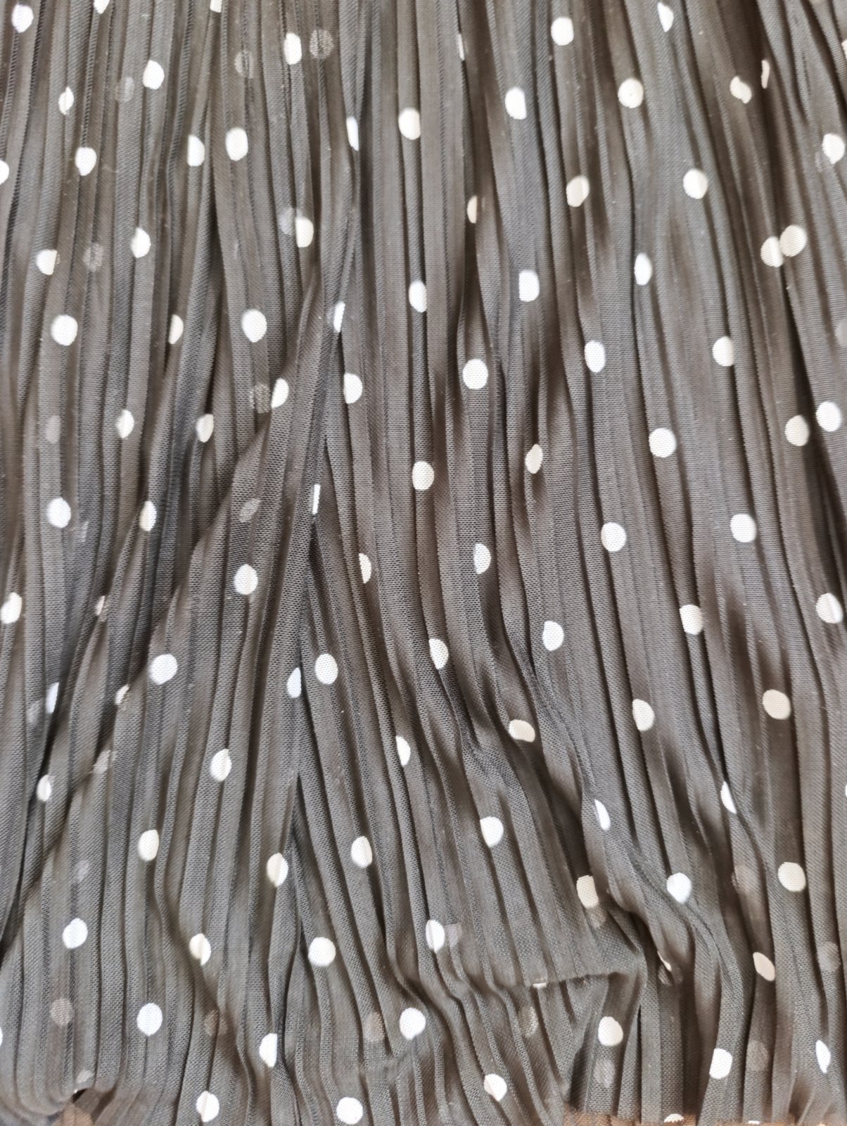 Nádherná sukienka,čierny podklad, biele guľky, píše veľkosť L, ale je väčšia, v páse guma 44-53 x 2, dĺžka 75