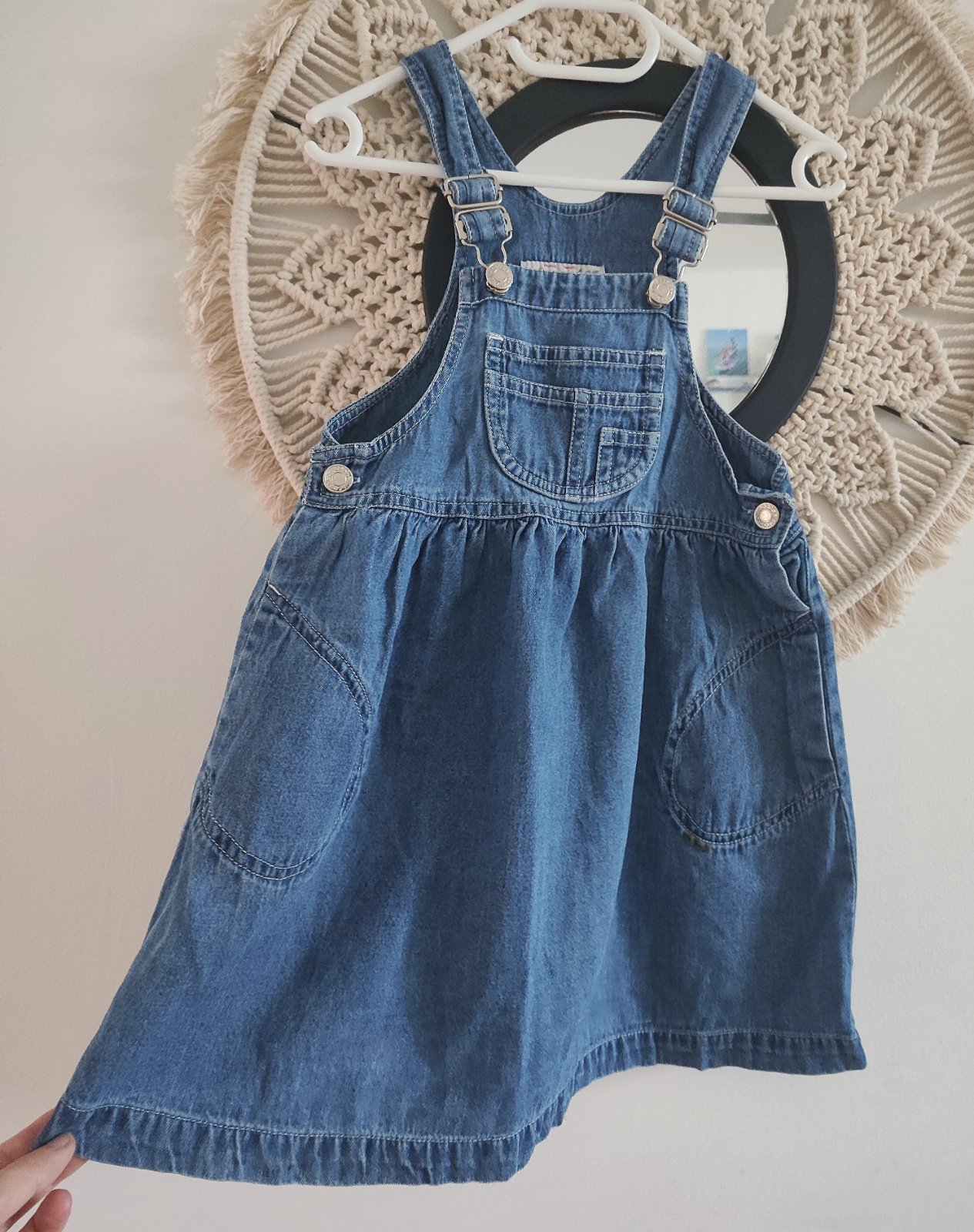 klasická rifľová suknička na traky, tie sú posuvné, šírka v mieste, kde možno vložiť opasok 33 cm x 2. dĺžka 60 cm - možno nastaviť. Bez známok nosenia