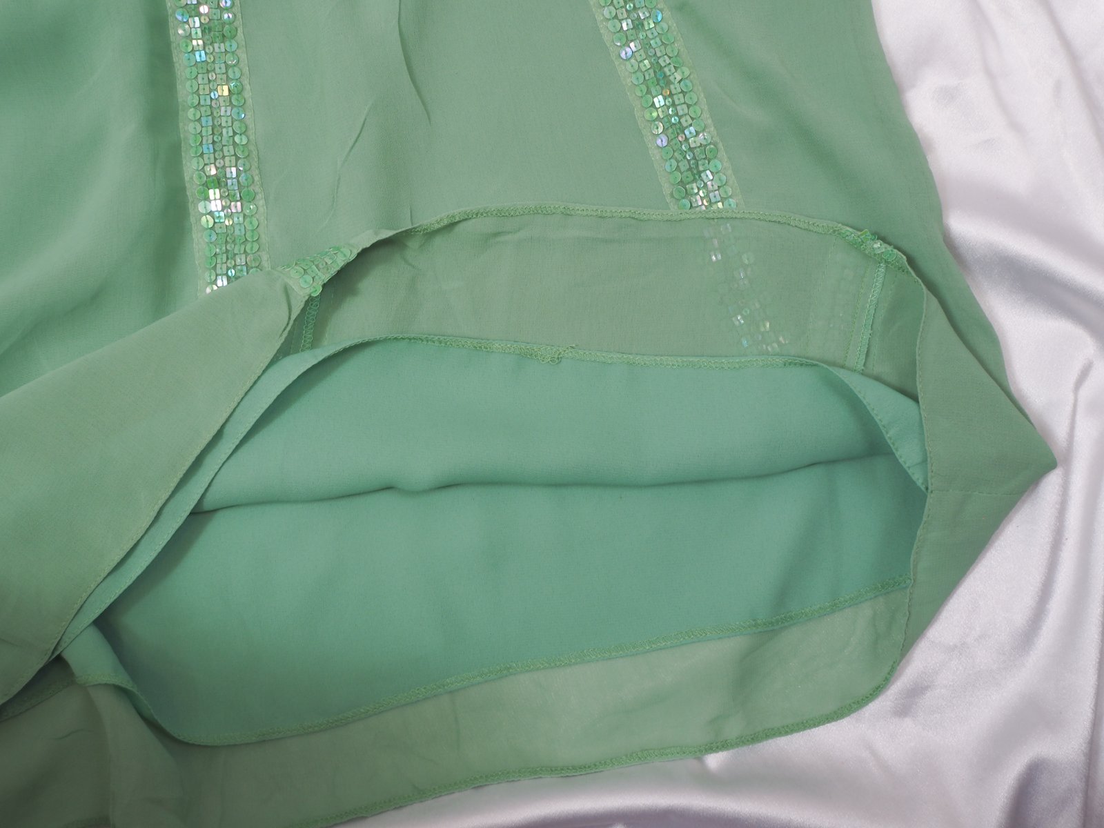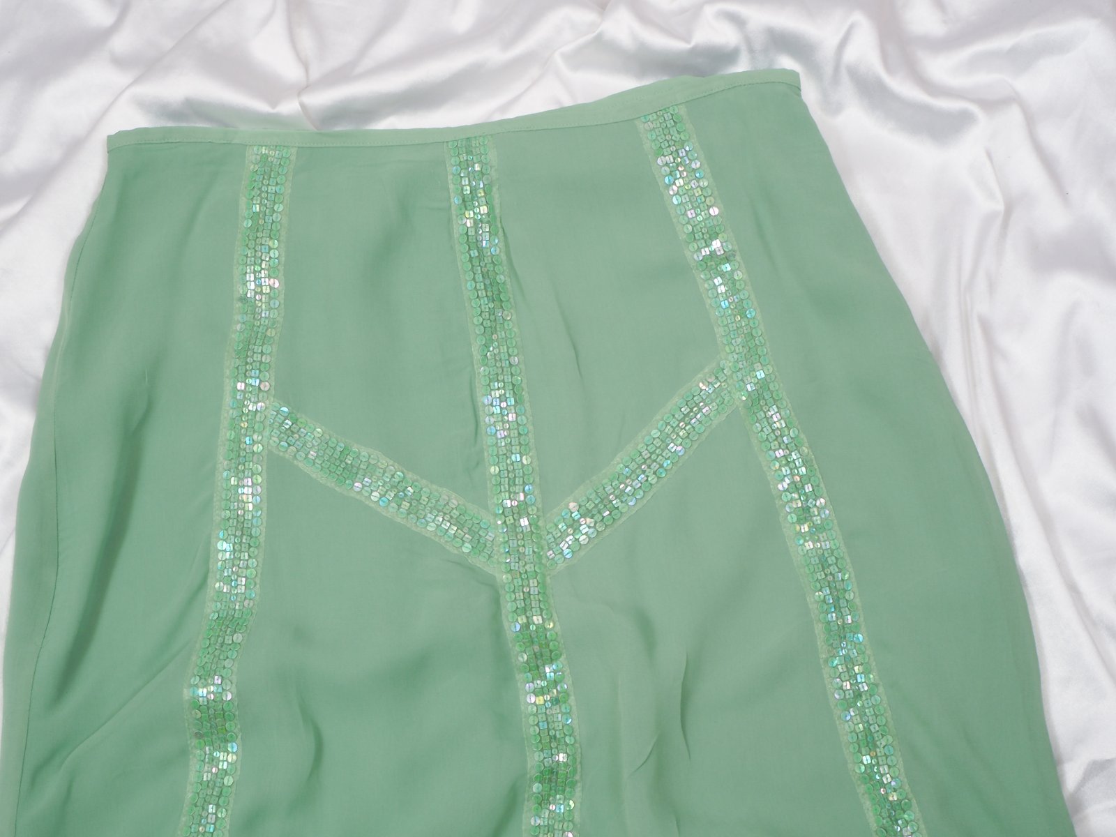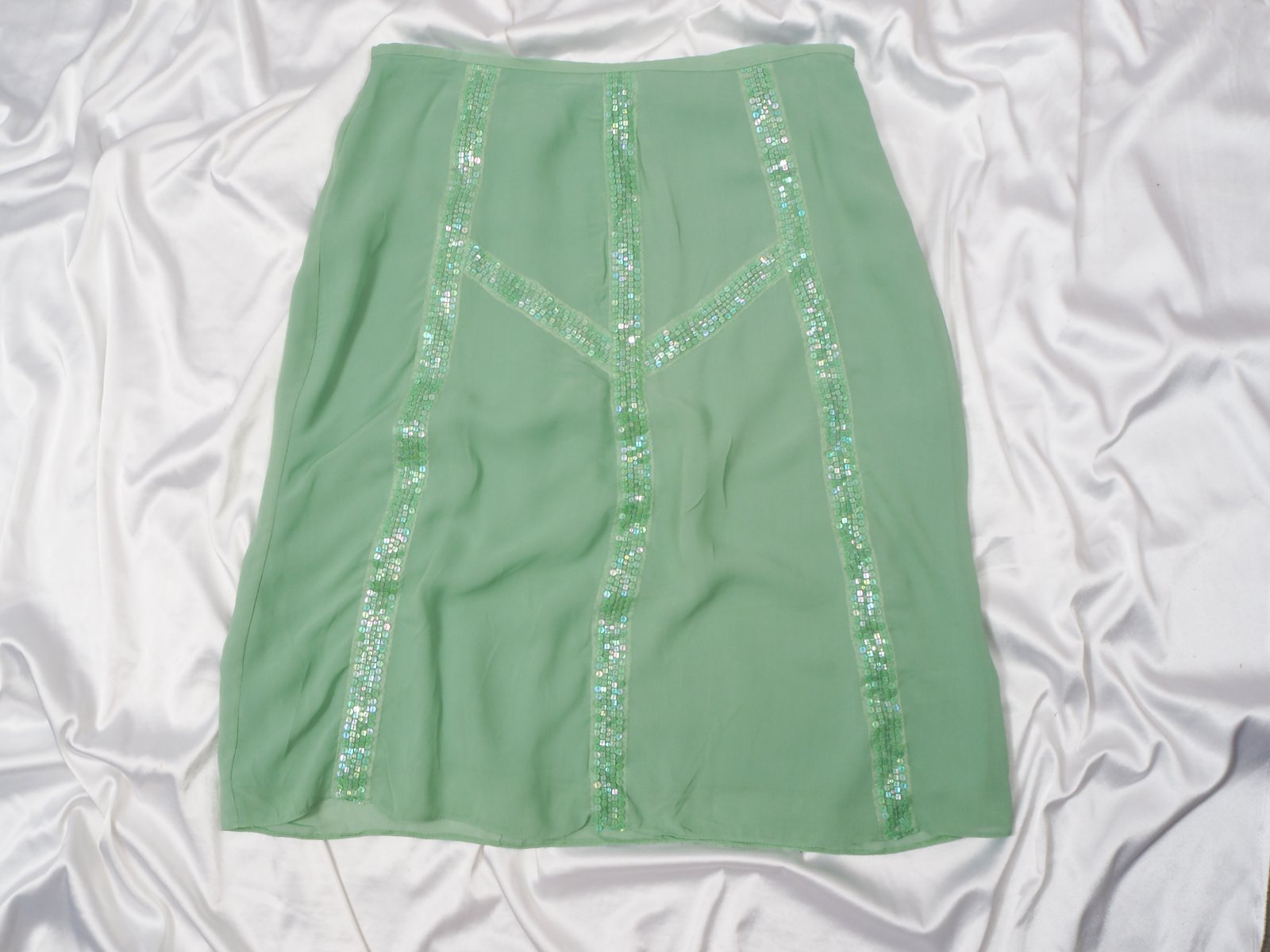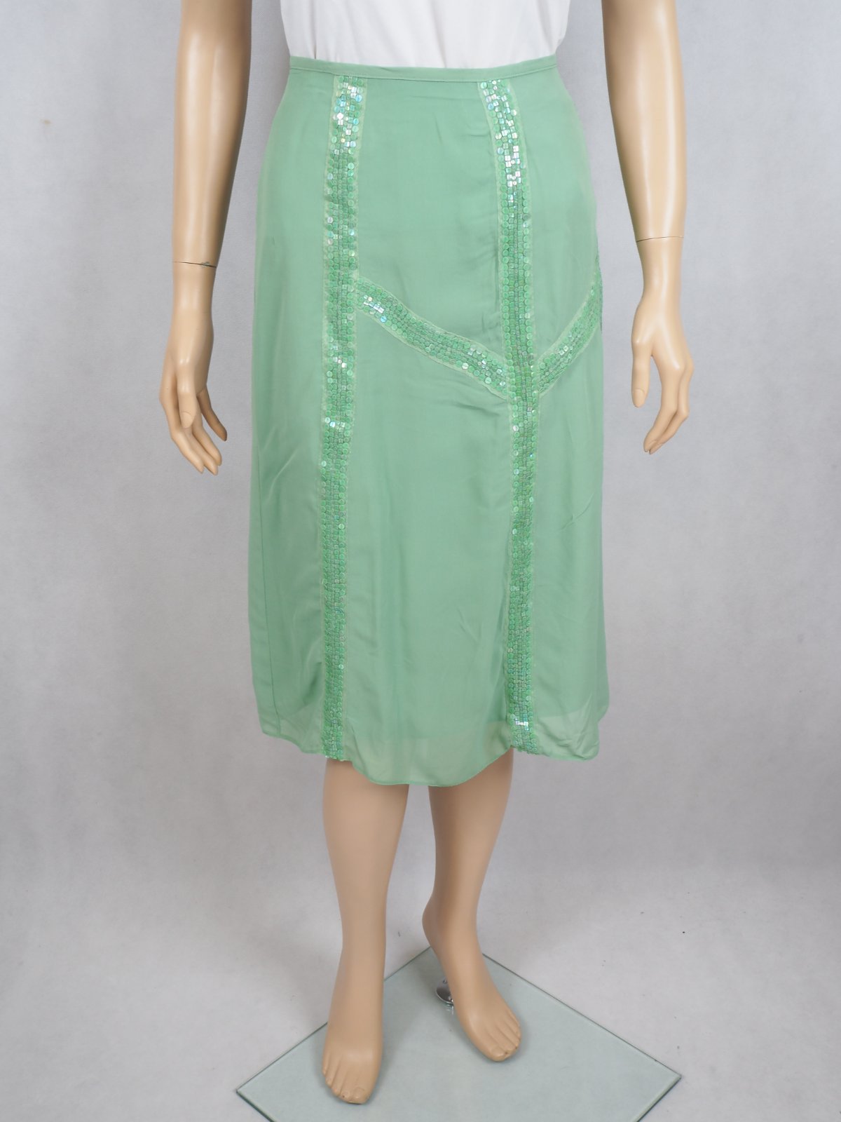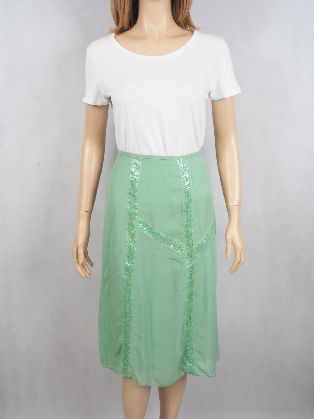 Kvalitná letná sukňa, bočný zips, podšitá, zdobená flitrami do vzoru, materiál 100% viskóza, nová s visačkou.