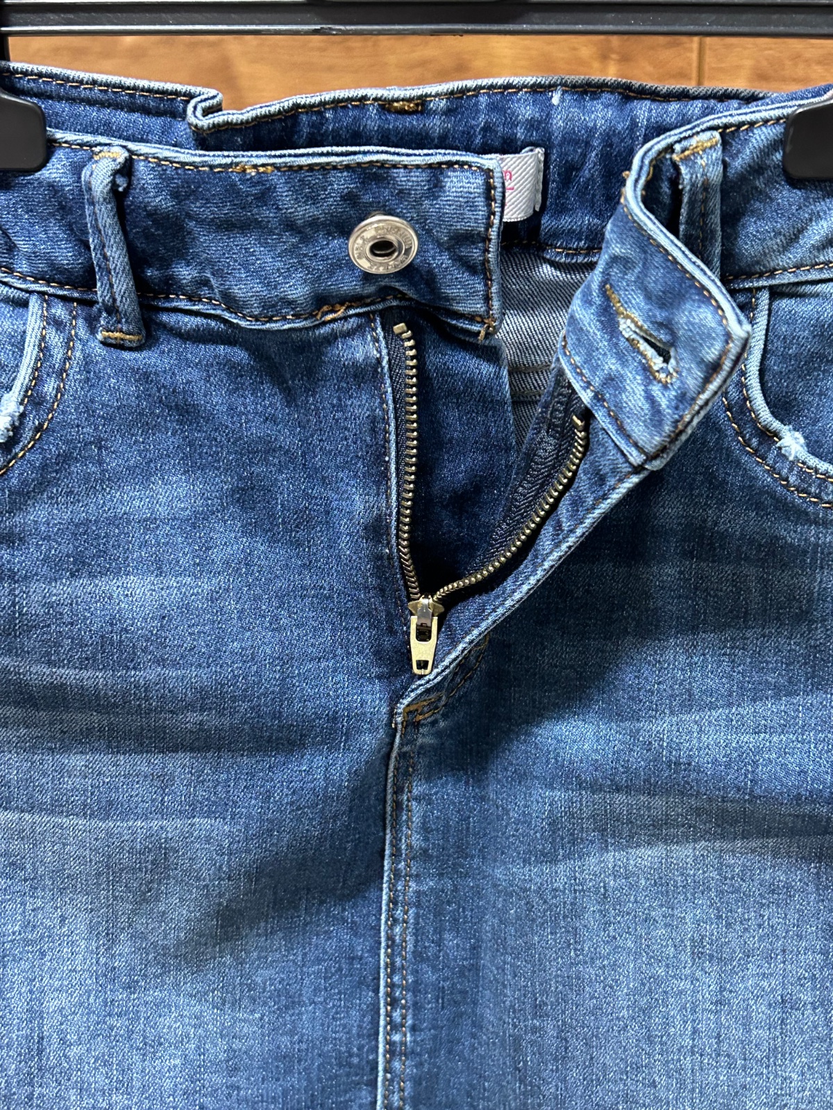 Zapínanie na zips a gombík, regulácia v páse, aplikácie na oboch stranách sukničky.