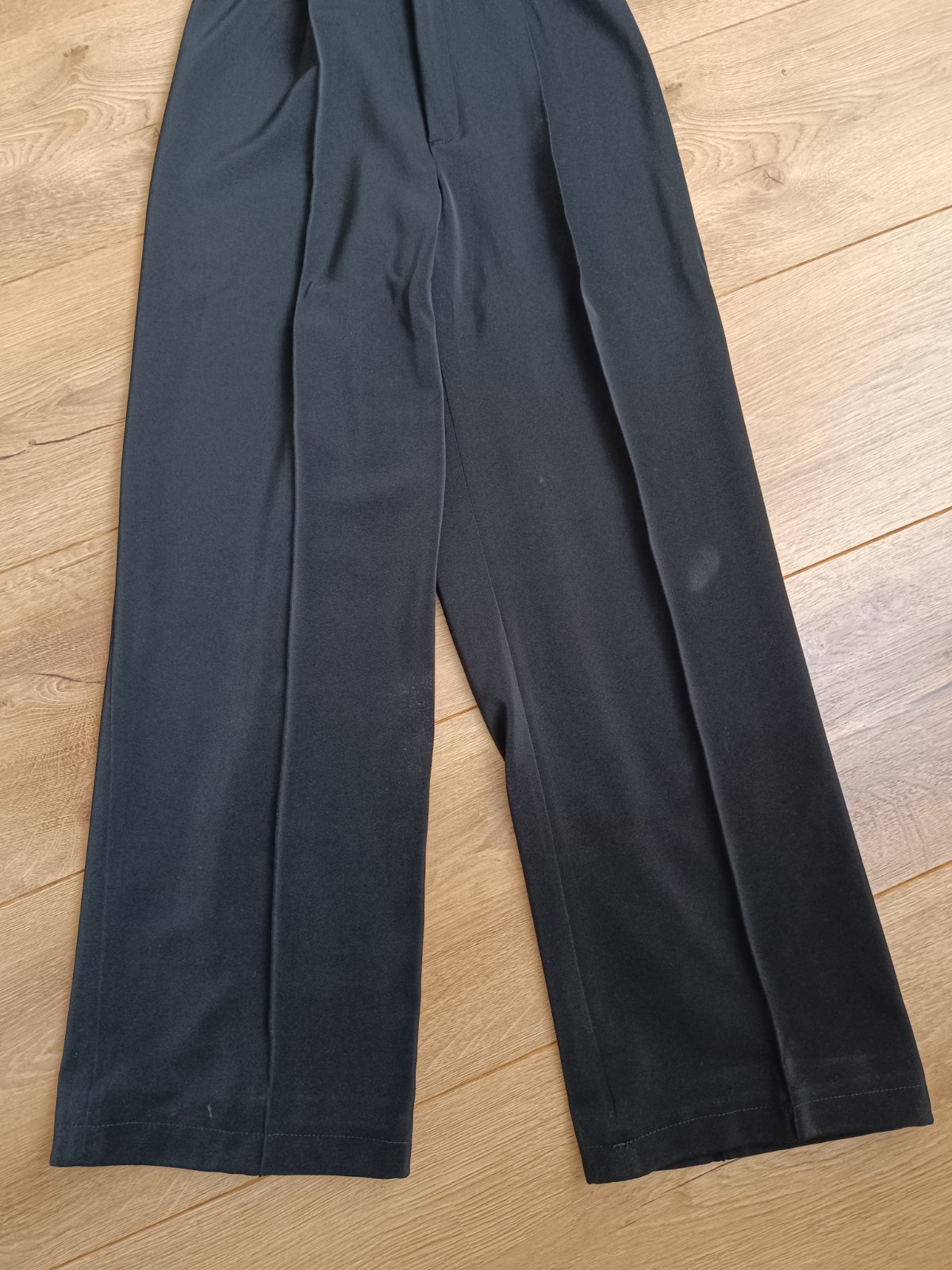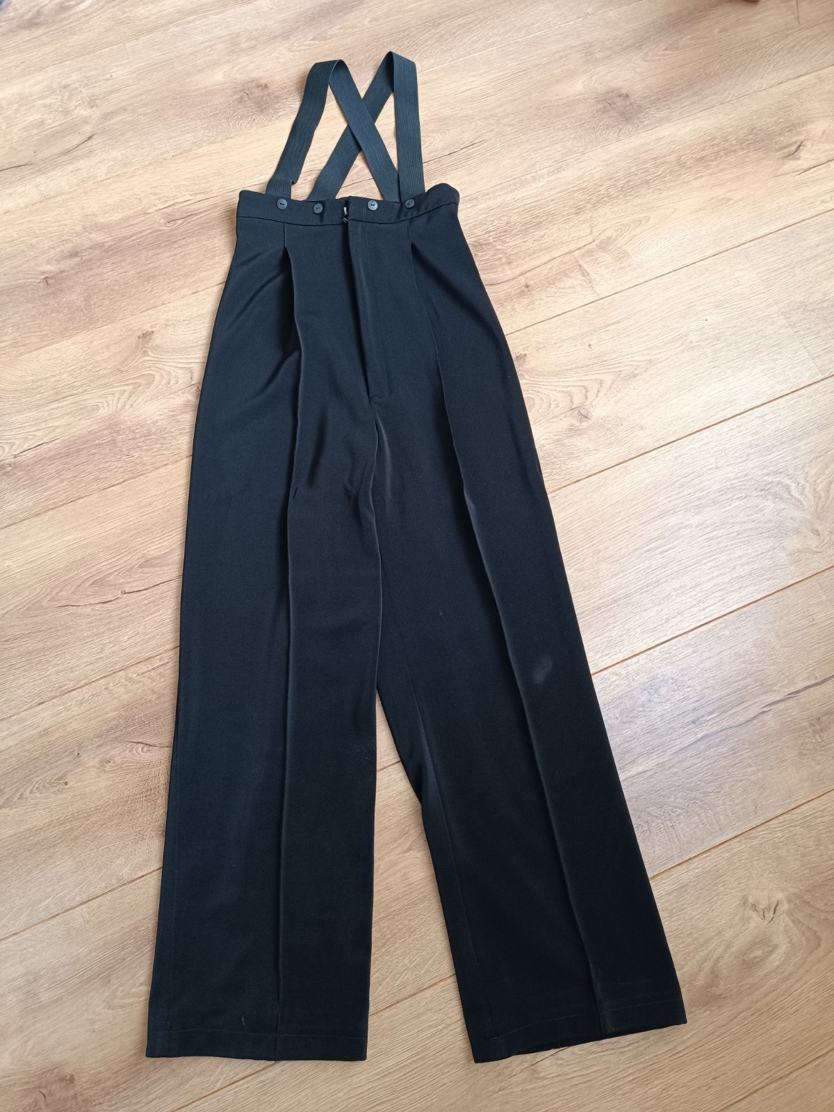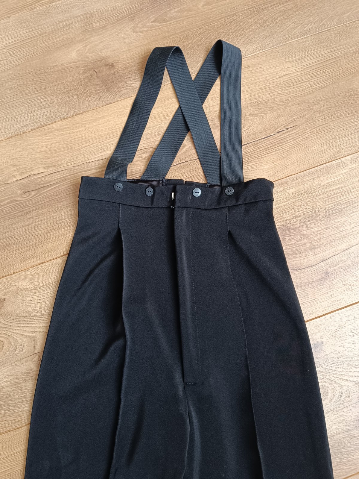 Nohavice su usite z padavej latky, s trakmi a pukmi, maju zapinanie na haciky a zips.