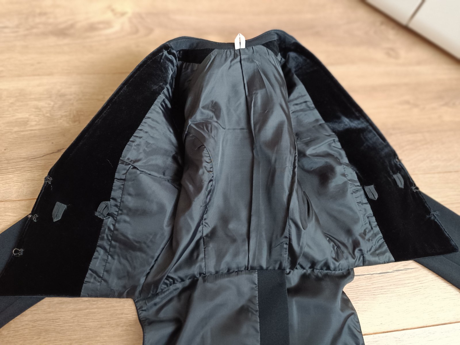 Frak je usity z padavej latky, vrchnu cast ma spevnenu so zapinanim na haciky (jedno putko pre hacik je potrebne prisit).