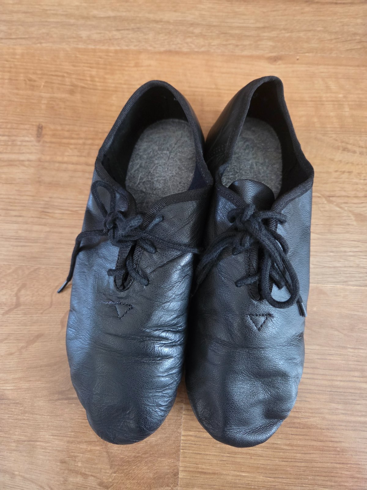 Predám čierne kožené topánky vhodné na jazz/disco dance. Pár x obuté, dobre držia na nohe, kvalitné, vel.35 1/2. VD cca 22-23cm.