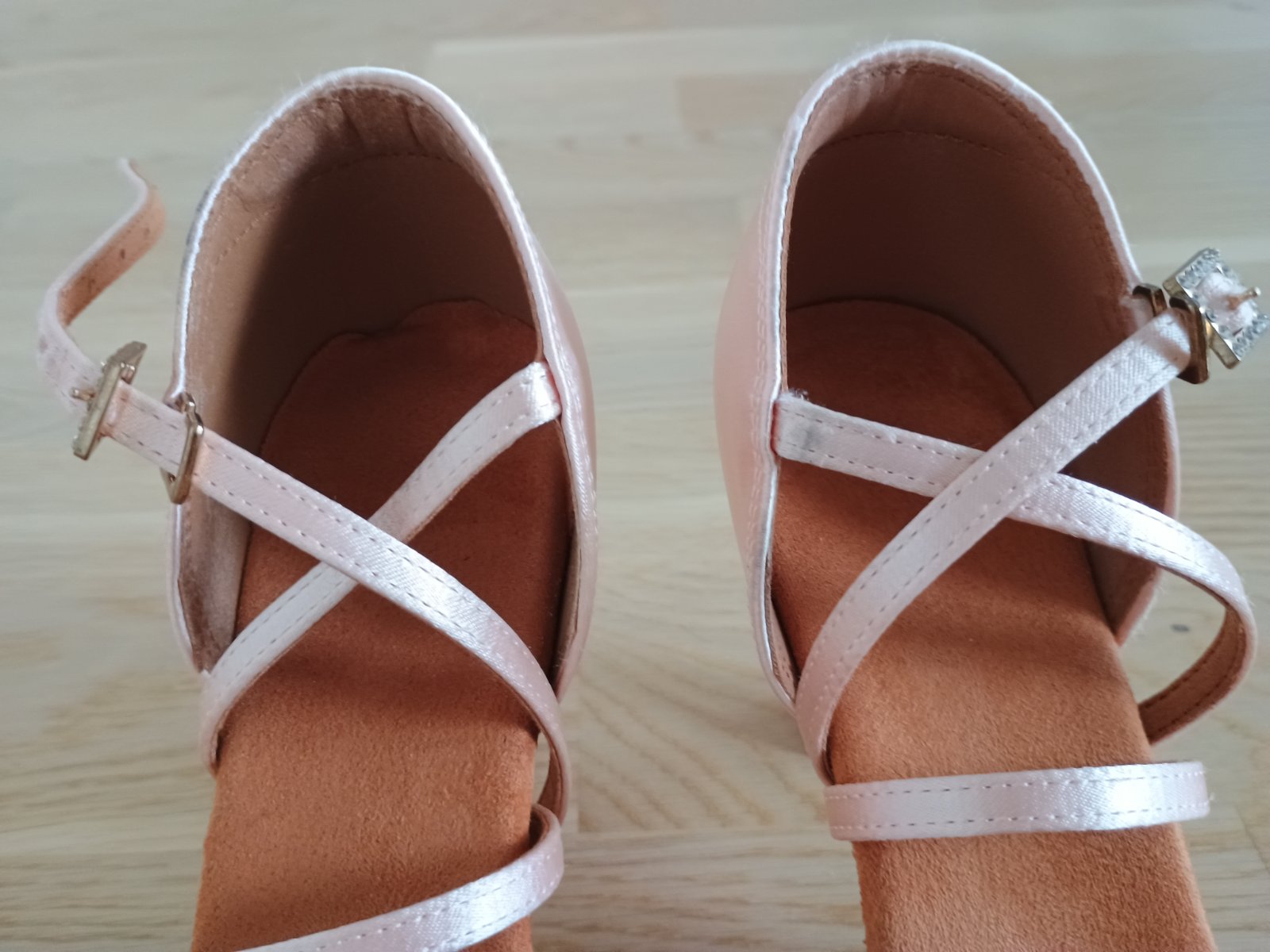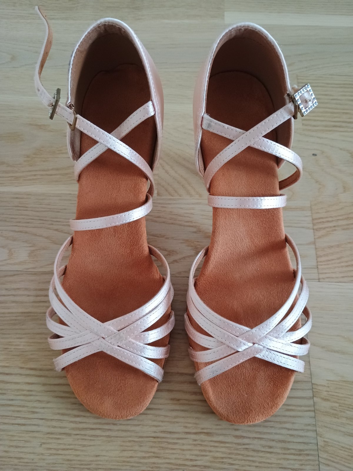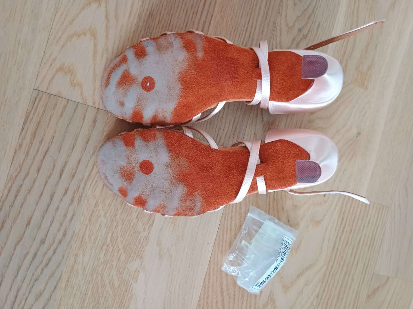 Tanečné topánky, lesklé svetloružové, aj s tlmičmi na opätku. Párkrát použité, no vo vynikajúcom stave. Veľ. 37, stielka 24 cm.