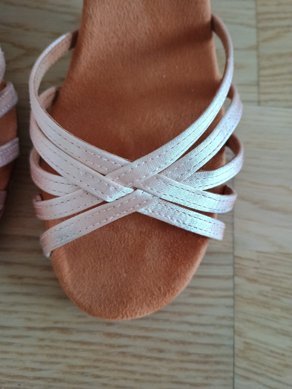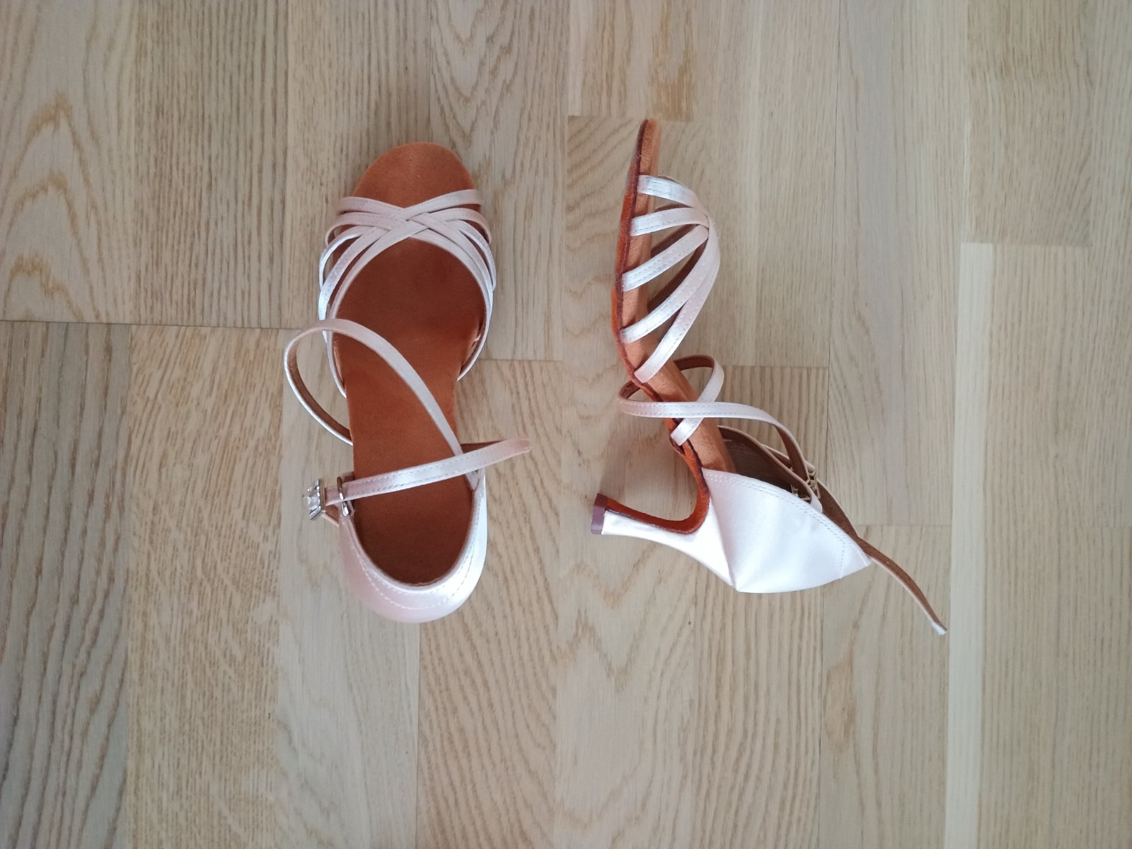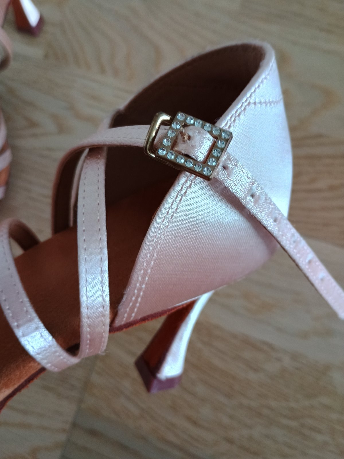 Tanečné topánky, lesklé svetloružové, aj s tlmičmi na opätku. Párkrát použité, no vo vynikajúcom stave. Veľ. 37, stielka 24 cm.