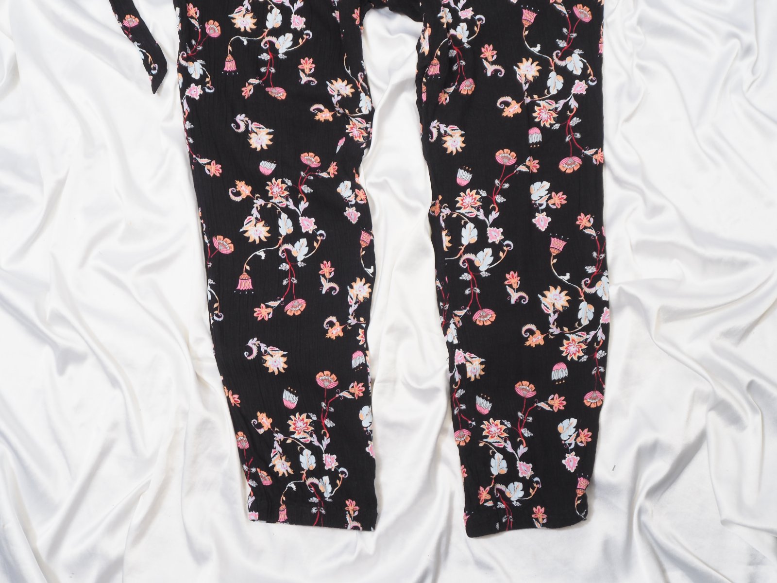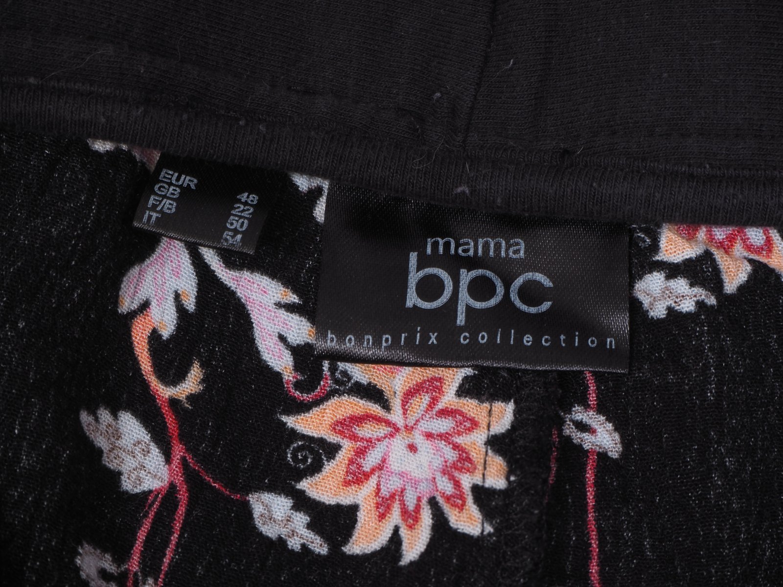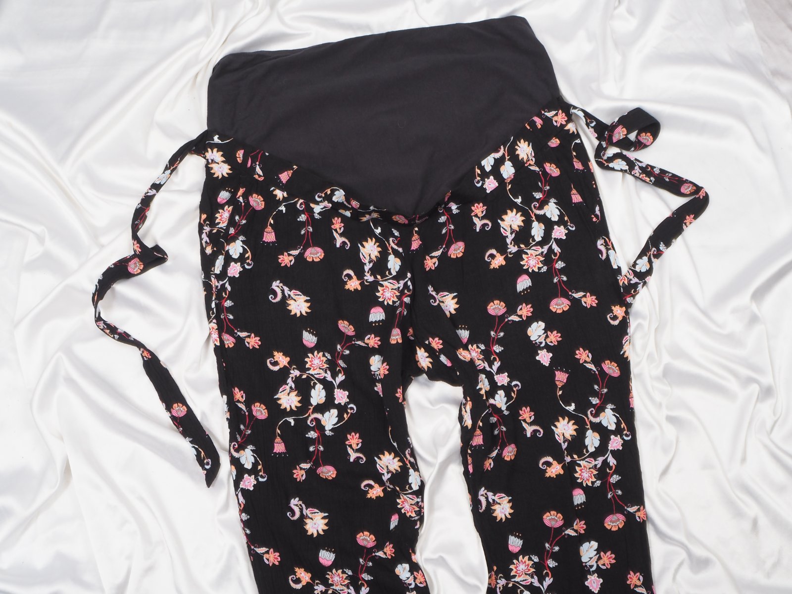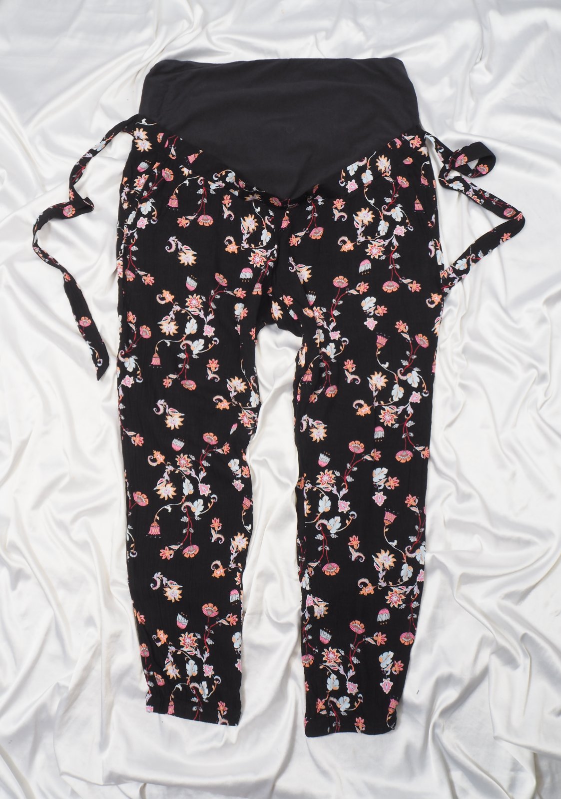 Kvalitné tehotenské nohavice čiernej farby so vzorom, patentový tehotenský pás, v páse všitý opasok, materiál 100% viskóza, super stav.