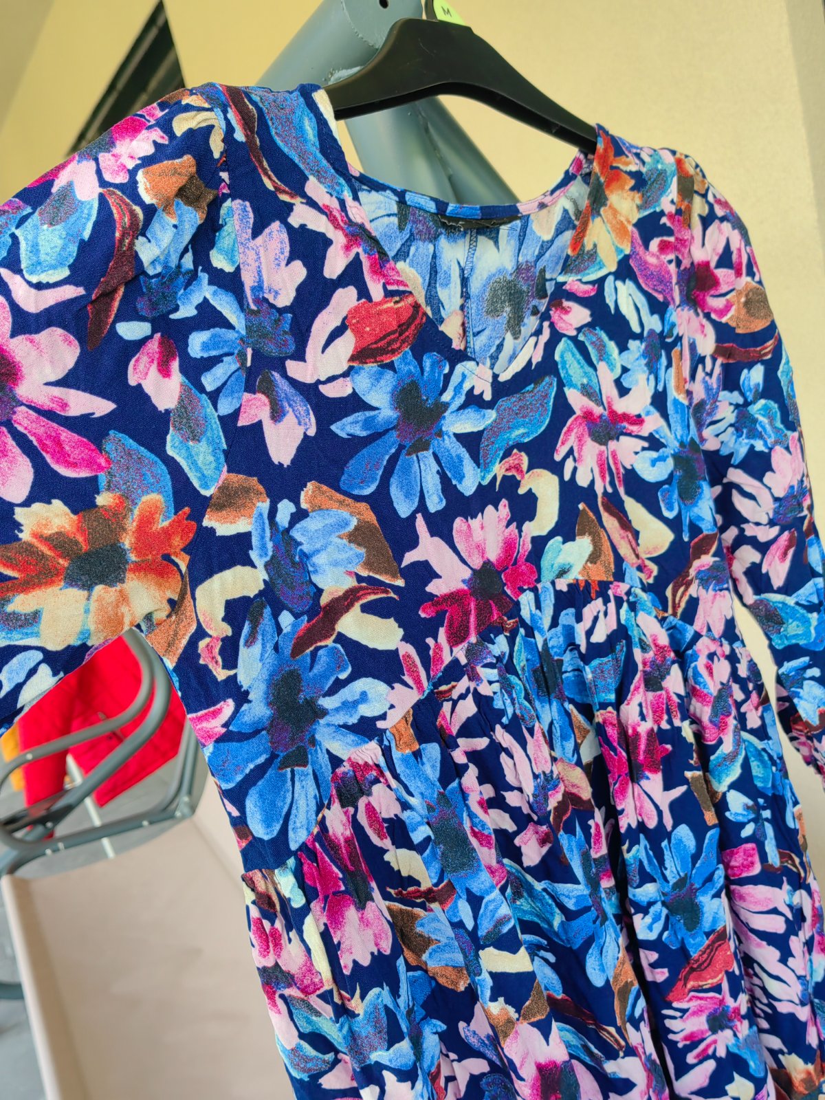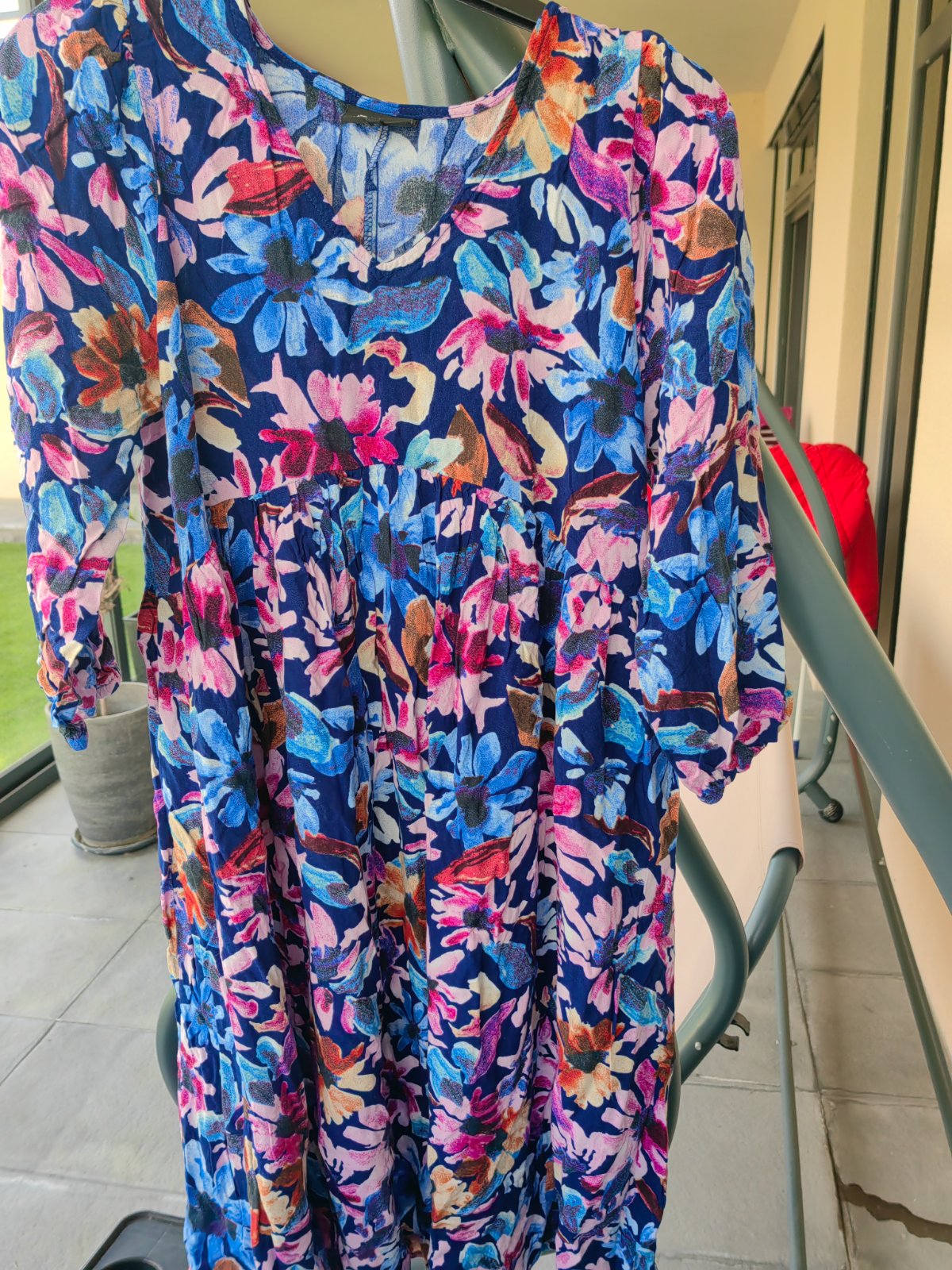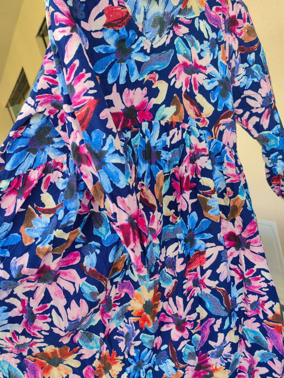 Ľahké, pružné šaty v páse prestrihnuté ,viazanie na šnúrku, krátky rukáv zakončený do gumy, po bokoch vrecká. Bez poškodenia,v top stave.