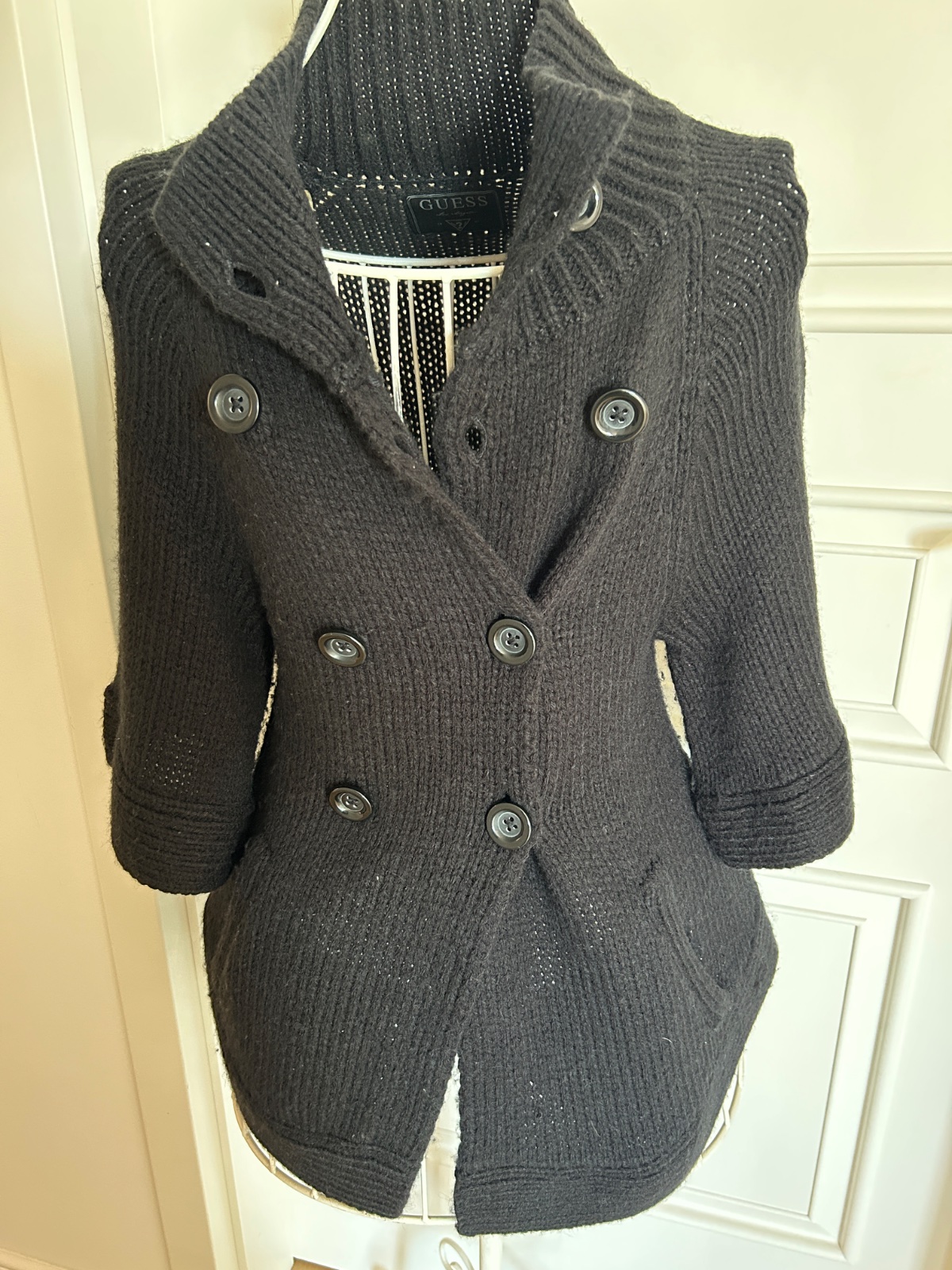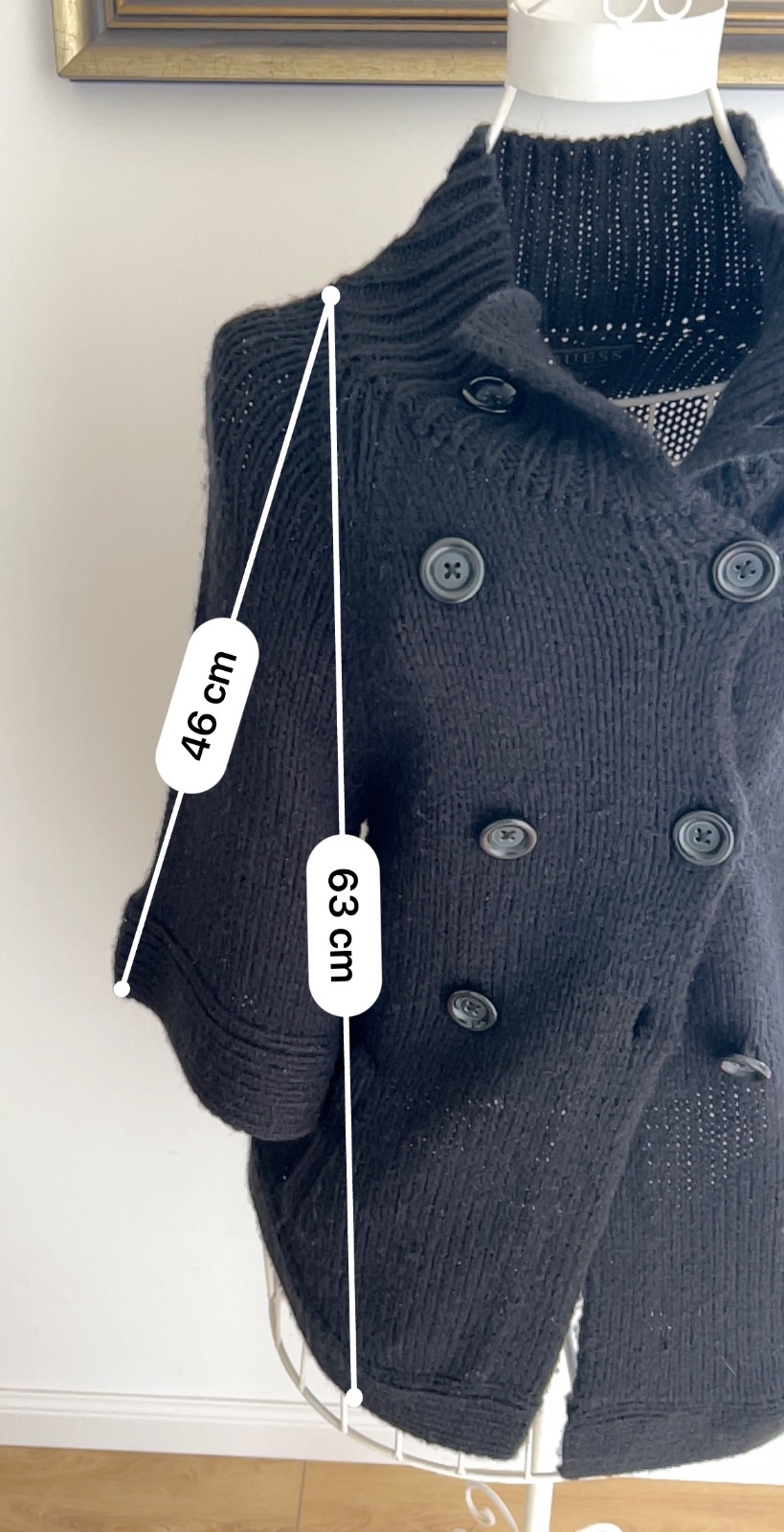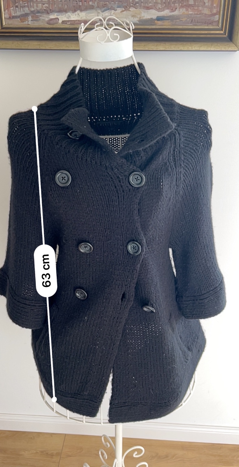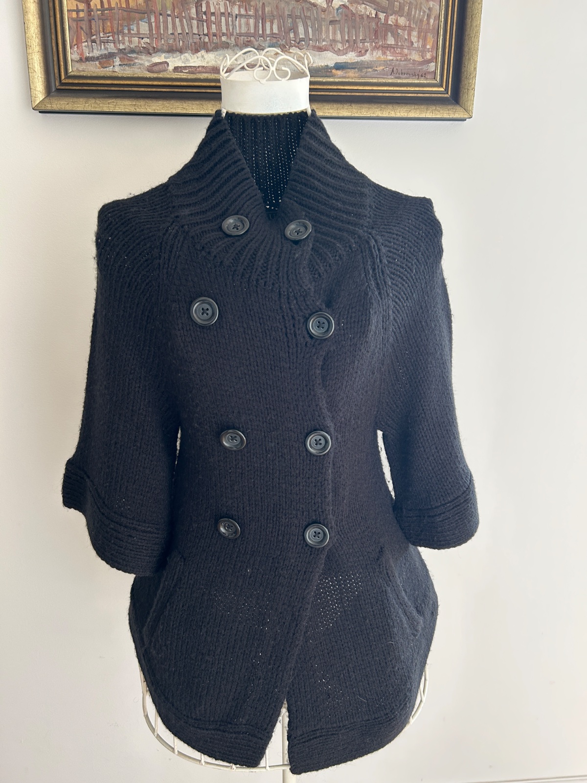 Vyborny stav,parkrat obleceny, bez poskodeni,akurat sa mi stratila snurka vlnena ako opasok, je sytej ciernej farby,je to vlna...foto skresluje.