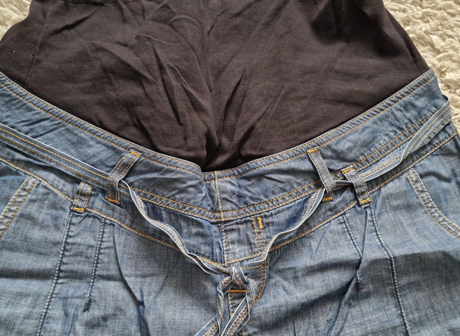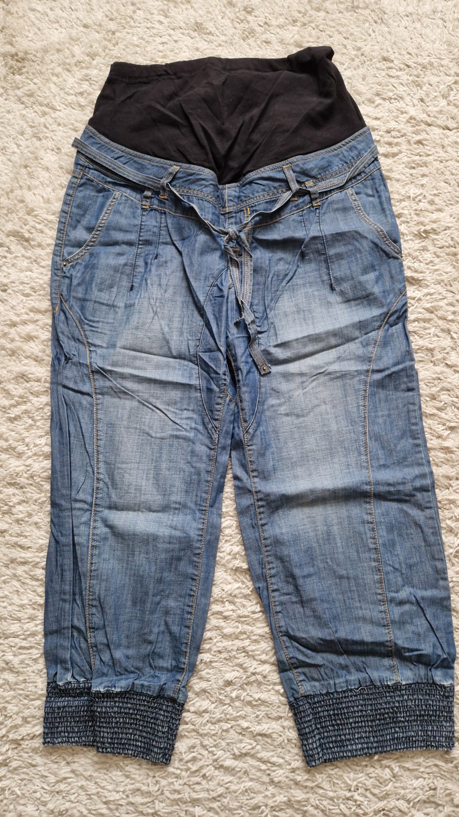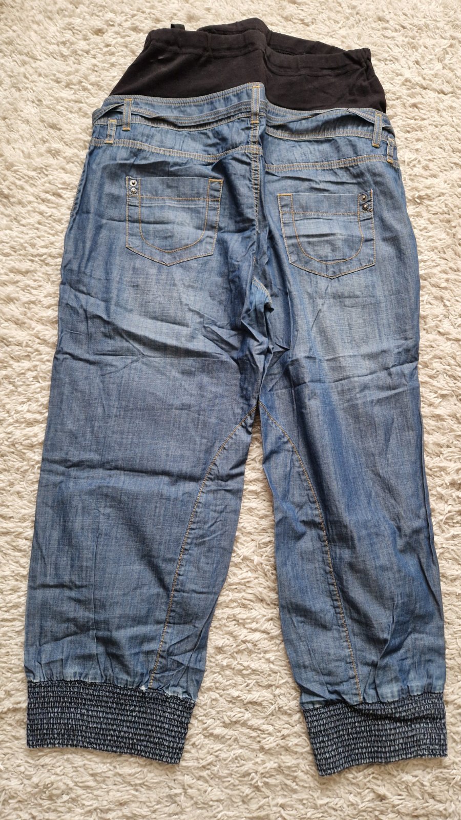 Tehotenské nohavice tenké 40, tenké, nosené, akurát dole na patente na spodu na zadnej strane sú troška predraté, vo vnútri sú rozpárané-viď foto