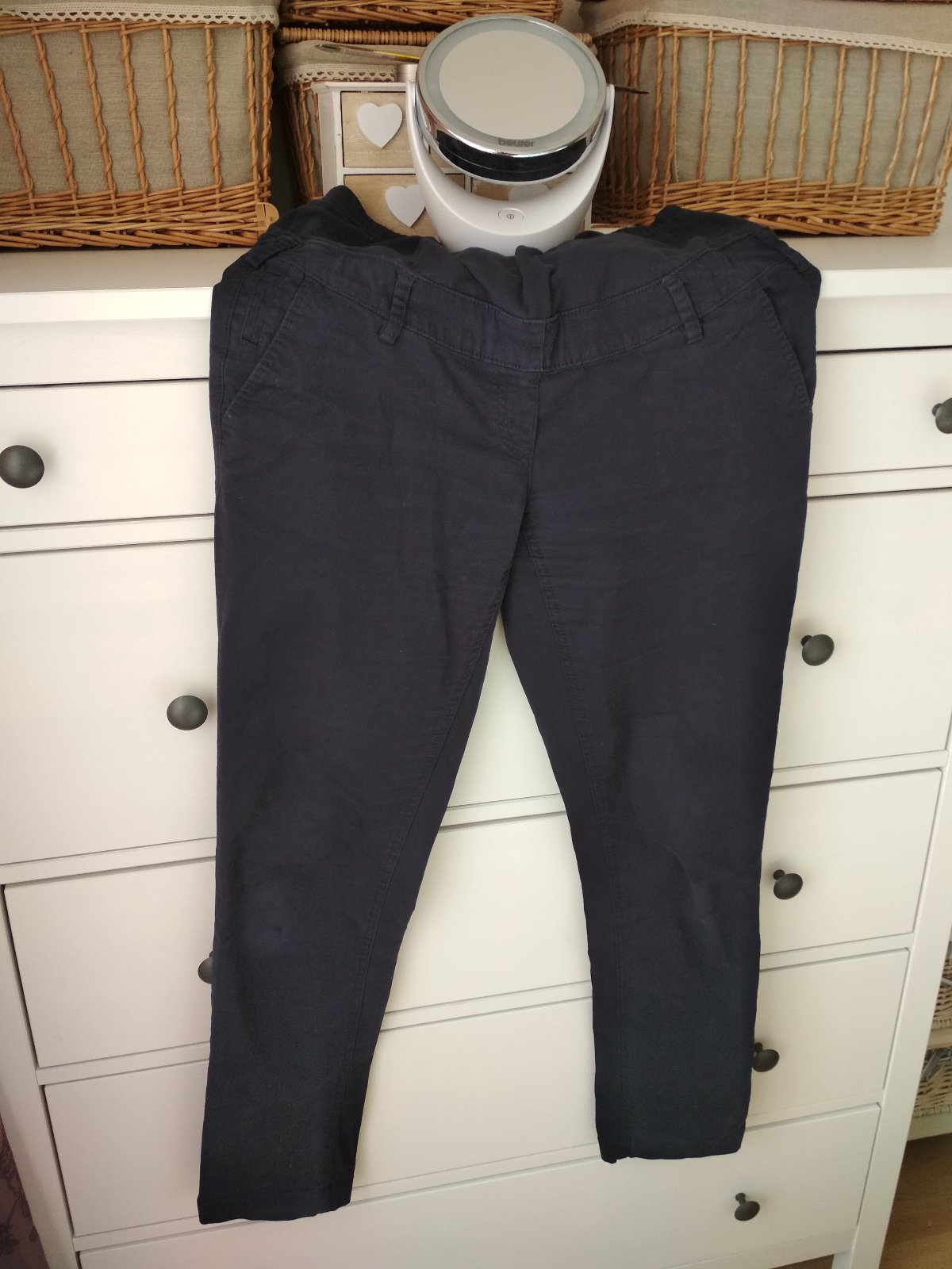 TOP stav. Oblecene parkrat. Hrubsie nohavice velkost 38. Ideálne na jeseň (v októbri som nosila) ale určite aj na zimu. Nosene chvilku v 3. trimesteri . Vhodne do vysky 164 cm. Nevyblednuta tmavomodra. Kupovane v C&A.