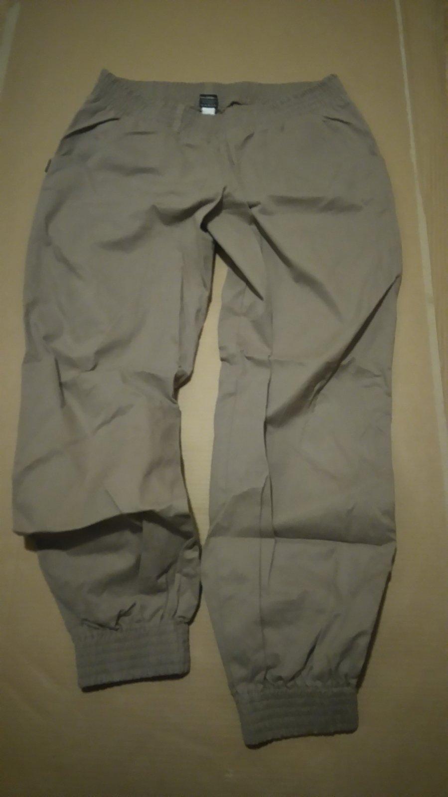 Nosené nohavice ale v peknom nepoškodenom stave. Kvalitné, sú béžovej farby z príjemnej bavlny 95 % a 5 % elastan. Tehotenský pás je regulov juateľný gumičkou s gombíkom. Značka Due. Veľkosť sa uvá...
