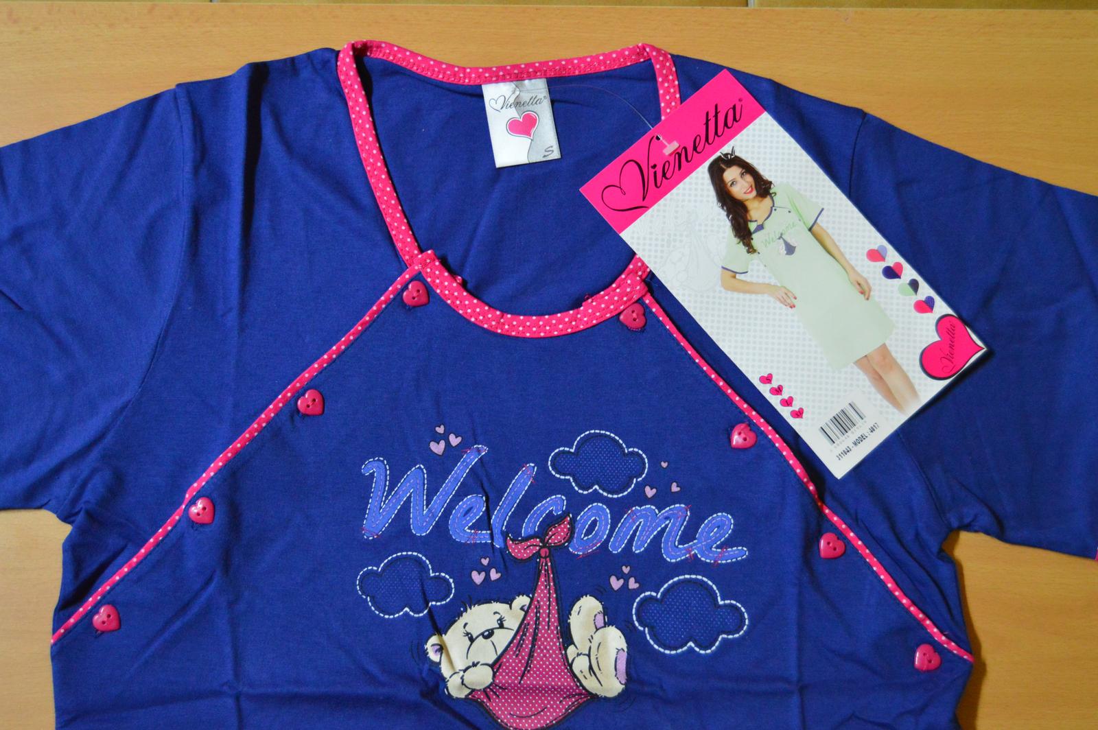 Nočnú košeľu zdobia malé vtáky. Košeľa je určená na dojčenie, v oblasti pŕs má otvory zapnuté na gombíky. Materská košeľa je vďaka voľnejšiemu strihu vhodná aj v tehotenstve a do pôrodnice. Župan má trojštvrťové rukávy, je potlačený vtáčikmi a zaväzuje sa pásikom, na prednom diele sú našité dve vrecká. Bavlnený materiál je poddajný a jemný na dotyk. Dámsky komplet je vhodný aj na denné nosenie.