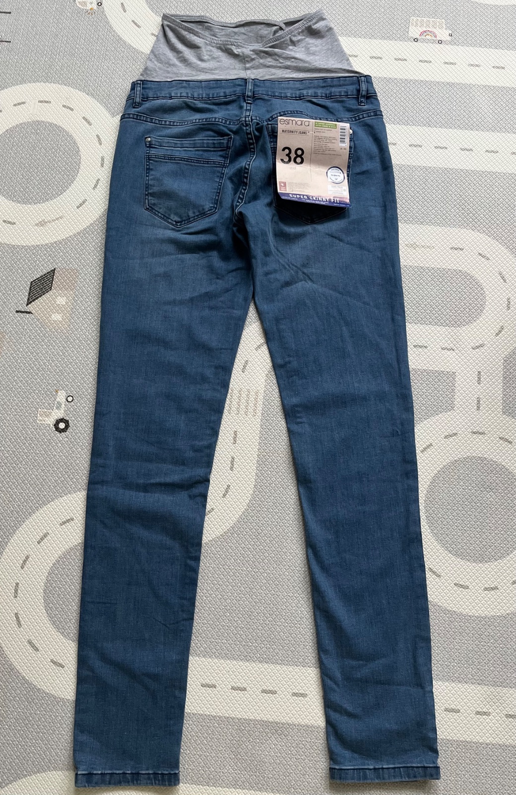 Nové, nenosené (len opraté) rifle zn. Esmara. Klasické modré, cez bruško bavlnený pás. Na bokoch sa dá šírka ešte trošku regulovať. Veľkosť 38