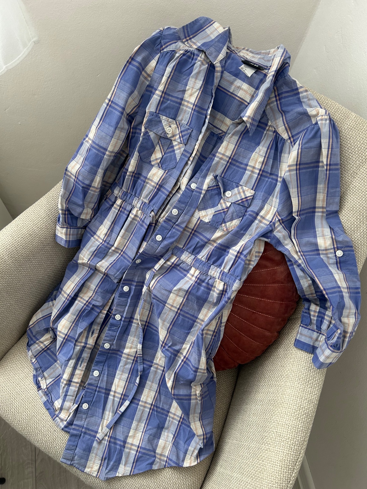 - H&M modrá predĺžená košeľa karo, krátky rukáv, skryté vrecká na bokoch, sťahovanie v páse, ľahulinká bavlna, zmestí sa bruško aj v treťom trimestri