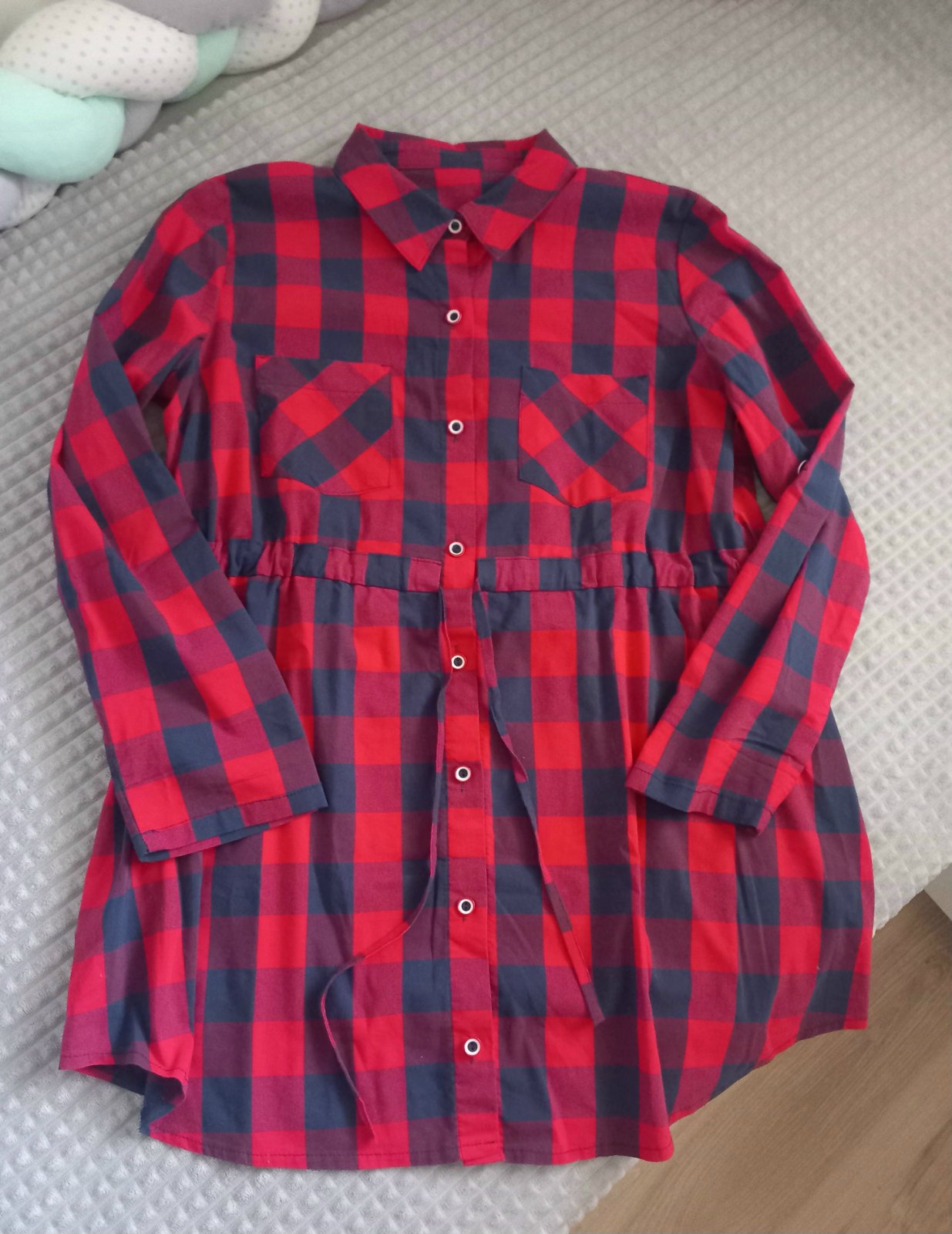Predám krásnu tehotenskú košeľu, v top stave. Rukávy sa dajú vyhrnúť na trojštvrťové. Farba krásna tmavočervená, foto je trochu zosvetlené.