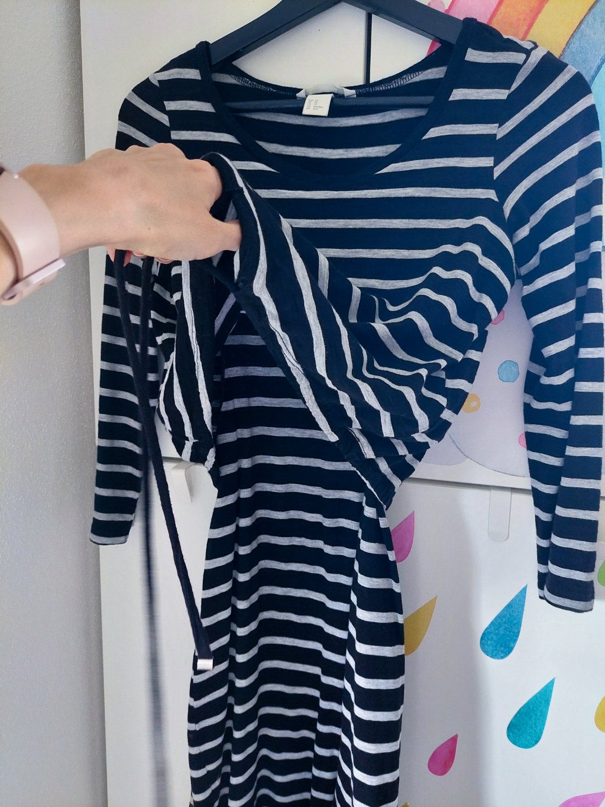 Tmavomodre saty s bielymi bodkami znacka H&M velkost XS, s moznostou na kojenie, malo nosene.bez akychkolvek poskodeni. Dlzka cca 88 cm.poslem packetou.
