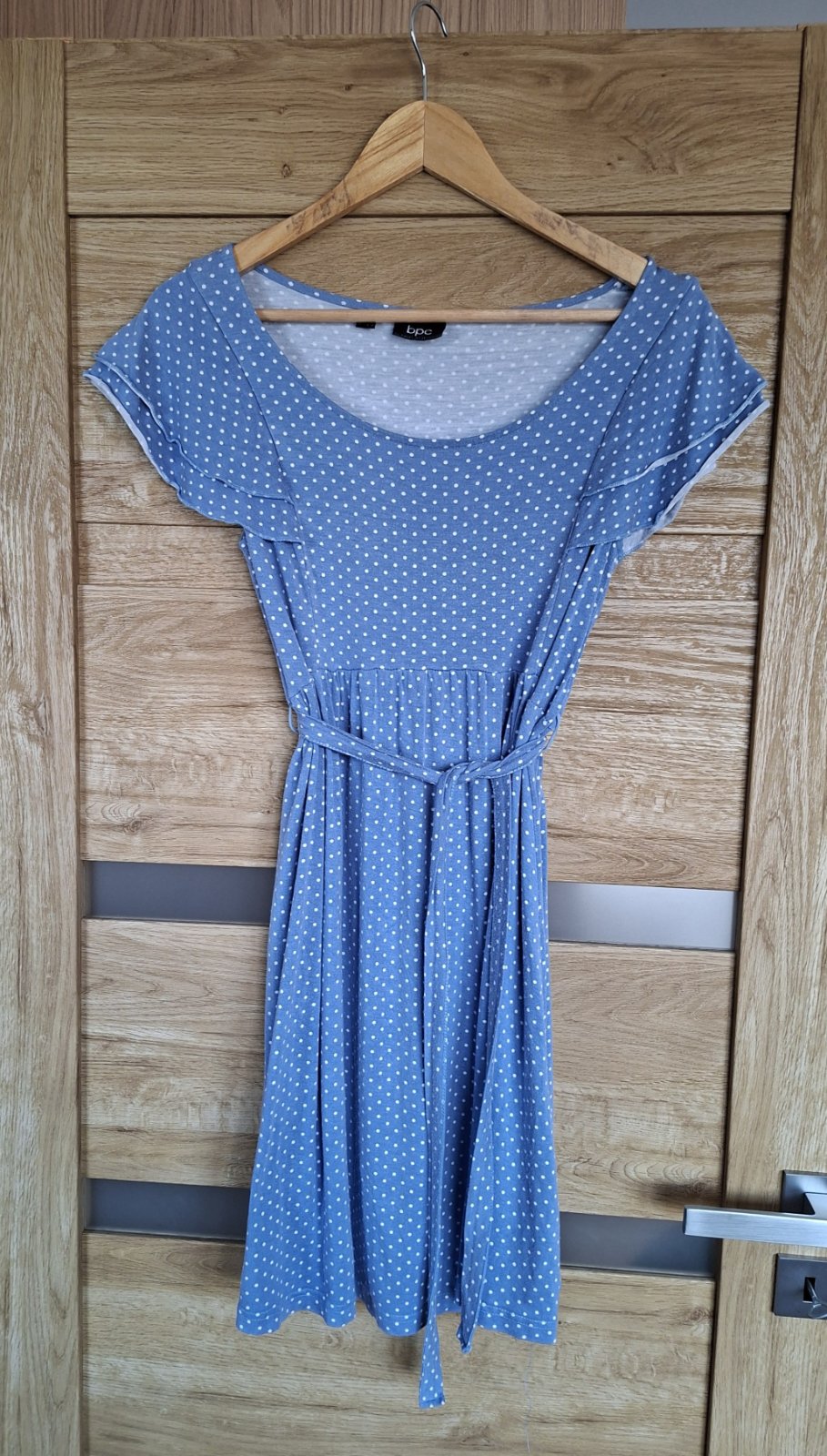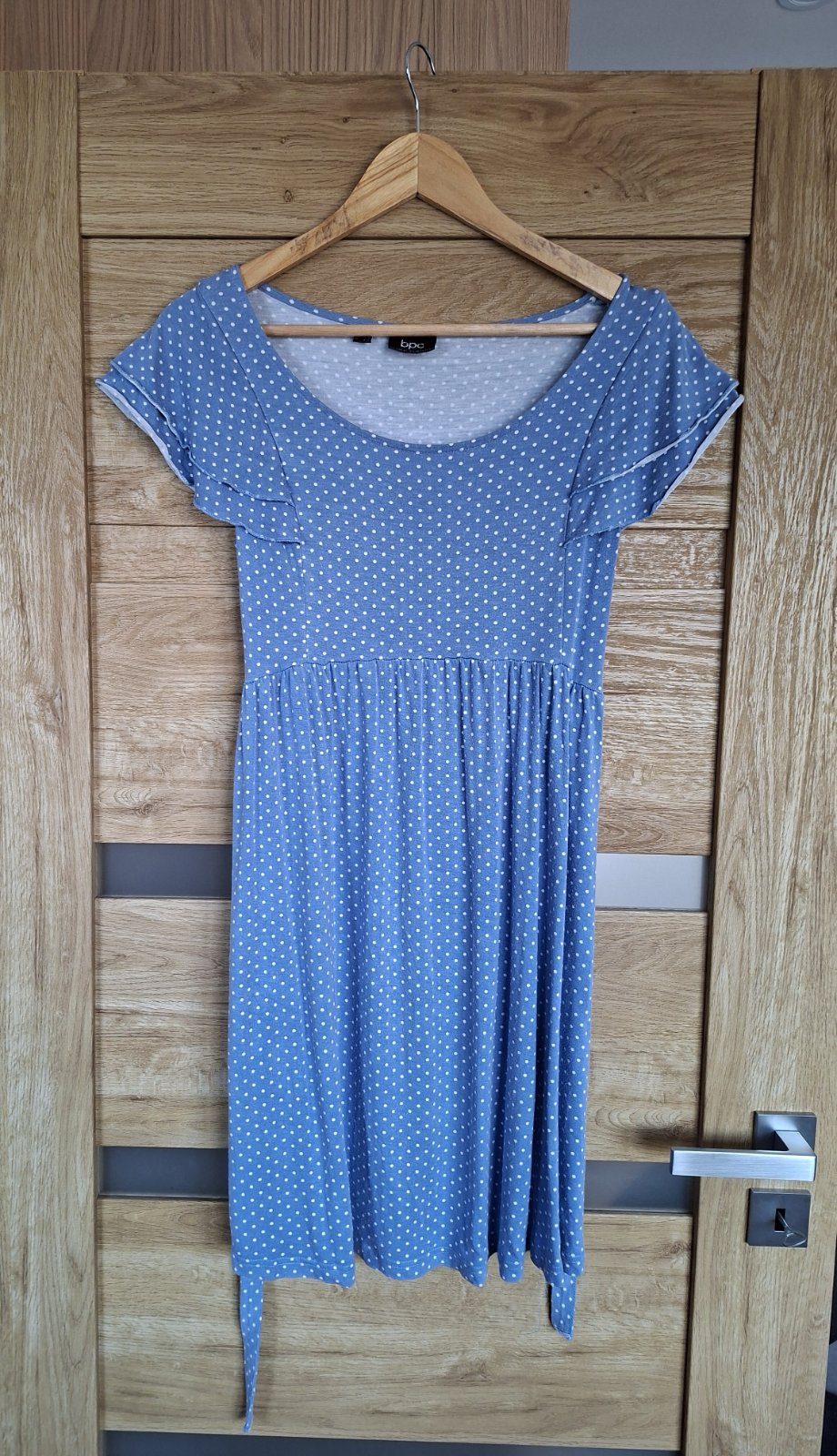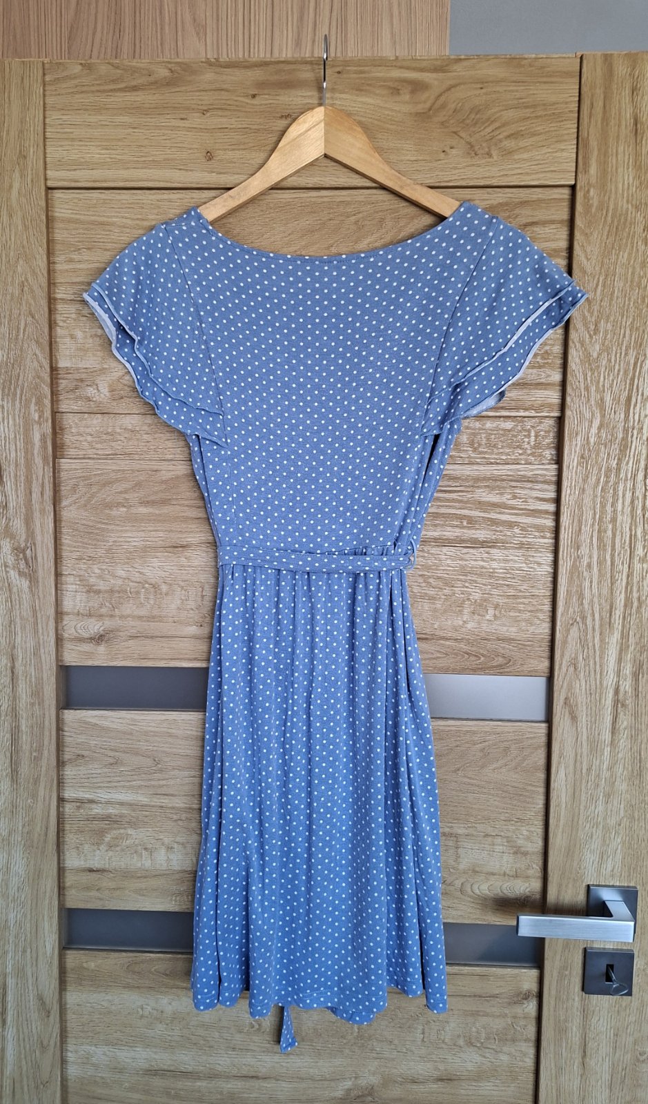 Materské úpletové šaty v dobrom nosenom stave (bez dierok a fliačikov; viditeľne spraté (detail viď foto č.1-3)). Šaty majú pohodlný strih; vďaka elastickému viskózovému materiálu, riaseniam a zaväzovaniu na šnúrku sa pekne prispôsobia nielen tehotenskej, ale i popôrodnej postave. Šaty majú okrúhly výstrih, krátke rukávy a dĺžku po kolená.