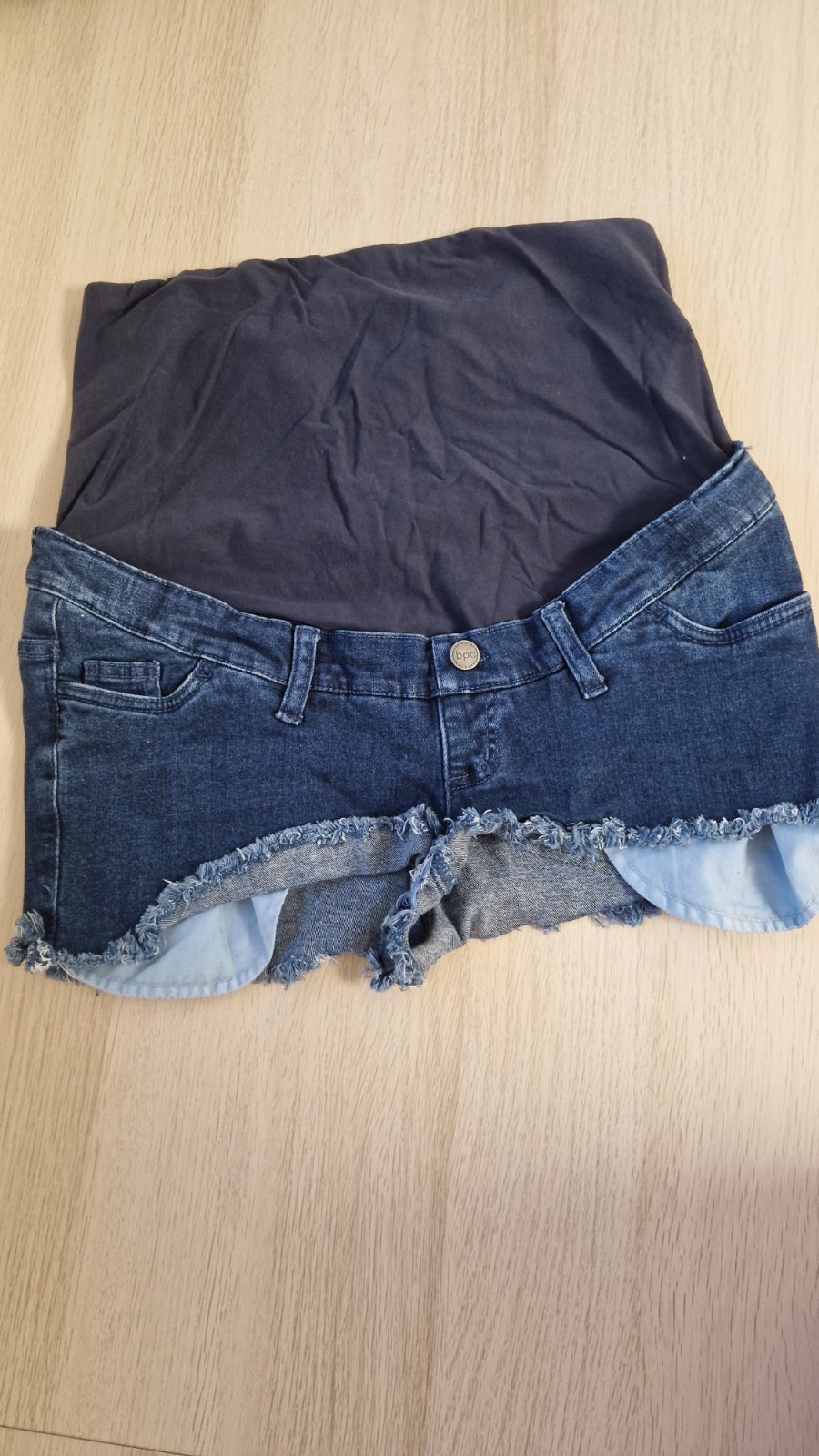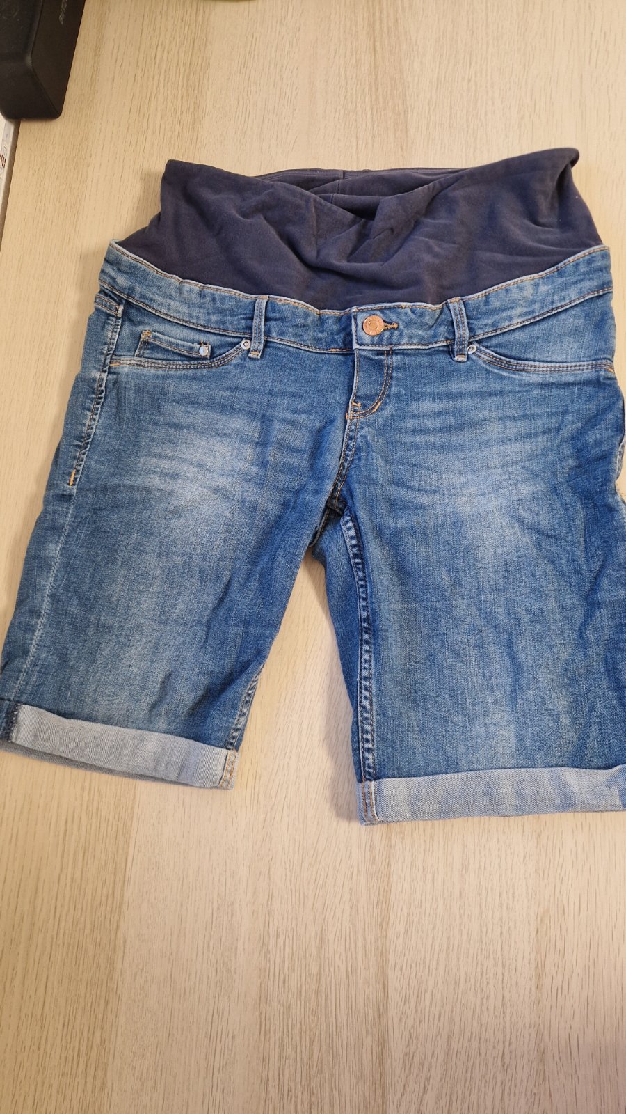 Veľmi pohodlné kraťase, z tenkej, elastickej rifloviny, bermudového strihu, na stehnách širšie, takže nikde netlačia. Majú bavlnený tehotenský pás. Kraťase sú v peknom nosenom stave.