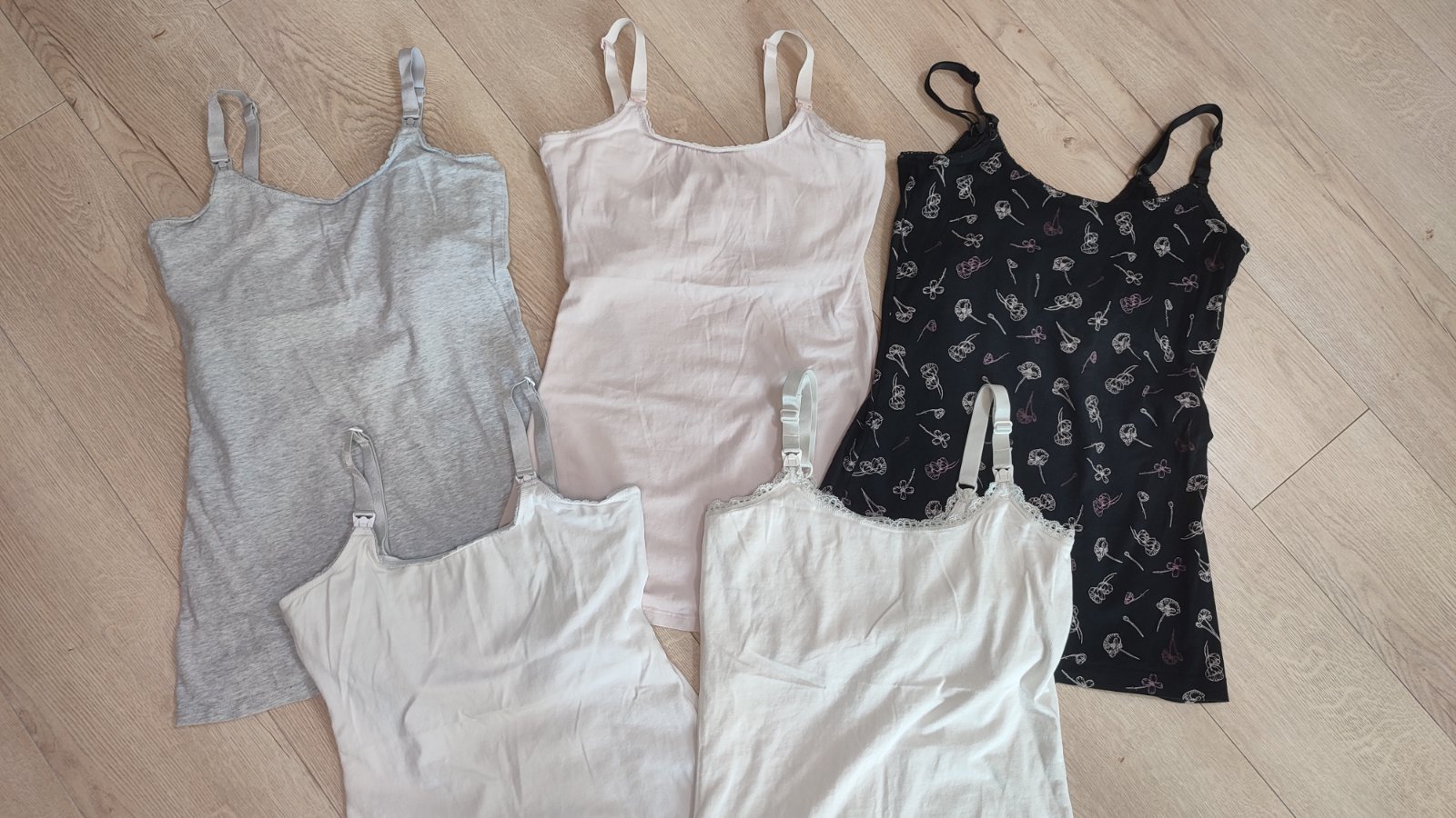Predám 5ks tielok na dojčenie, málo používané, značka Esmara(Lidl), príjemné, bavlnené, všetky sú veľkosť 36/38, rozmery som nafotila na jednom čiernom tielku. Dve tielka sú tam biele, z toho jedno má našedle ramienka, inak je v pohode. Všetky sú bez chyby, funkčné, odopinatelny vrch na prsiach. Cena je 15€+ poštovné za všetky spolu alebo jednotlivo 3€/kus+poštovné. Preferujem odber všetkých spolu.