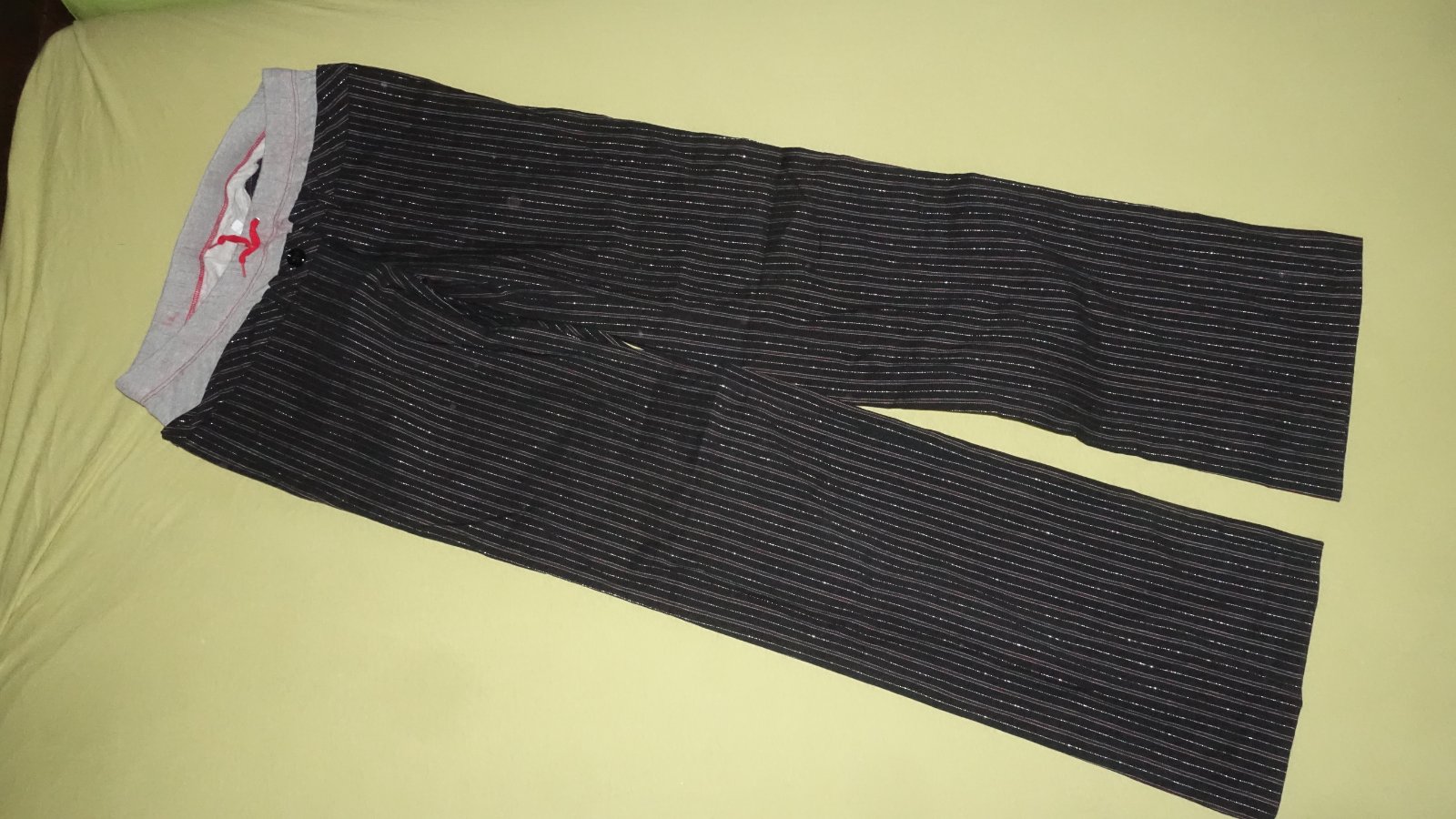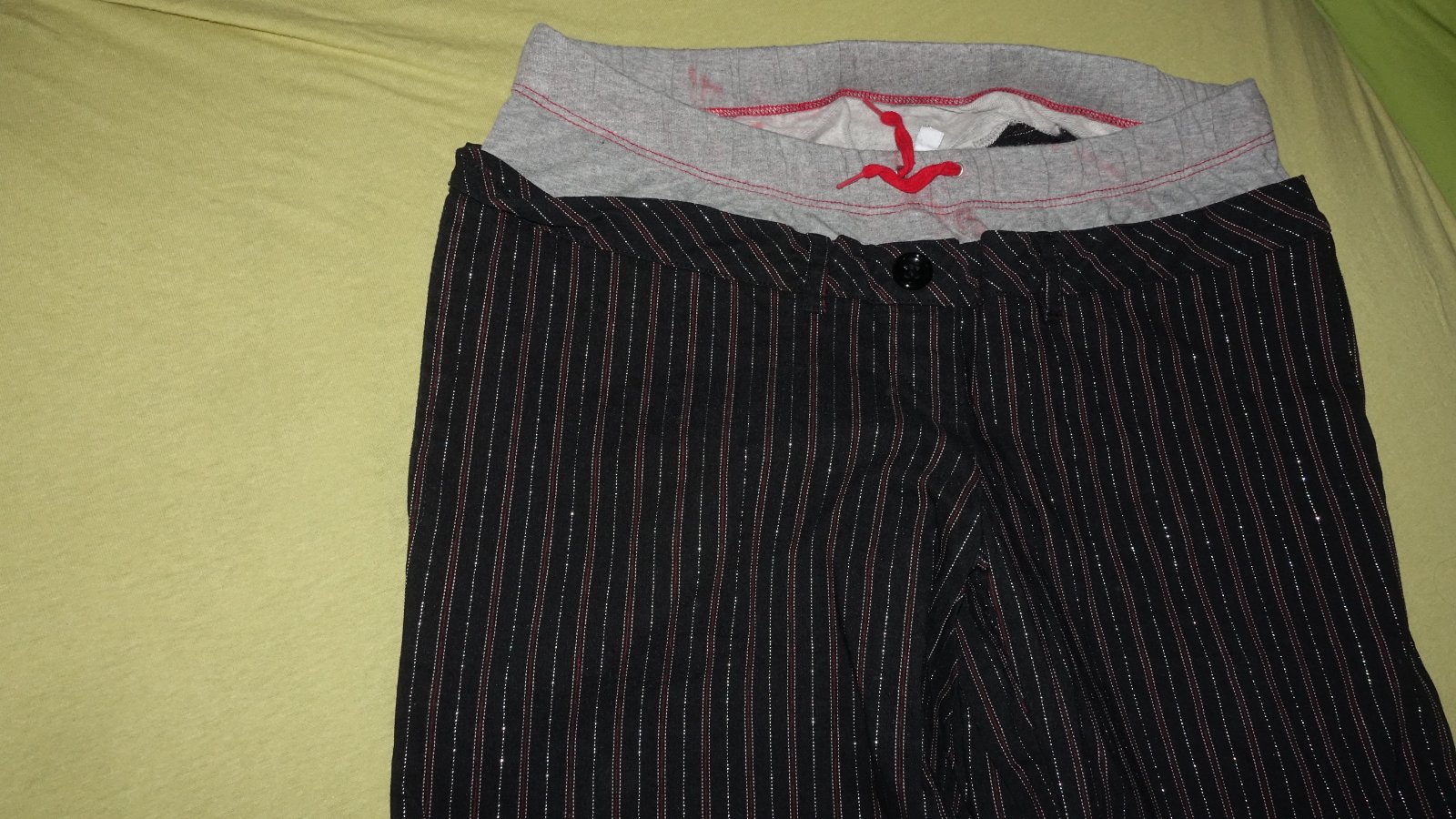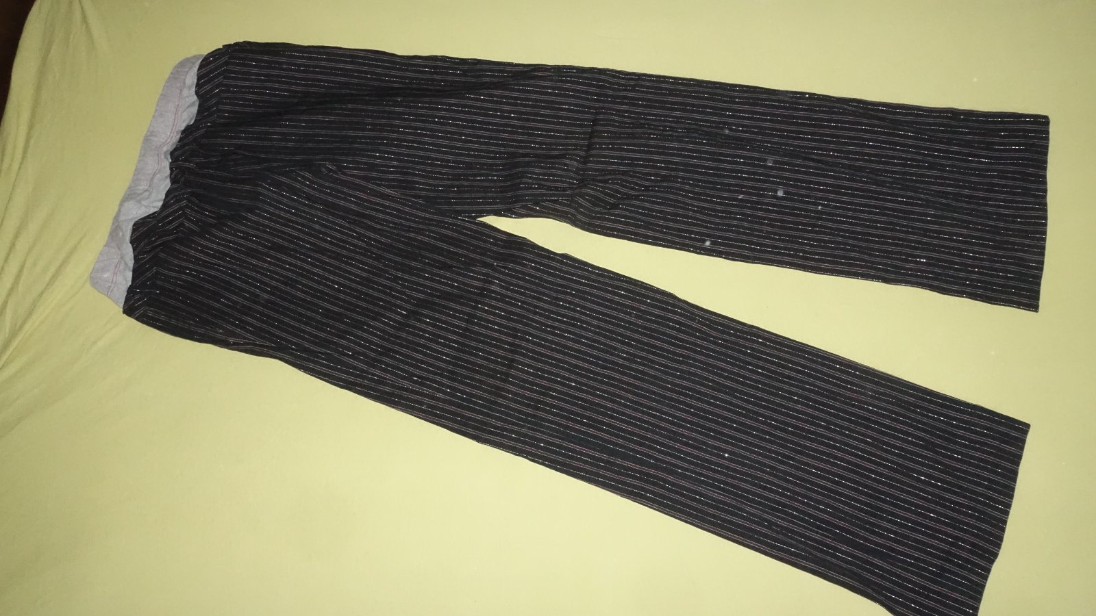 Pekne tehotenske nohavice vo velmi dobrom stave- akurat ten sedy elasticky pas je trocha zafarbeny od cevenej snurky v pase. Su take elegantnejsie, su pretkavane striebornou nitkou. Velkost je uvedena ako L, podla mna su M. Su elasticke.