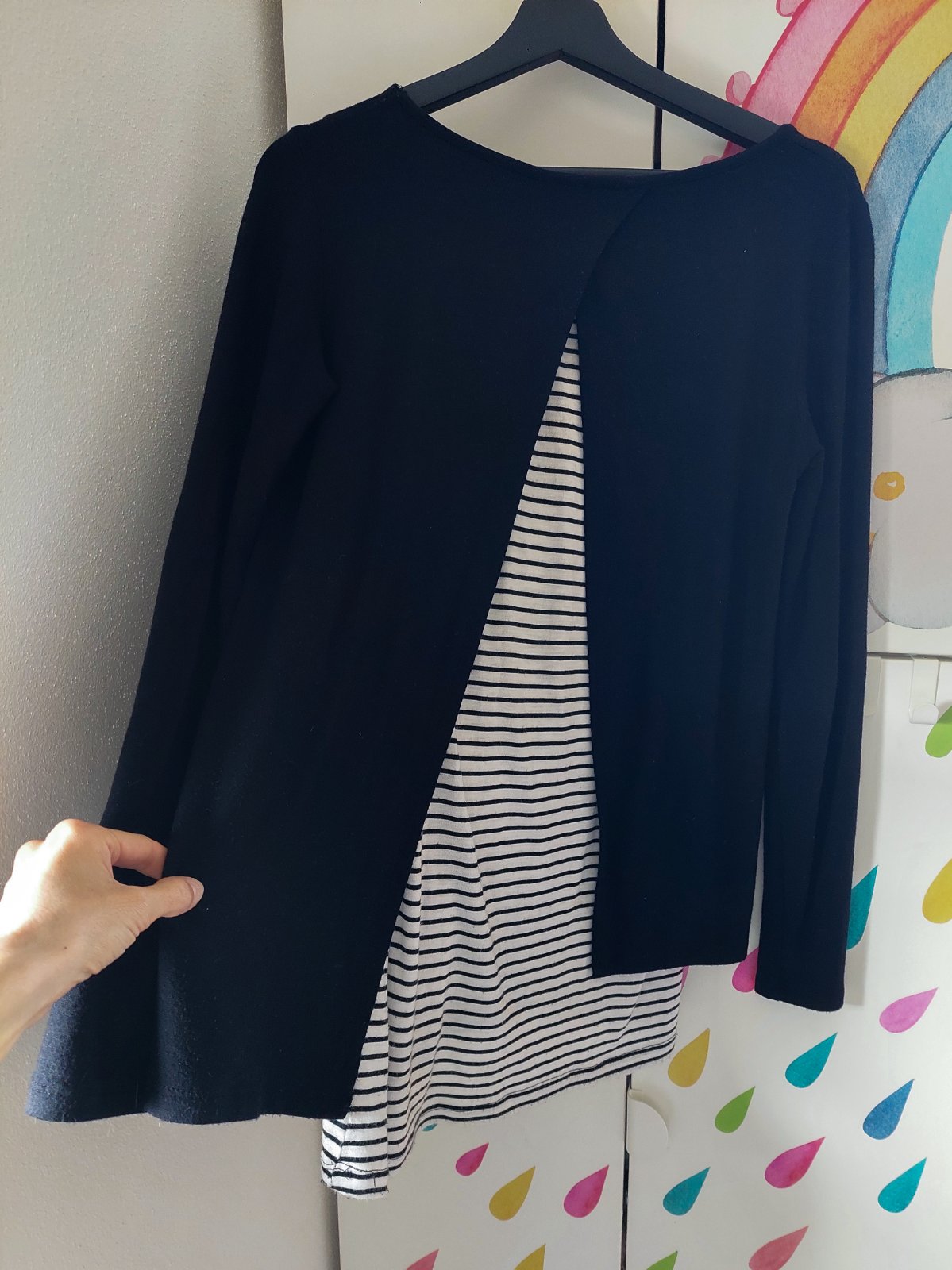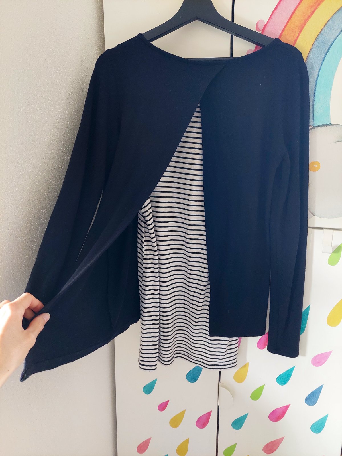 Krásny a praktický sveter pre tehotné aj dojčiace maminky. S trojštvrťovými rukávmi. Skvele vyzerá s nátelníkom alebo aj s blúzkou a úzkymi riflami. Vo veľmi dobrom nosenom stave. Akurát na ľavej s...