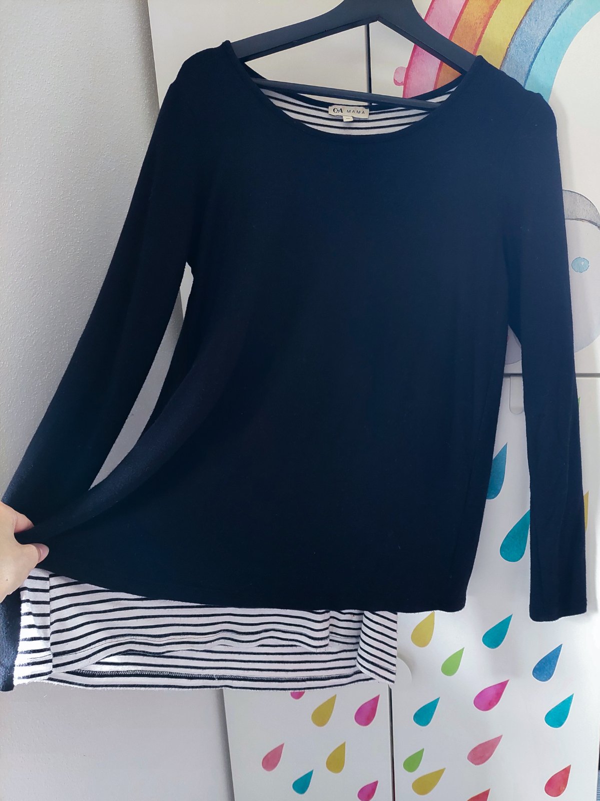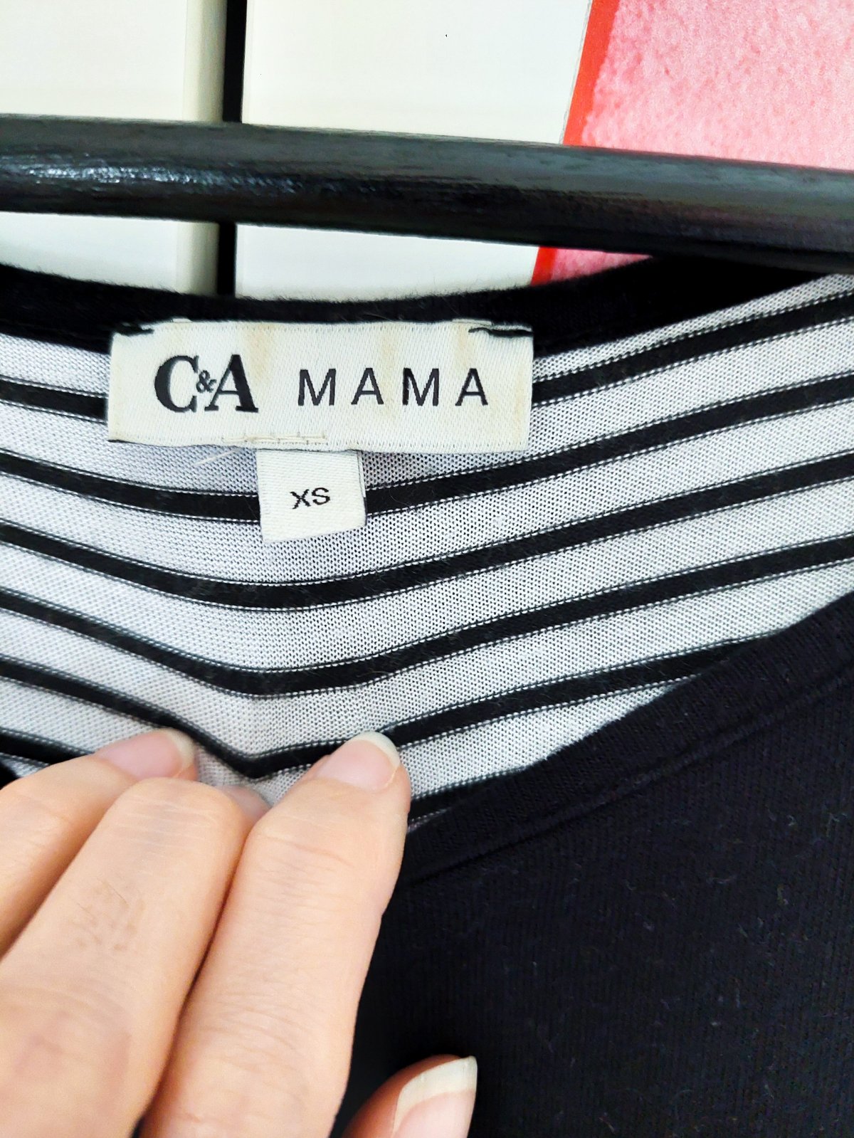 Tehotensky svetrik spolu s trickom. Oznaceny ako XS, ale sadne aj na S. Elasticka velmi prijemna latka, odporucam.
