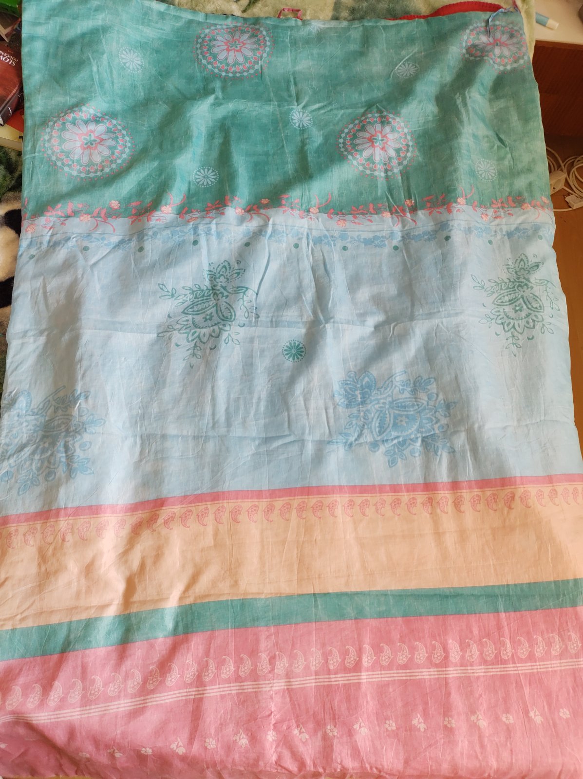 Starší, šitý, tenký prehoz na posteľ. Celkový rozmer je 200 cm dĺžka a 200 cm šírka (od strapcov po strapce). Alebo na šírku 140 cm, ak chcete mať prevys cez okraje postele (tak ako to vidno na fot...