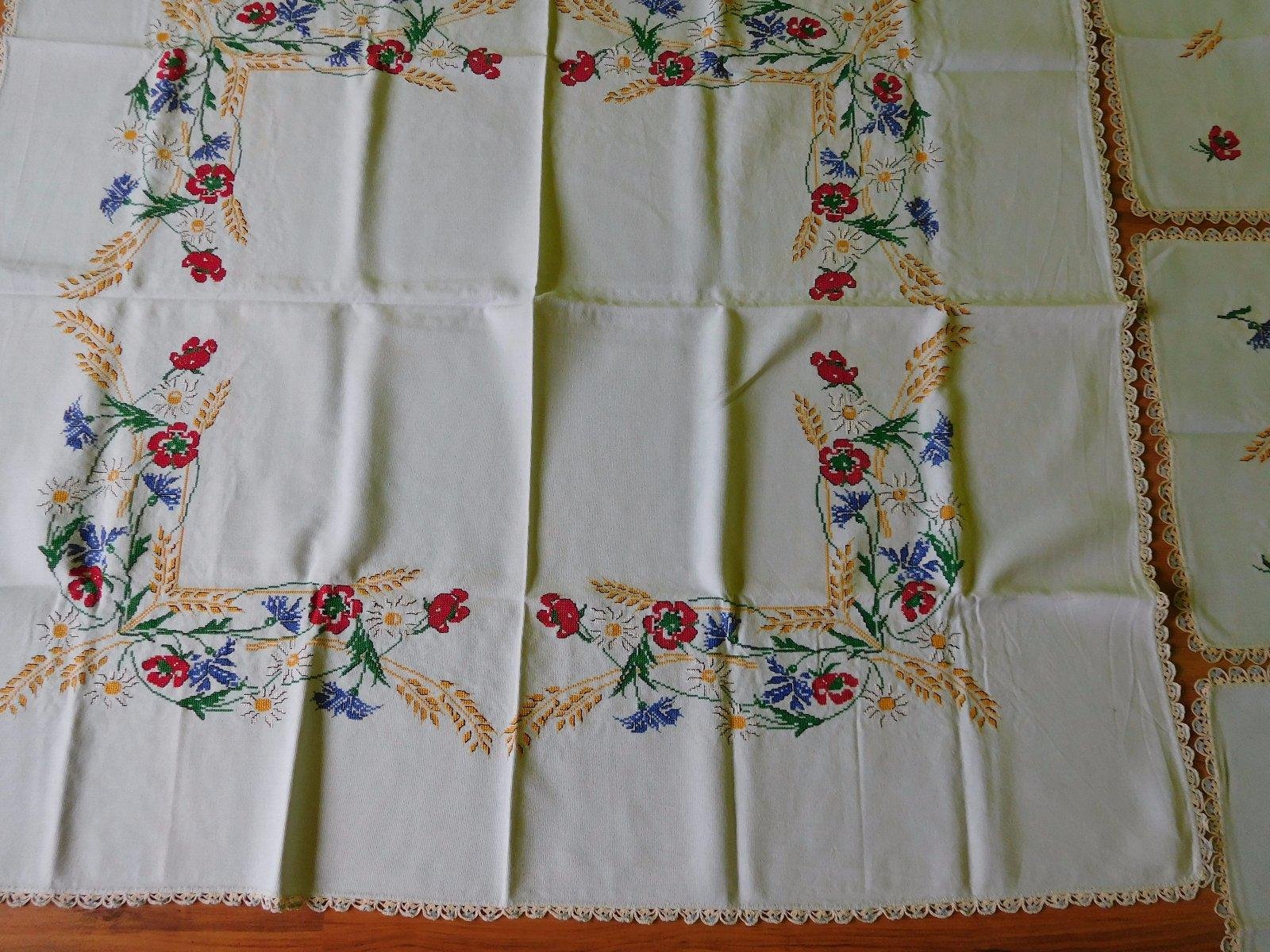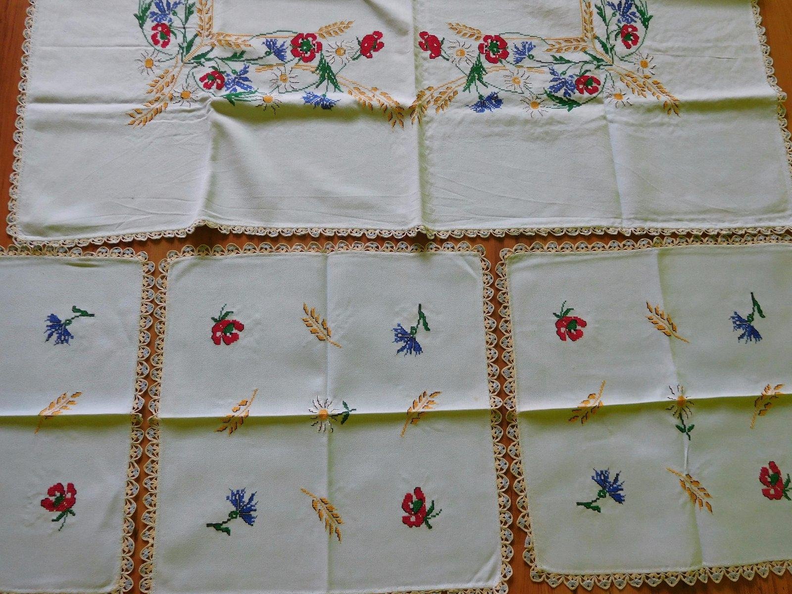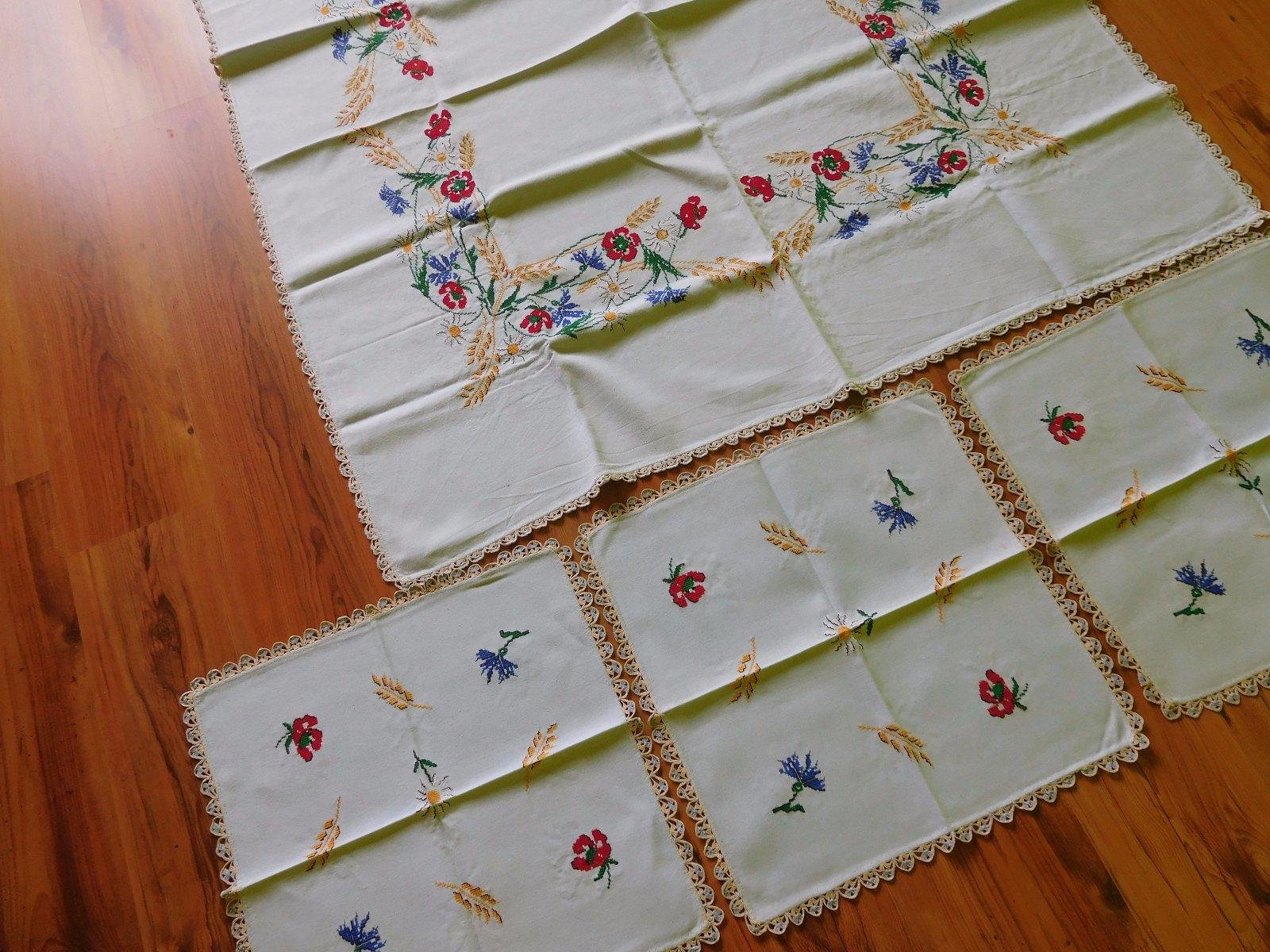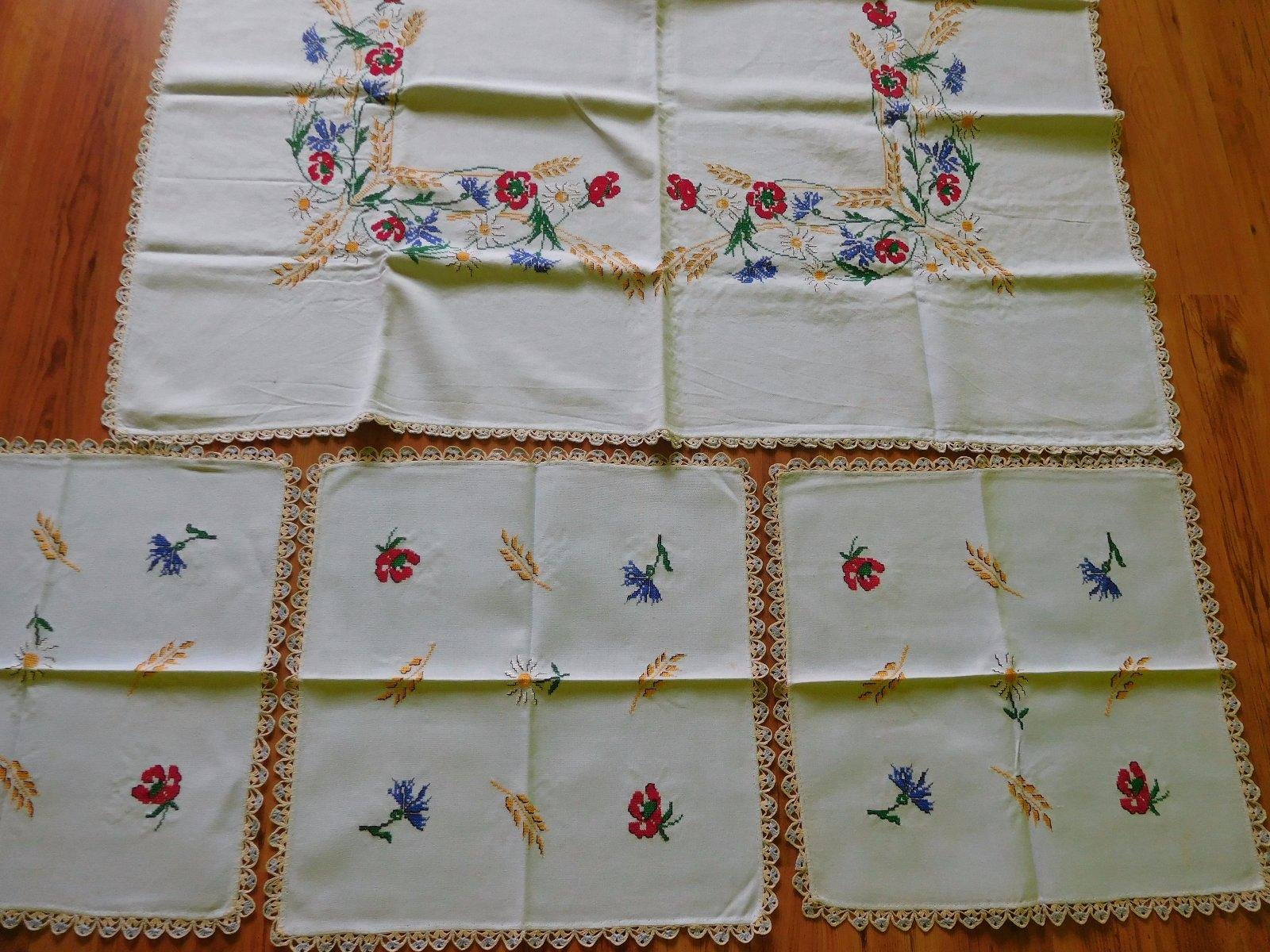 Ponúkam set ručne vyšívaných obrusov-o rozmere-kocka velká-122x135cm, kocky malé-3x-48x48cm,obrusy sú po dokončení neprané,uskladnené na suchom a tmavom mieste-v TOP TOP stave,v skutočnosti ,velmi velmi krásne,