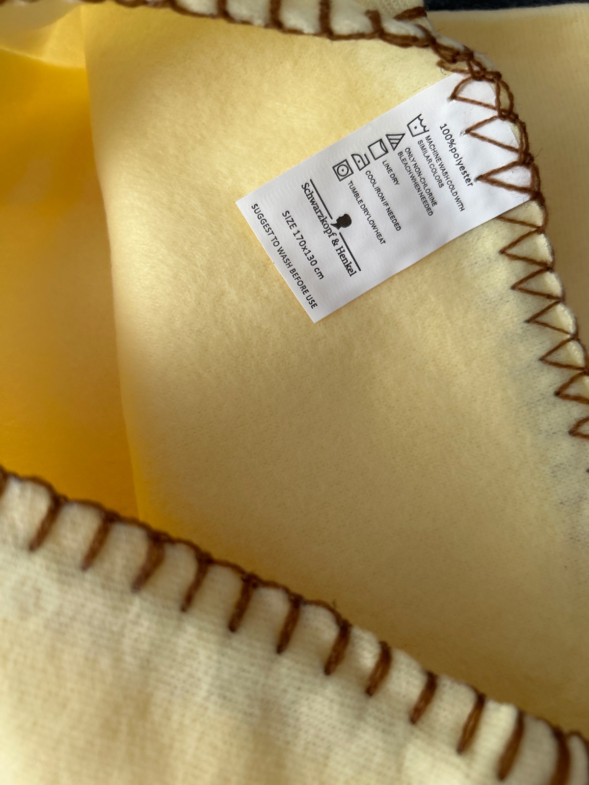 Nepoužitá bledožltá deka s hnedým šitím.