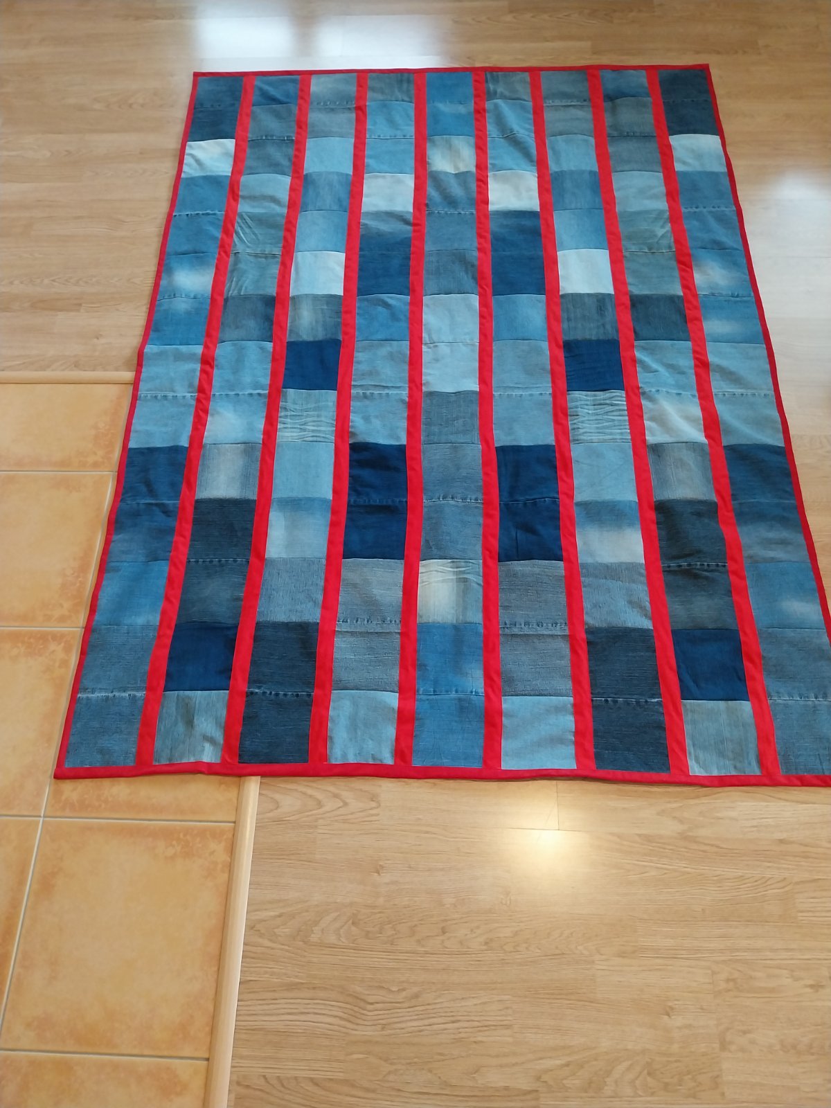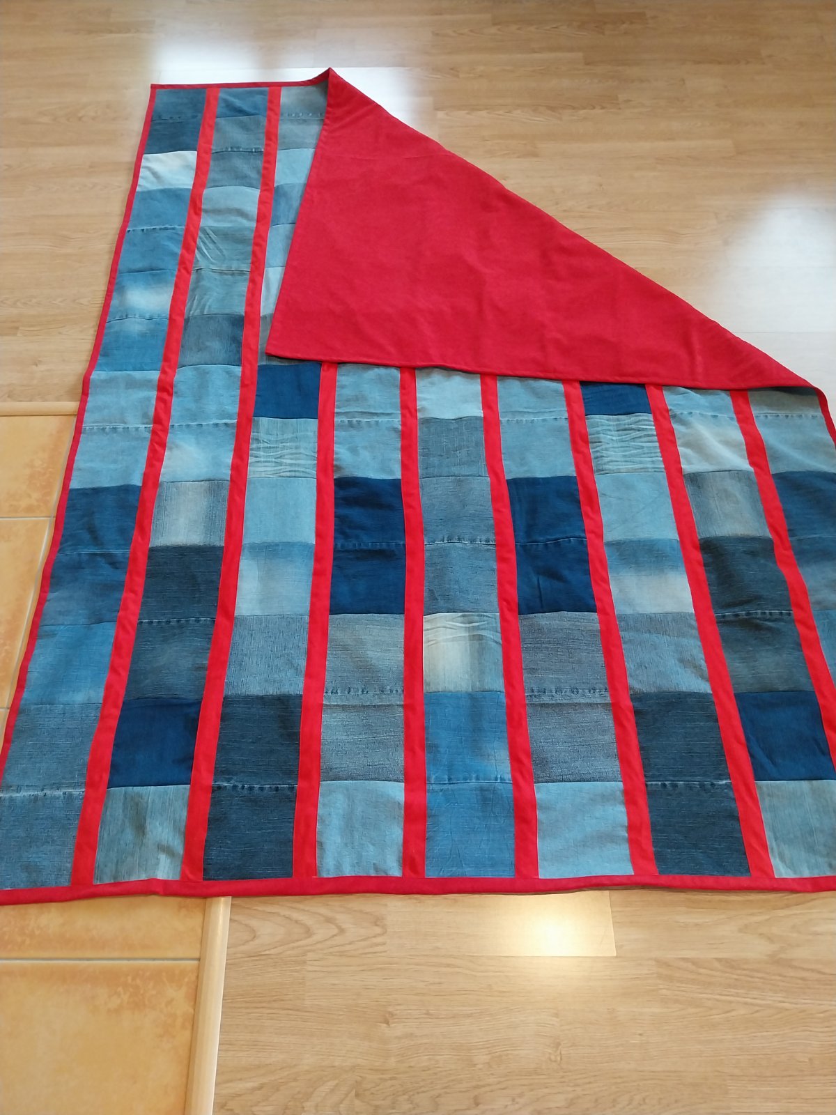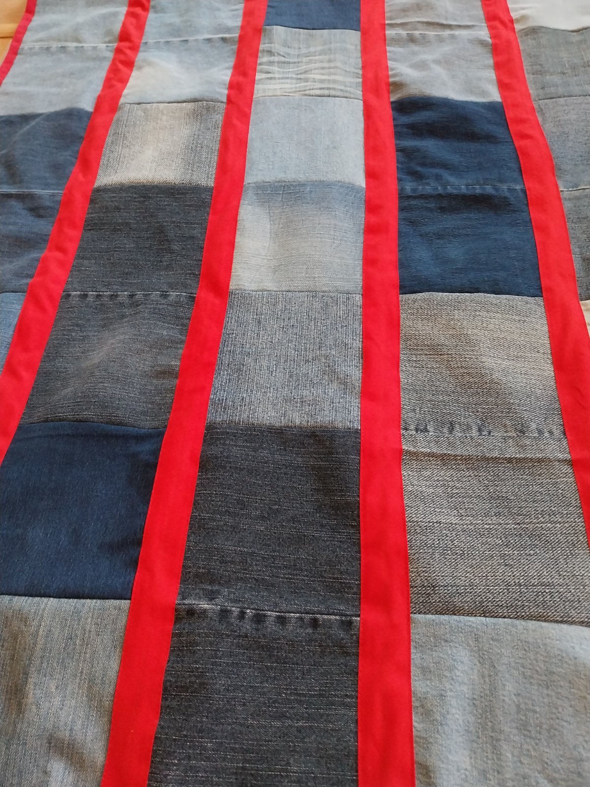 Pedantne ušitý prehoz na posteľ (jedno lôžko) z riflových štvorcov a podšité červenou nekrčivou látkou.