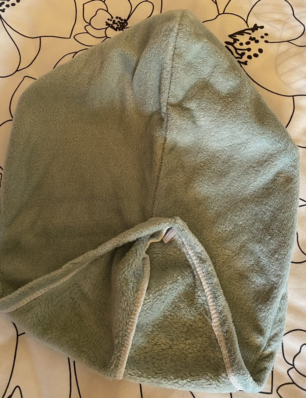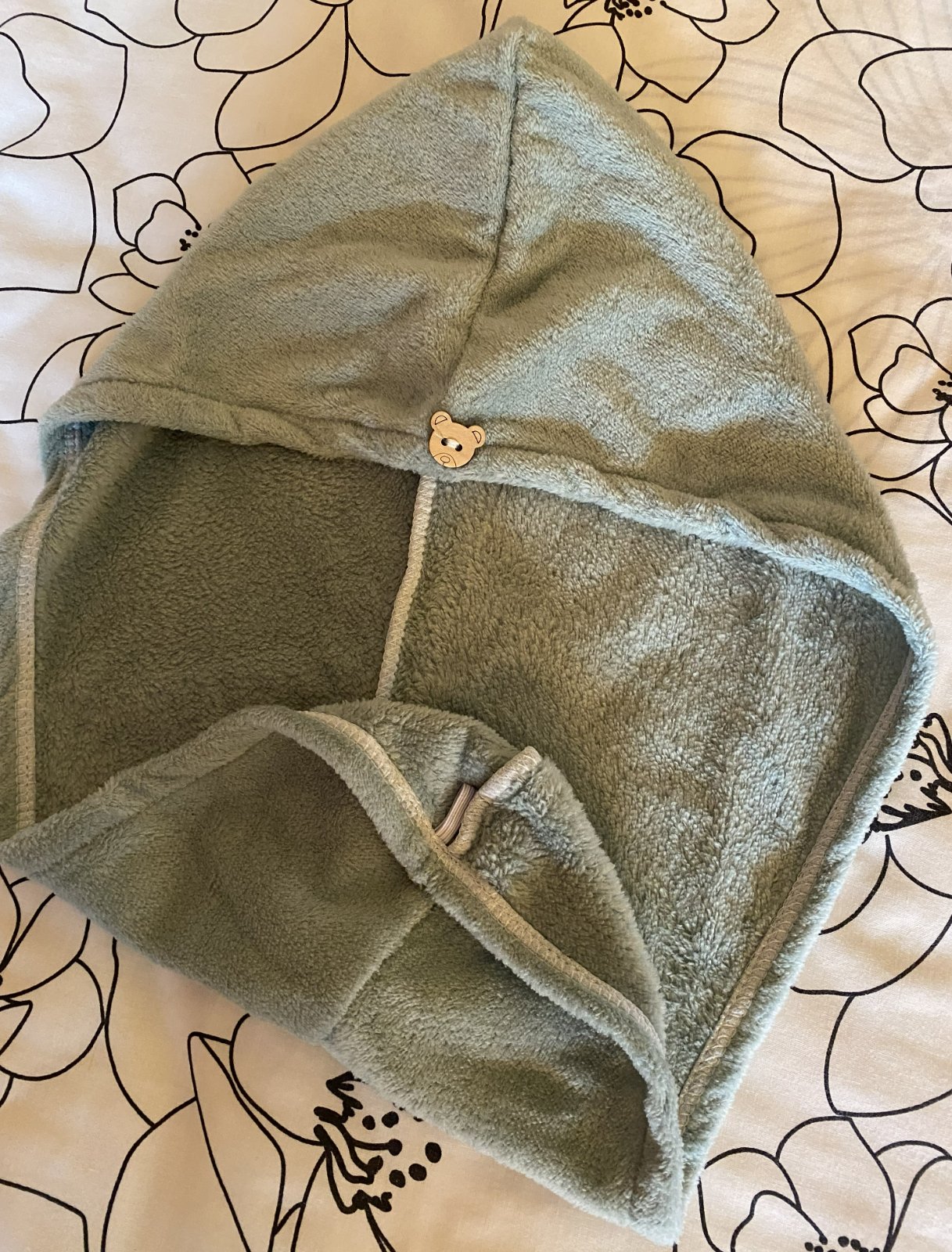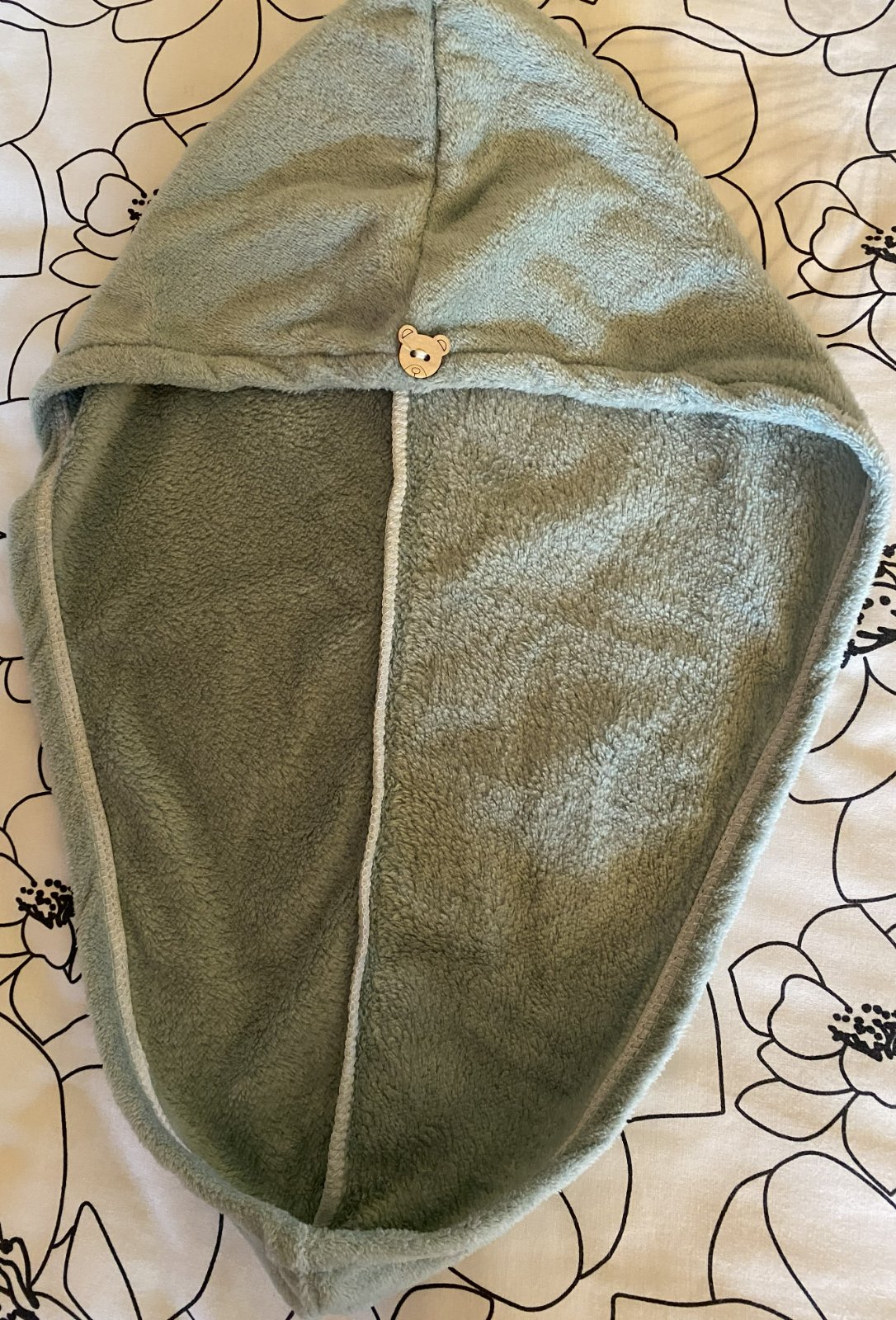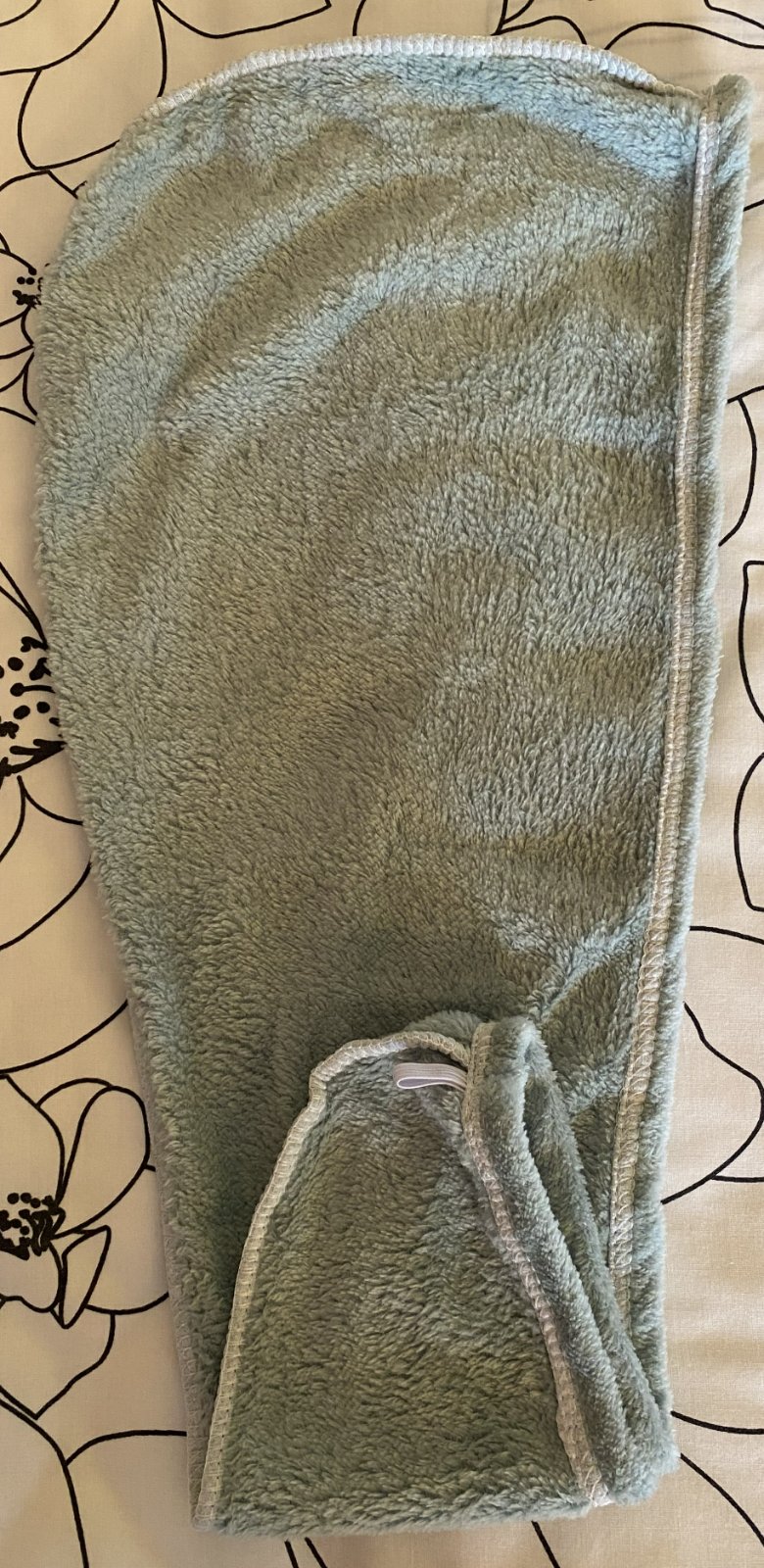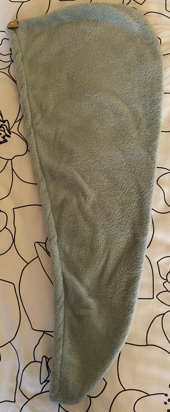 Vďaka gombíku a elastickej páske možno uterák ľahko zrolovať a upevniť okolo hlavy, čo je pohodlné pri sušení alebo iných činnostiach.
