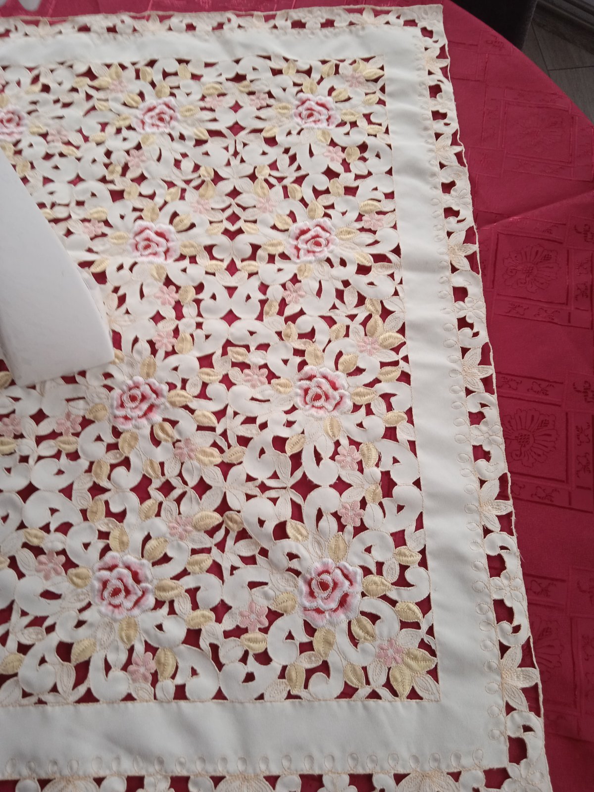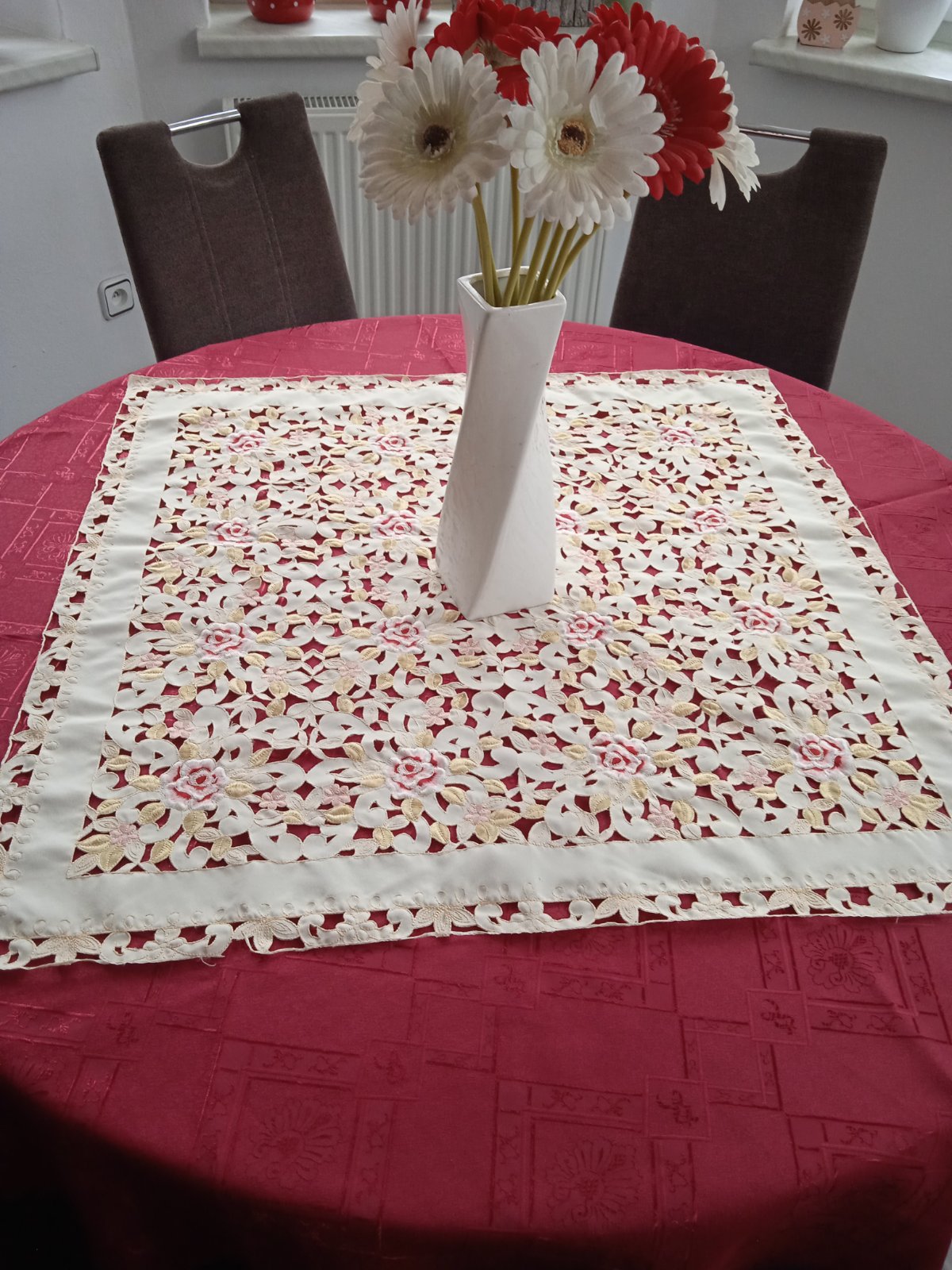 krásny obrus, v naleznom stave, skrobenim a zehlenim si ho treba vyrovnať, 64*64,drobulinke chybičky pofotene, druhy darujem k nemu je na nom mala viditeľnejsia škvrna, urcite este poslúži 67*38