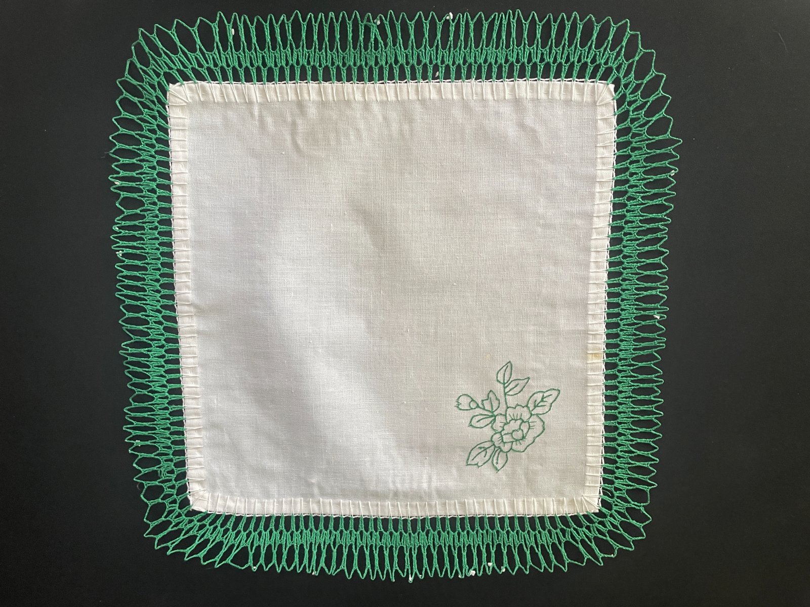 Dečka menší štvorec 44x44cm so zeleným lemom lemom (4cm), malé fliačiky viď foto. Poštovné podľa cenníka pošty.
